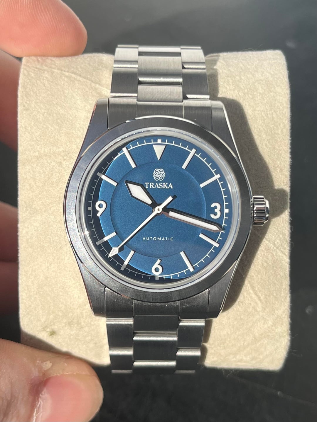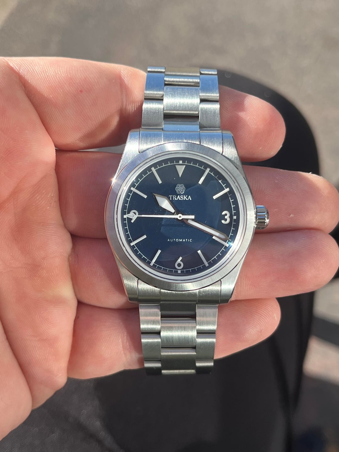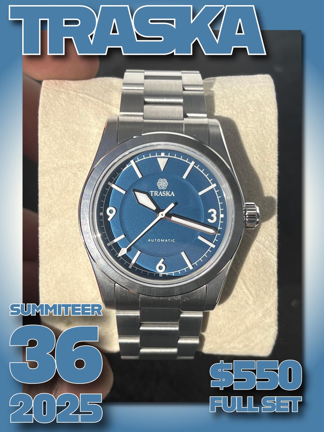 Traska Summiteer 36 Automatic FULL SET 2025 Model (newest) Case Diameter: 36mm Case Material: Stainless steel (hardened steel case and bracelet) Bezel: Fixed, smooth Crystal: Sapphire with anti-reflective coating Caseback: Screw-down WR: 100m Movement: Automatic (Miyota 9039) Functions: Hours, minutes, seconds Hacking: Yes Hand-Winding: Yes Dial: Matte blue Bracelet: Stainless steel, hardened, signed clasp Lug Width: 20mm Asking $550 CONUS OBO Discounts for local customers PM for all inquiries Based in Arkansas, USA