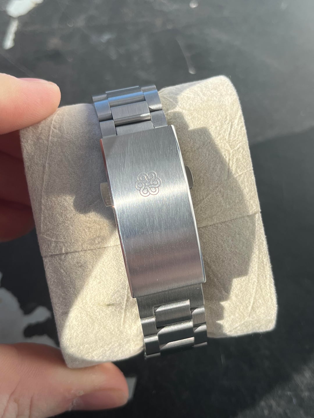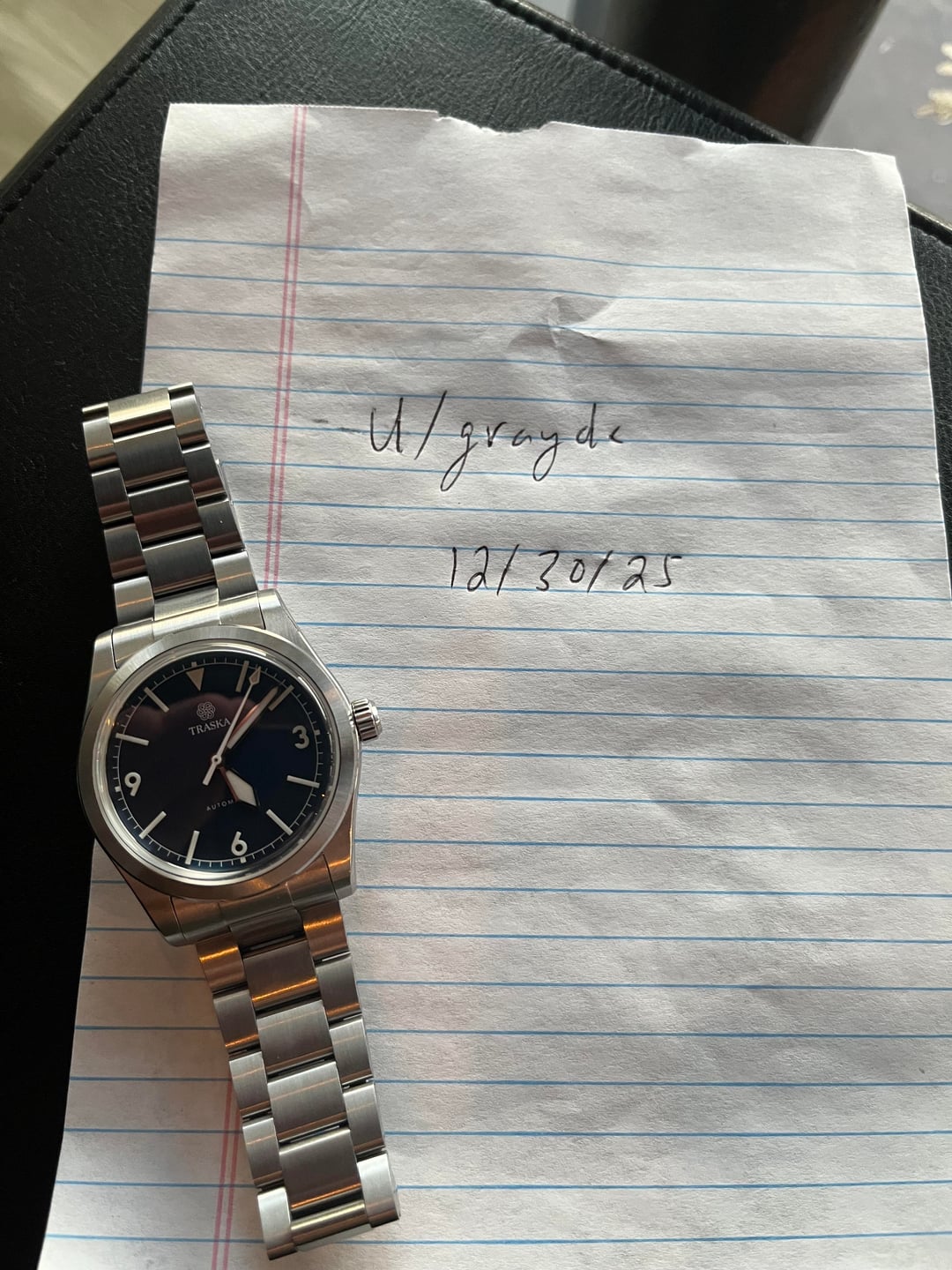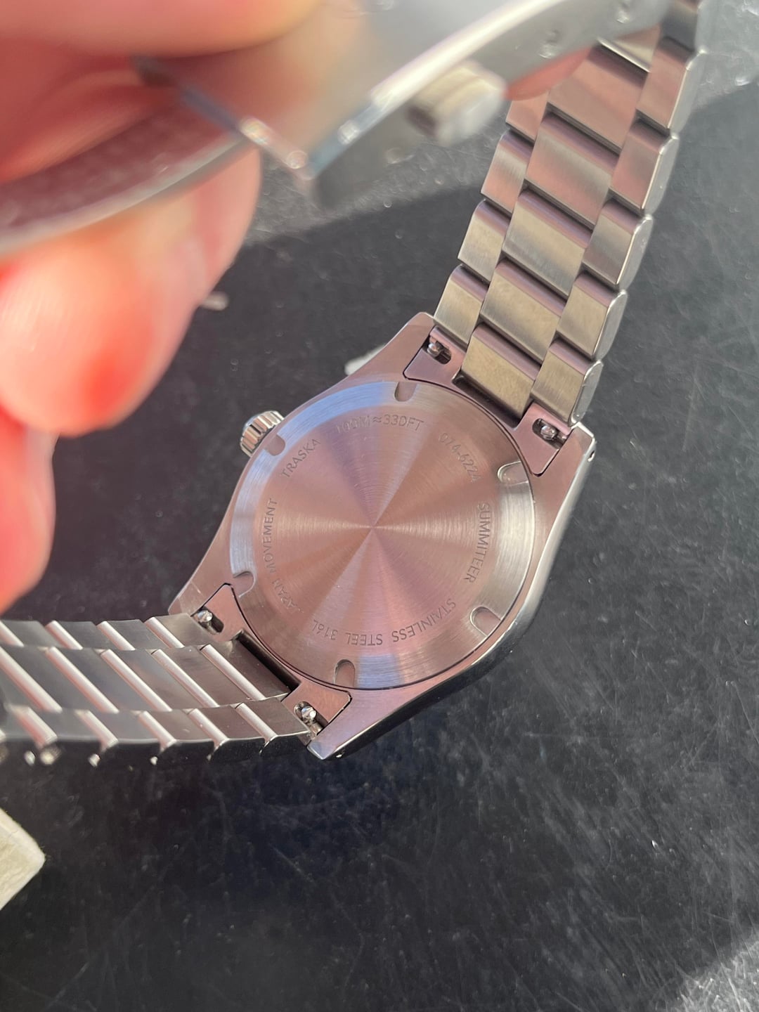 Traska Summiteer 36 Automatic FULL SET 2025 Model (newest) Case Diameter: 36mm Case Material: Stainless steel (hardened steel case and bracelet) Bezel: Fixed, smooth Crystal: Sapphire with anti-reflective coating Caseback: Screw-down WR: 100m Movement: Automatic (Miyota 9039) Functions: Hours, minutes, seconds Hacking: Yes Hand-Winding: Yes Dial: Matte blue Bracelet: Stainless steel, hardened, signed clasp Lug Width: 20mm Asking $550 CONUS OBO Discounts for local customers PM for all inquiries Based in Arkansas, USA