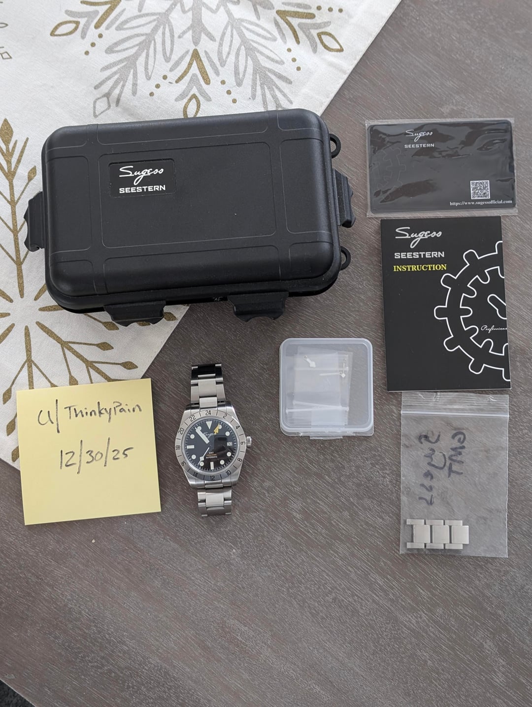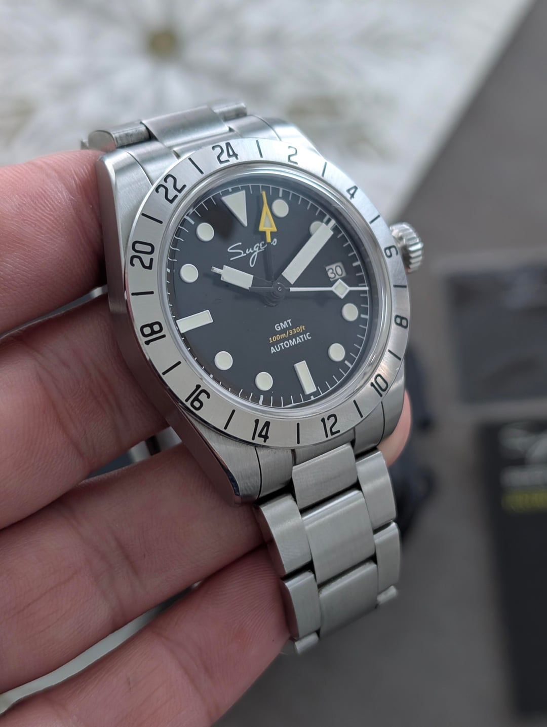 Hello! Up for sale is my daily diver and lovely Sugess BB GMT which has the NH34 inside. I am selling it and a Borealis Sea Storm (message me for a deal for both) to fund a new addition to my collection. This watch is a homage to the Black Bay Pro with the cyclops removed (still sapphire) and the "Sinn-style" hands added. The original "BB-style" hands are included, but I fell in love with this modification. Asking $150 shipping in the CONUS. PayPay FF or GS (you pay the fees), Venmo, Zelle are accepted. I have a few transactions here but please let me know if you want more photos or have any questions. Specs: Series: BB GMT Model: S463.02 Quick Stats: Sapphire Crystal, 100M Meters Water Resistant, Date Indicator, BGW9 Lume, Slide Lock Buckle, High Performance Satin Finish Diameter: 40mm Thickness: 12.2mm Lug to Lug: 48mm Lug Width: 20mm Glass Material: Sapphire Crystal Case Material: 316L Stainless Steel Band: 316L Stainless Steel Band with Slide Lock Buckle Movement: Automatic winding Caliber: Seiko NH34 Jewels: 24 Vibration: 3 Hz (21,600 BPH) Power Reserve: 41 Hours Water Resistant: 10ATM (100 Meters)