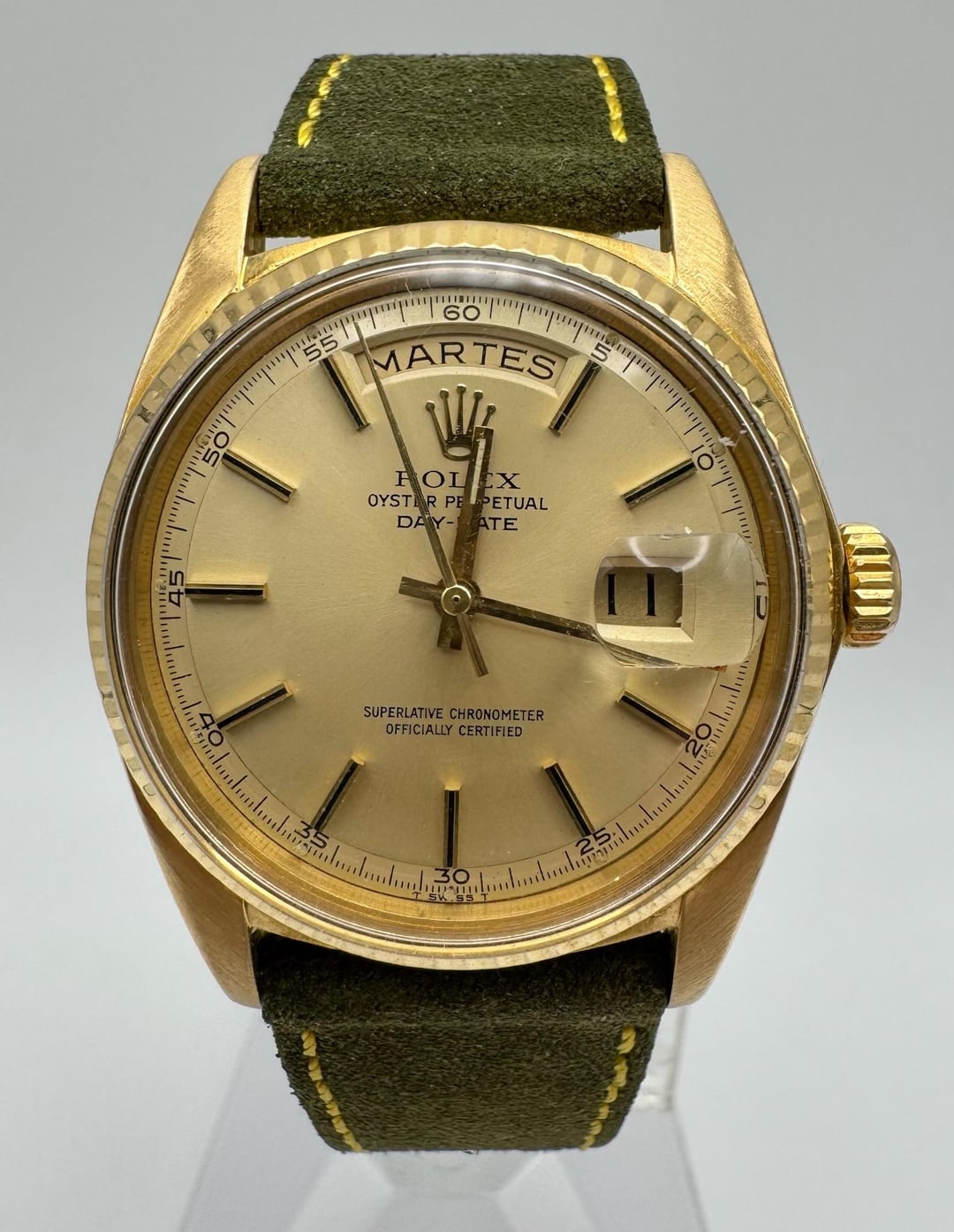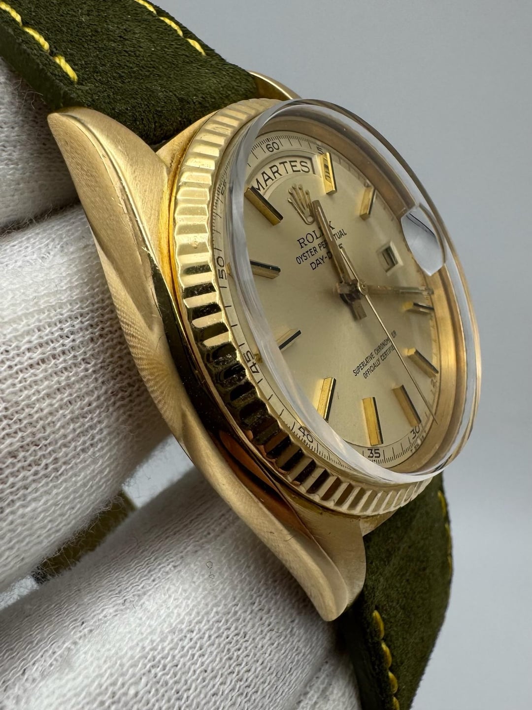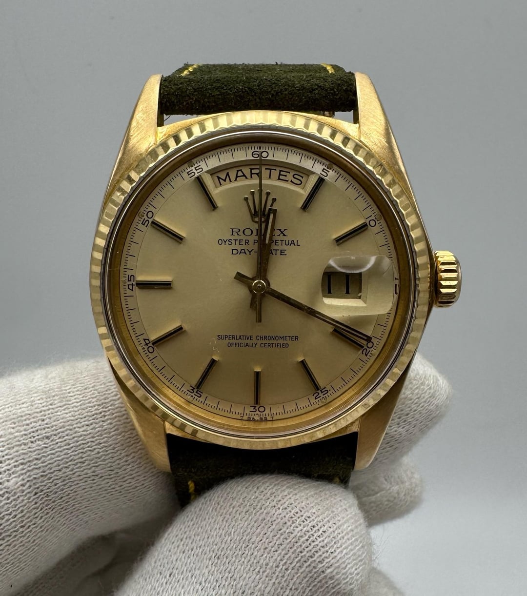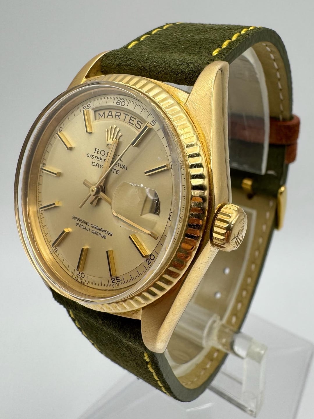 Rolex Day-Date 1803 18K Yellow Gold – A Distinguished Example of the Iconic Presidential This vintage Rolex Day-Date 1803 is presented in 18K yellow gold and remains in very nice overall condition. The case was polished in the past but retains sharp lugs and strong definition. Its original period-correct pie pan champagne dial is clean and well-preserved, showing only minimal signs of age. The movement has been checked and runs properly, with the last known service performed about a year ago by the previous owner. All reference and serial numbers are crisp and fully legible, with a serial in the 2.5 million range dating back to approximately 1968. This example is fitted with a new 20/16mm green suede leather strap paired with a gold-plated Rolex pin buckle, completing a refined and classic presentation of one of Rolex’s most celebrated models. **Reference:** 1803 **Size:** 36mm **Year:** 1968 📜 Includes: Custom [travel pouch](https://bogossia.com/products/travel-carrying-case) ($50+ value) 💵 Price: $8,000 + FREE overnight shipping with FedEx fully insured. [Timestamp](https://imgur.com/a/Wz5BEp3) 🔗 Other Listings: [profile](https://www.reddit.com/u/BoghossianJewelry/s/vm81HAdB7o) | [watchrecon](https://www.watchrecon.com/?query=BoghossianJewelry&last_days=0) 🔥 Follow us on [Instagram](https://www.instagram.com/bogossiajewelers) 📍 Location: New York 🔒 Authenticity: 100% guaranteed, buy with confidence. We have 160+ reviews on Chrono24 with 180+ transactions, and Excellent rating score on Trustpilot. Visit our [profile](https://www.reddit.com/u/BoghossianJewelry/s/vm81HAdB7o) for links and references. 📦 Domestic Shipping: Ships with FedEx overnight, within 24 business hours of payment, from New York, NY to CONUS. The shipment is fully insured against damage, loss or theft. 🌍 International Shipping: Incurs an additional $100. 💳 Payment: Crypto (+2%), PayPal/CC (+4%), Web, or Face-to-face deal in NY. 🔐 [Seller References](https://bogossia.com/authenticity) 📸 [IG: @bogossiajewelers](https://www.instagram.com/bogossiajewelers)