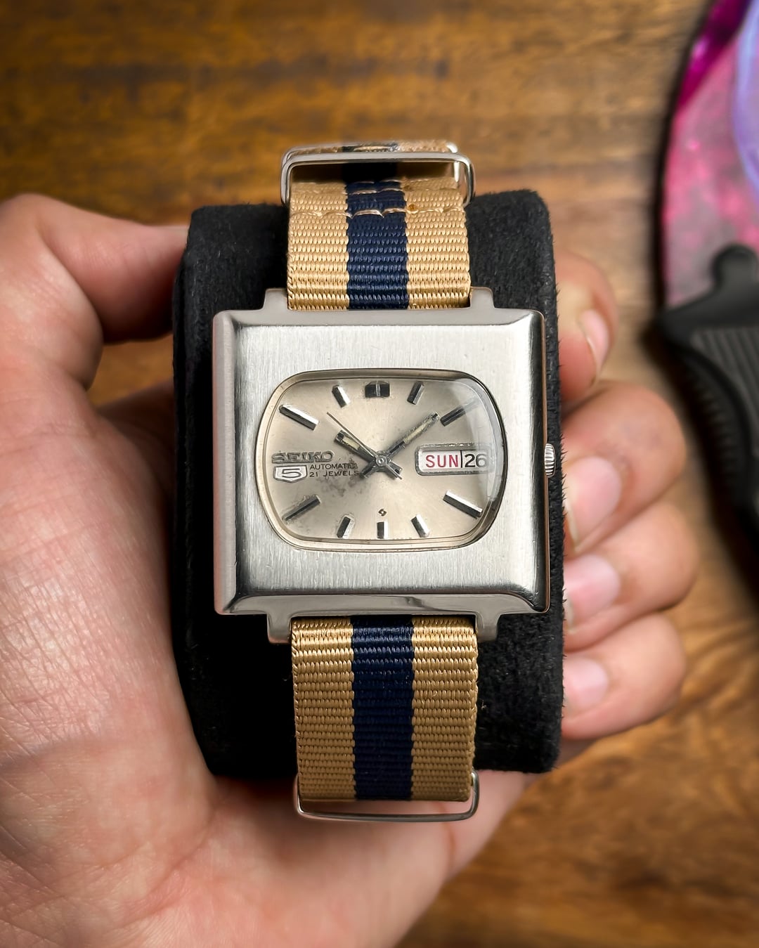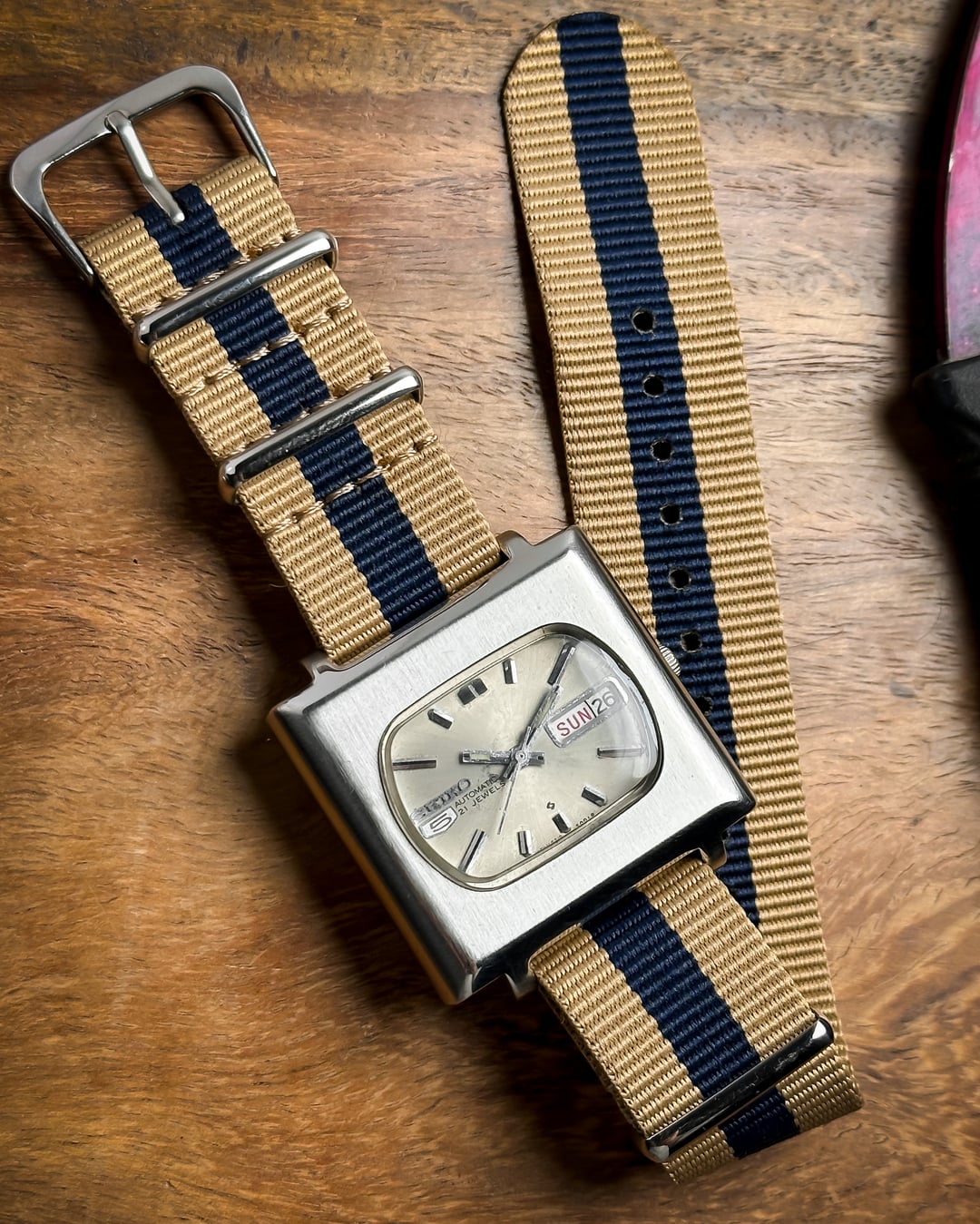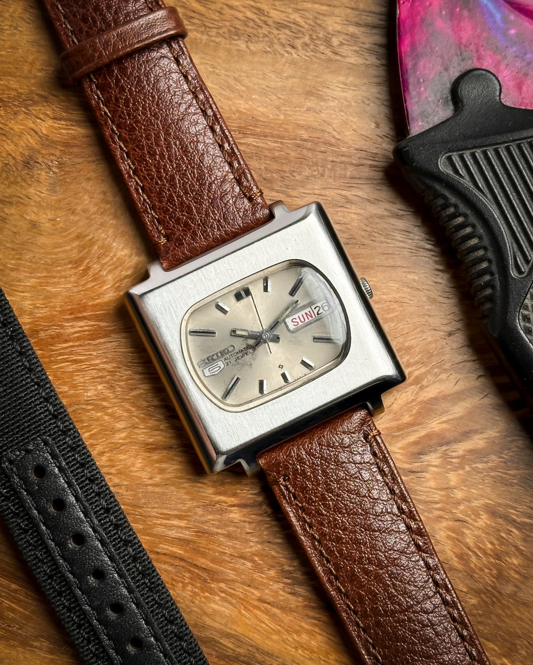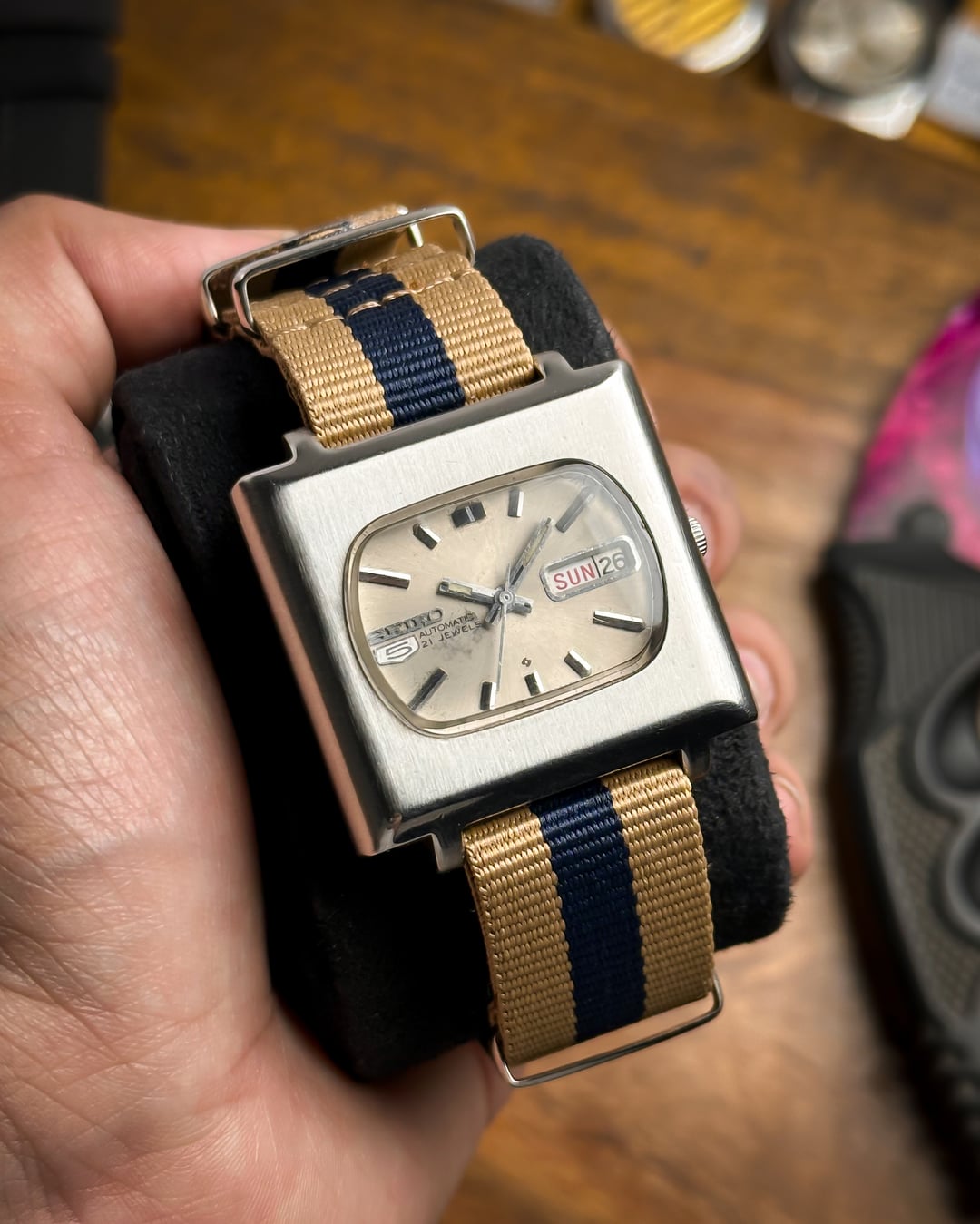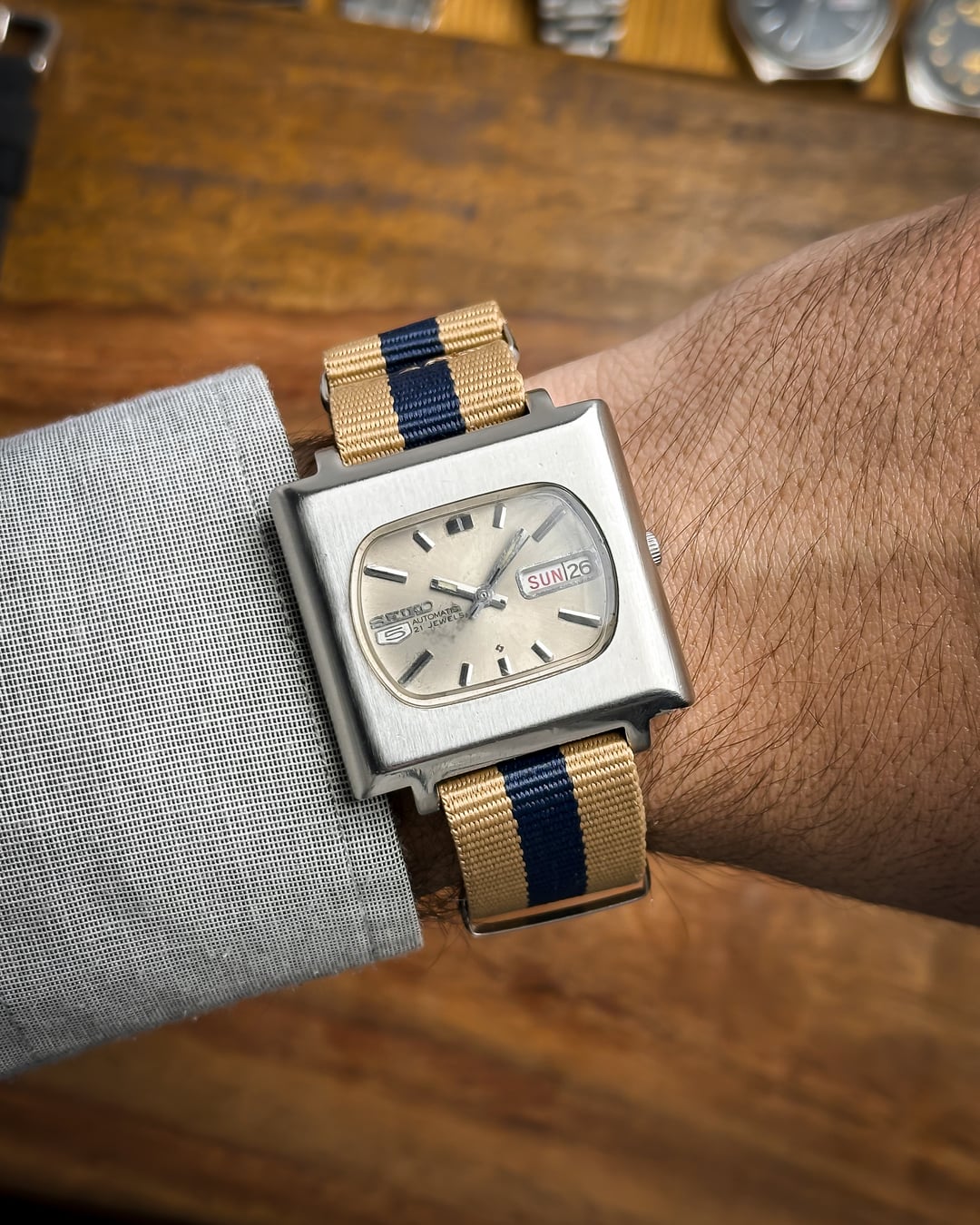 Hey Watchexchange! Today we’re going back to **January 1978** with this beautiful **Seiko 5 "TV Dial."** This watch is a masterclass in 70s industrial design, featuring a bold square case and a unique horizontal dial configuration that is rarely seen in the wild. The dial is a stunning **champagne sunburst** that has developed a **beautiful, honest patina** over the last 45+ years. This light aging adds a warm, "stardust" character to the sunburst finish, proving its untouched vintage authenticity. It features incredibly detailed indices, slanted from both sides with a sharp **black stripe running through the middle**, perfectly matched by the **baton hands**. The **square TV case** is a time capsule of 1978 design, retaining its sharp industrial lines. It features its **original plexiglass crystal**, which provides that desirable vintage "warmth" and slight edge-distortion that modern sapphire just can't replicate. Inside beats the **21-jewel automatic Caliber 6319**. This is a higher-spec relative of the legendary 6309 movement, offering extra jewels for reduced friction and a longer mechanical life. This watch is a total "strap monster" and comes with two distinct looks: 1. A **blue-striped cream NATO strap** for a sporty, weekend vibe. 2. A **brand new brown leather strap** for a sophisticated, retro-office look. **🔹 Key Dimensions** * **Case Width:** 36.5mm (without crown) * **Lug-to-Lug:** 40mm * **Thickness:** 10mm * **Lug Width:** 20mm 💵 **Price: $135 shipped!** 📦 **Payment: PayPal F&F** or G&S (**+4.5% fee by buyer**) or **bank wire (US banks accepted)** 📩 **DM me for more pics or a custom timestamp.** If you want a 70s icon with a rare dial configuration and a bulletproof movement, the **Maverick TV** is a standout choice. Follow my [**Instagram**](https://www.instagram.com/everistwatches/) and **Reddit profile** for more **vintage drops**.
