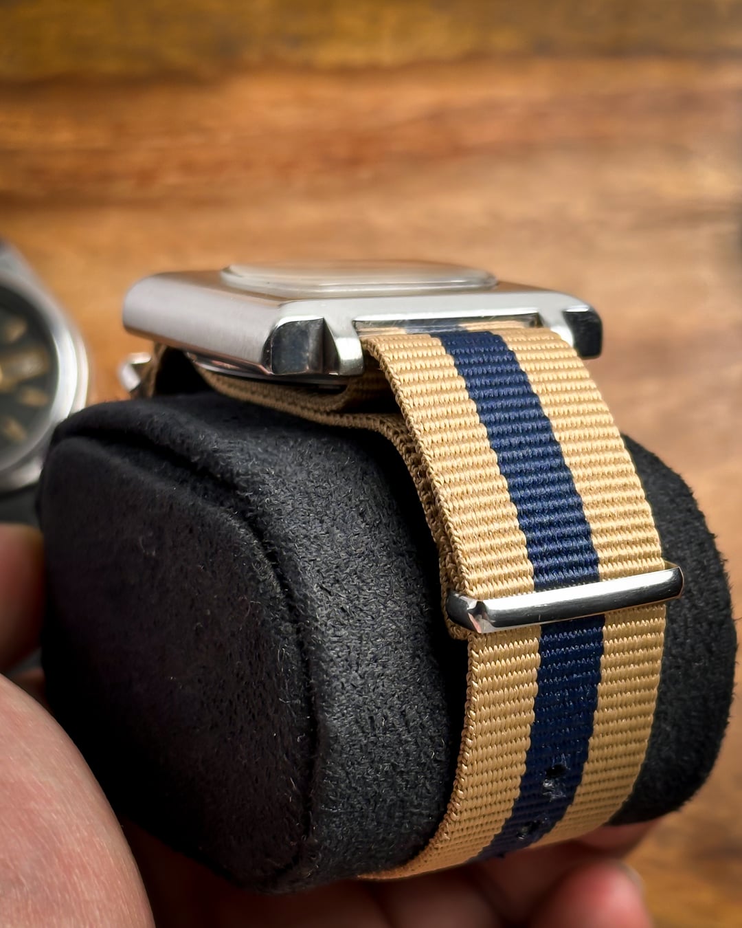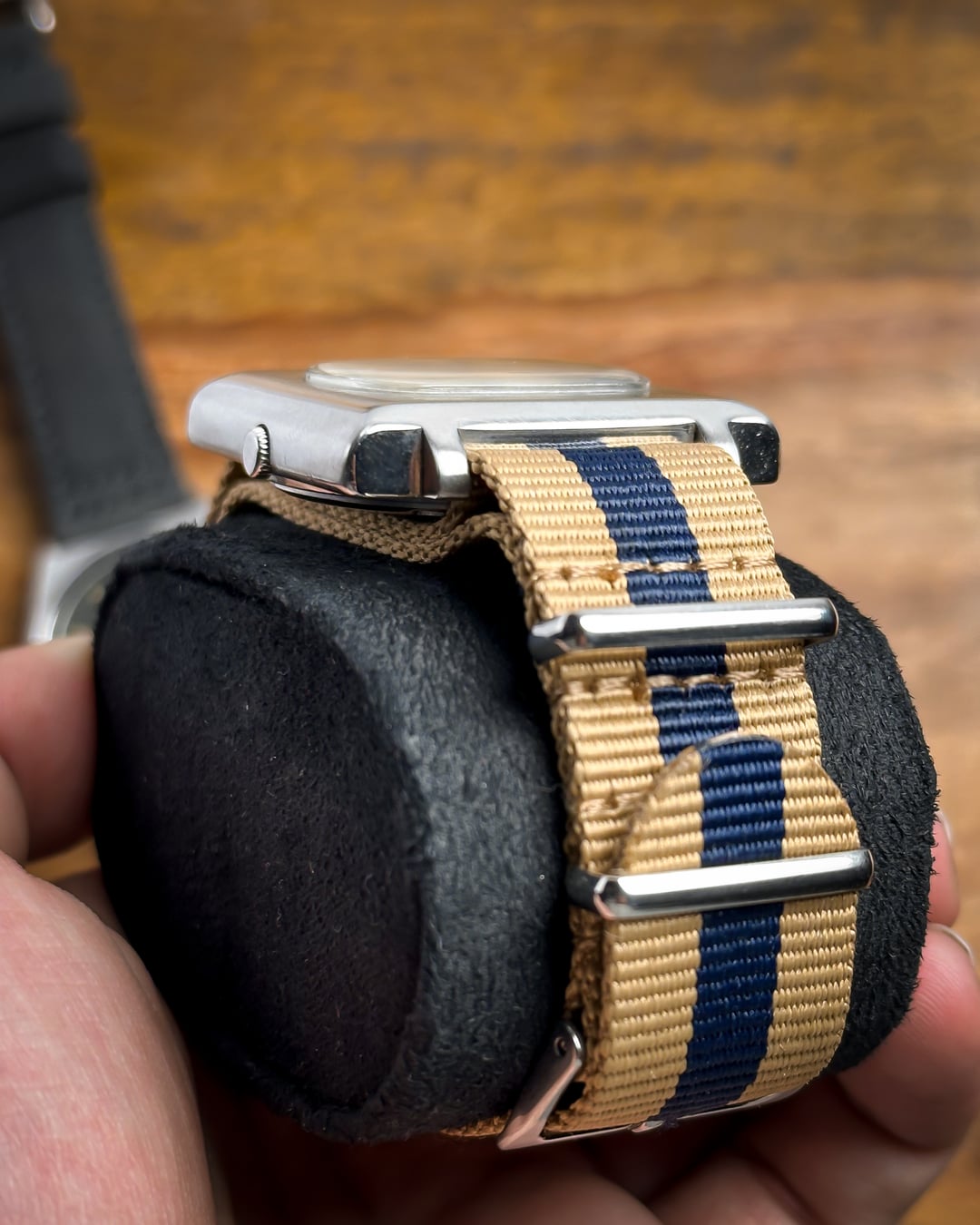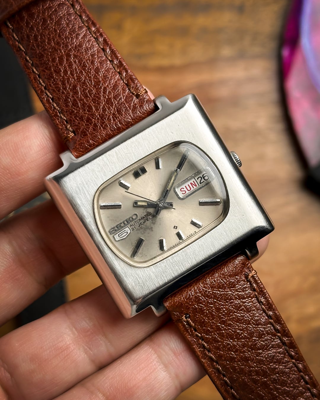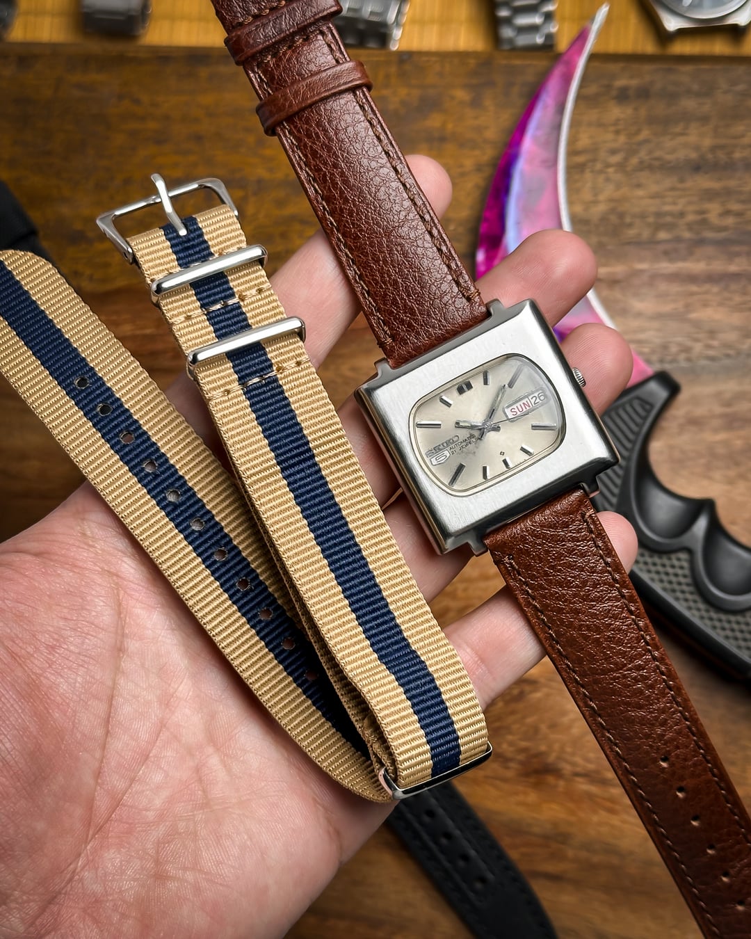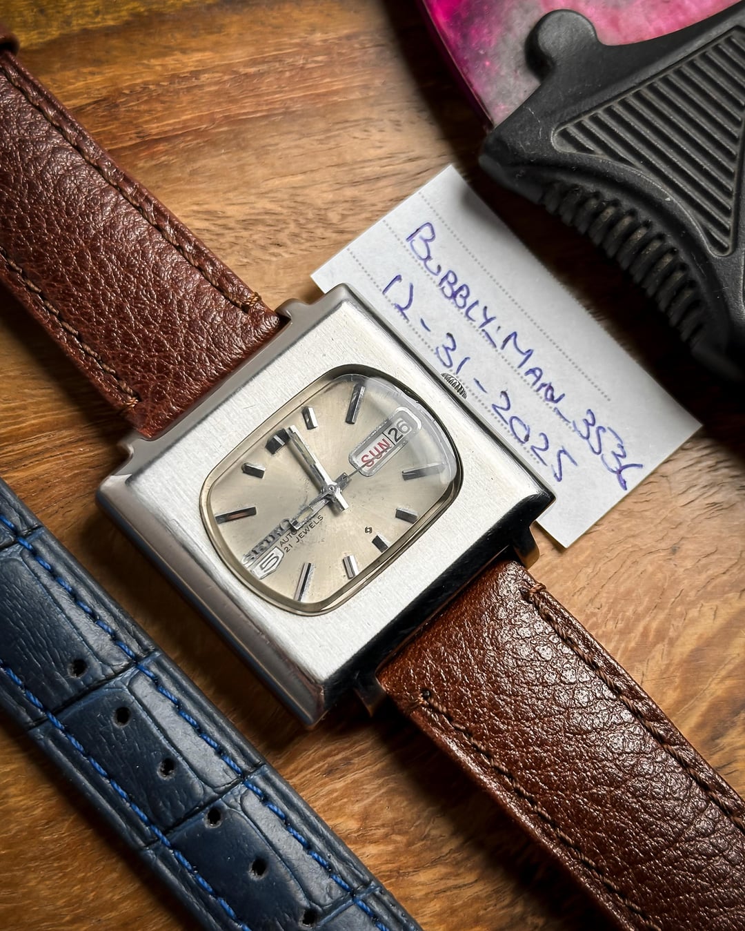 Hey Watchexchange! Today we’re going back to **January 1978** with this beautiful **Seiko 5 "TV Dial."** This watch is a masterclass in 70s industrial design, featuring a bold square case and a unique horizontal dial configuration that is rarely seen in the wild. The dial is a stunning **champagne sunburst** that has developed a **beautiful, honest patina** over the last 45+ years. This light aging adds a warm, "stardust" character to the sunburst finish, proving its untouched vintage authenticity. It features incredibly detailed indices, slanted from both sides with a sharp **black stripe running through the middle**, perfectly matched by the **baton hands**. The **square TV case** is a time capsule of 1978 design, retaining its sharp industrial lines. It features its **original plexiglass crystal**, which provides that desirable vintage "warmth" and slight edge-distortion that modern sapphire just can't replicate. Inside beats the **21-jewel automatic Caliber 6319**. This is a higher-spec relative of the legendary 6309 movement, offering extra jewels for reduced friction and a longer mechanical life. This watch is a total "strap monster" and comes with two distinct looks: 1. A **blue-striped cream NATO strap** for a sporty, weekend vibe. 2. A **brand new brown leather strap** for a sophisticated, retro-office look. **🔹 Key Dimensions** * **Case Width:** 36.5mm (without crown) * **Lug-to-Lug:** 40mm * **Thickness:** 10mm * **Lug Width:** 20mm 💵 **Price: $135 shipped!** 📦 **Payment: PayPal F&F** or G&S (**+4.5% fee by buyer**) or **bank wire (US banks accepted)** 📩 **DM me for more pics or a custom timestamp.** If you want a 70s icon with a rare dial configuration and a bulletproof movement, the **Maverick TV** is a standout choice. Follow my [**Instagram**](https://www.instagram.com/everistwatches/) and **Reddit profile** for more **vintage drops**.