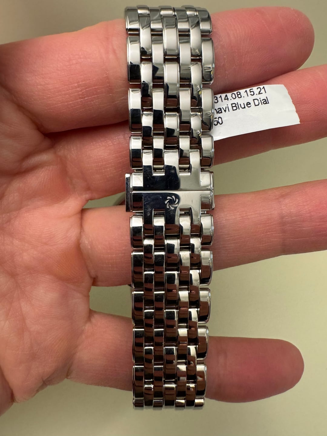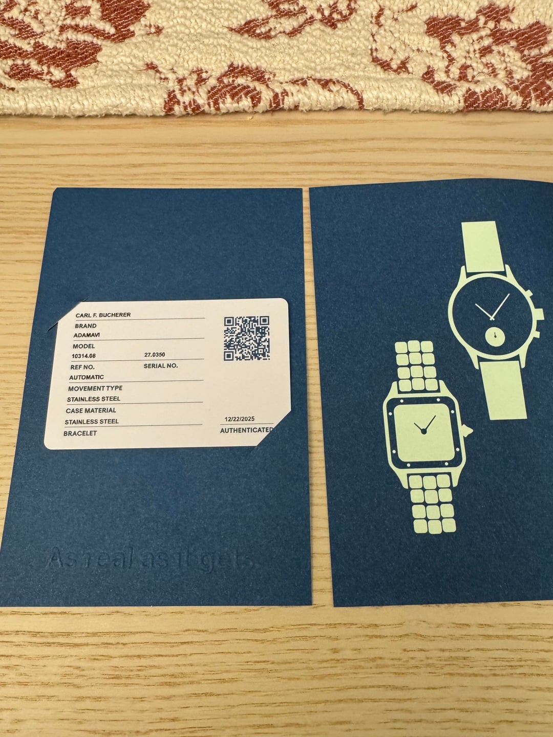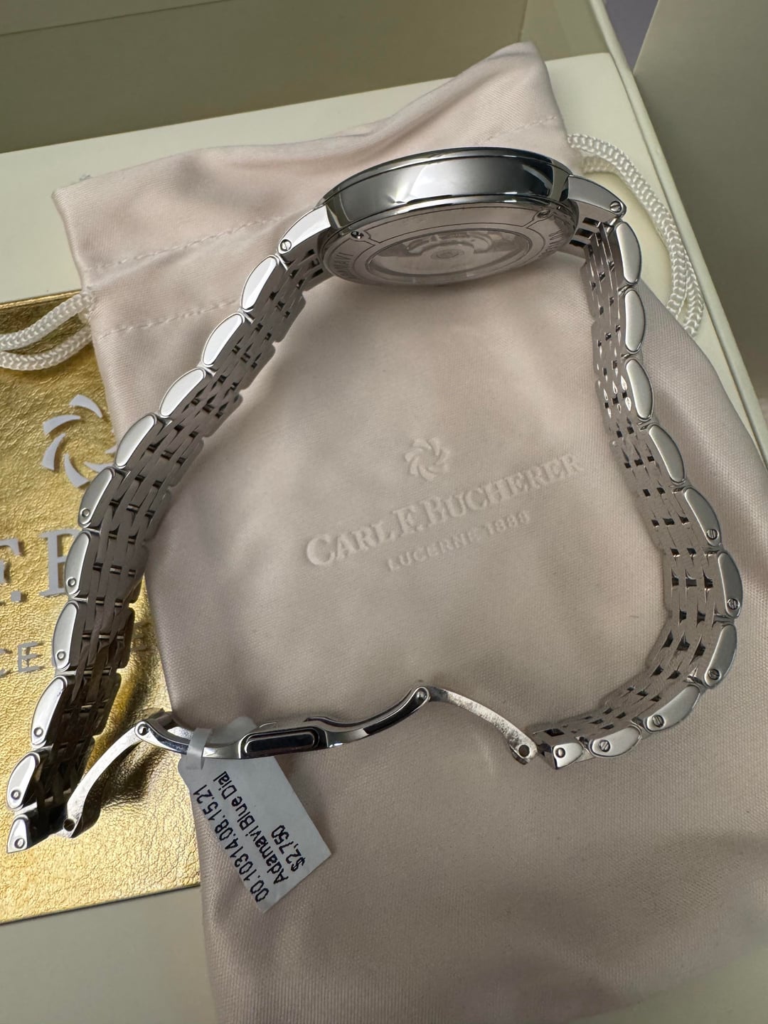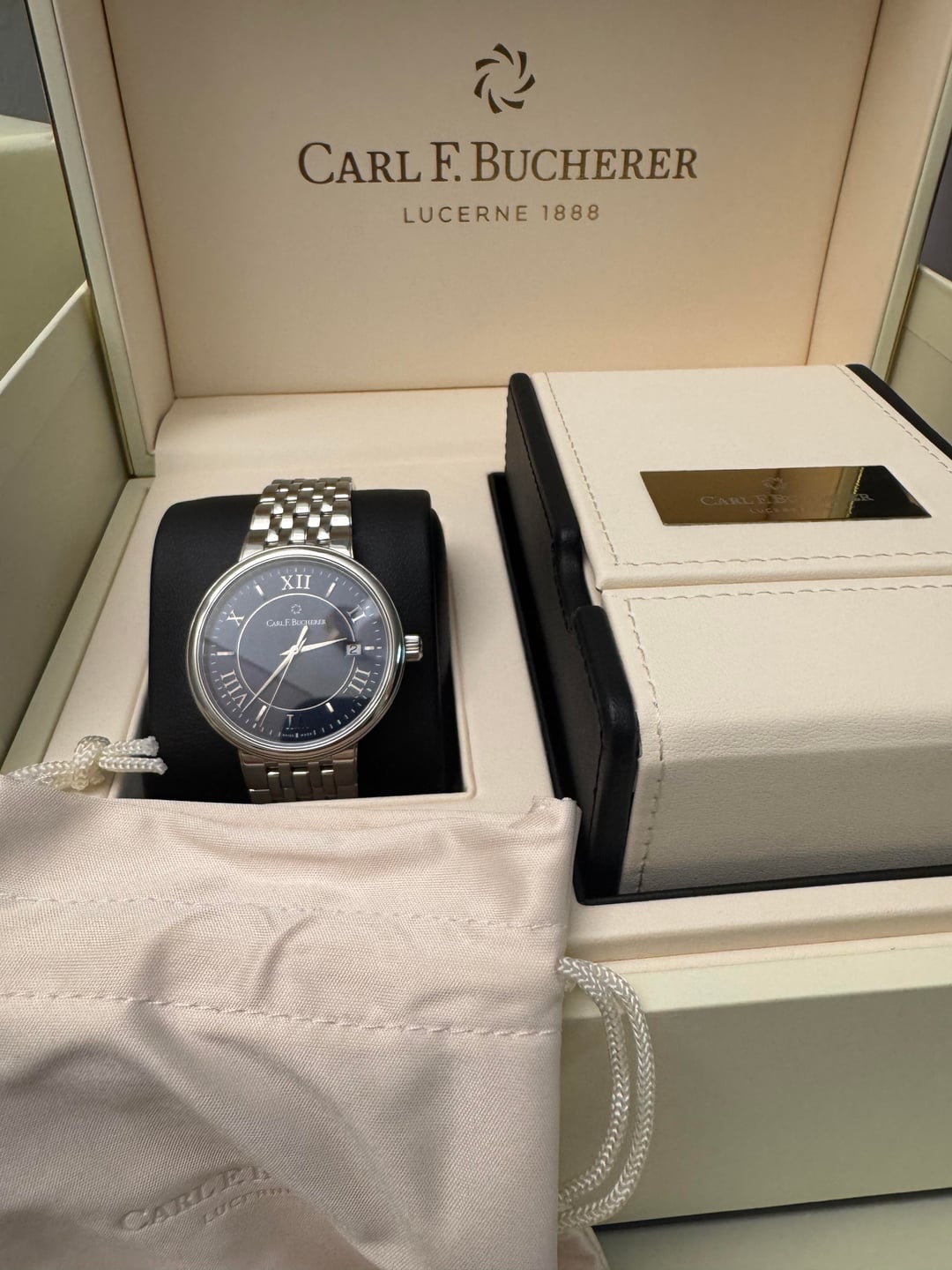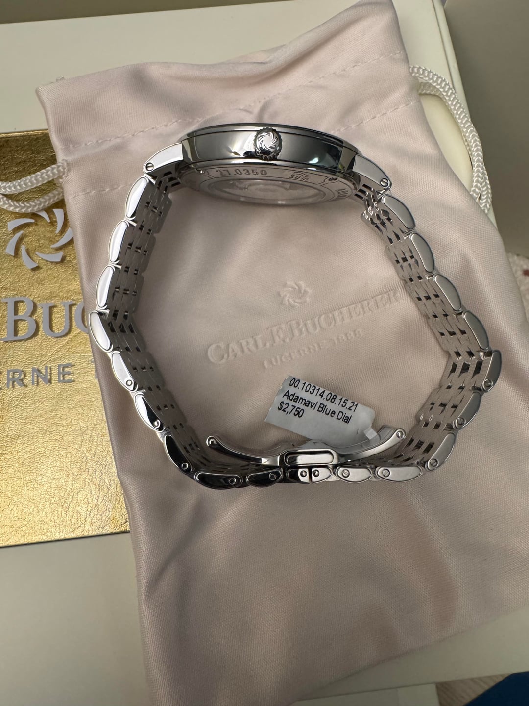 [Timestamp+Album](https://imgur.com/a/t91CMye) Hey everyone, feel free to reach out if you have any questions. This is a Carl F. Bucherer Adamavi Automatic with a blue dial in a 39mm case—a versatile size that works for everyday wear but can easily go dressy when you need it to. The design is simple, clean, and elegant without being flashy. The movement inside isn’t just functional—it’s nicely decorated with perlage on the plates and heat-blued screws, the kind of finishing you normally see on much more expensive watches. The bracelet uses screws instead of pins, which is a small but nice detail. This watch punches way above its weight, reflecting the same attention to detail Carl F. Bucherer uses on their much higher-end models. Will come with an official eBay Authentication card, confirming the watch has passed a rigorous multi-point inspection and is 100% authentic. Condition: • Like-new showroom condition with tags • Never worn and running perfectly • Very light handling marks, barely noticeable • Sapphire crystal is clean and scratch-free Details: • Brand: Carl F. Bucherer • Model: Adamavi Automatic • Reference: 00.10314.08.55.21 • Dial: Blue • Case Size: 39 mm • Movement: Swiss automatic • Crystal: Sapphire • Origin: Swiss-made Included: • Original Carl F. Bucherer wooden box • Leather travel case & pouch • Original hang tag (MSRP $2,750) . eBay Authentication card Price: $799 shipped USPS Priority— lowest priced for the blue dial variant (checked the whole net) Location: California — CONUS only