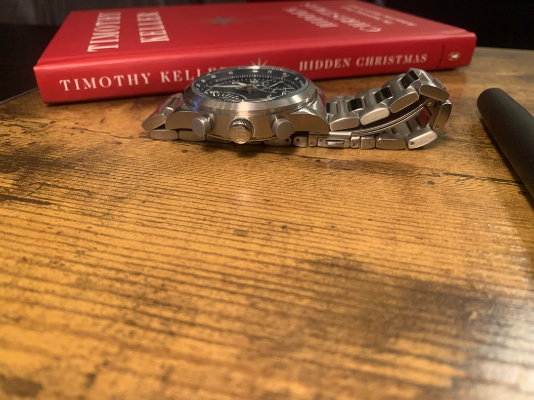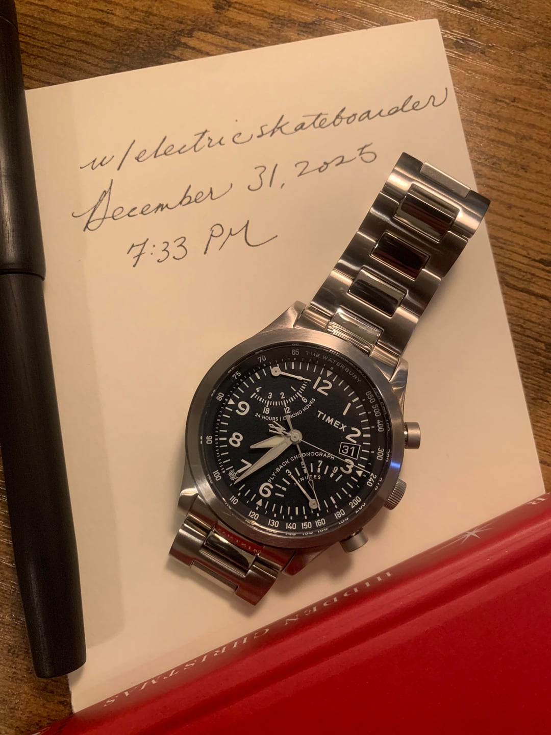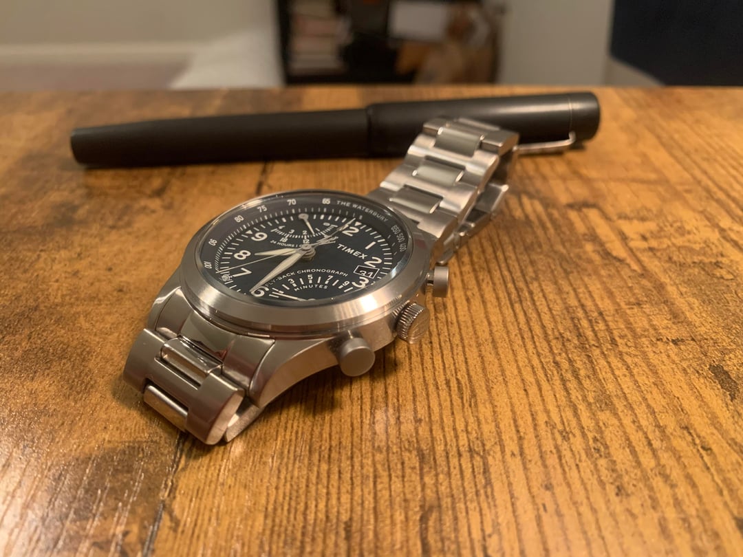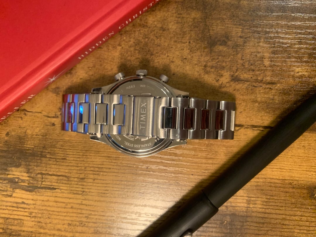 Hi there! For sale is my Timex Waterbury Traditional Fly Back Chronograph 43mm. I bought it as a Christmas gift to myself, and while it's a lovely tool watch, I've decided that it's not for me. There's some scuffs on the bracelet, but the case itself looks good. There are no scratches on the crystal that I can see, and overall, it's in great condition. I'm hoping it can go to a new home, and that the new owner can get a lot of enjoyment out of it. Thanks for reading - please don't hesitate to reach out with any questions!