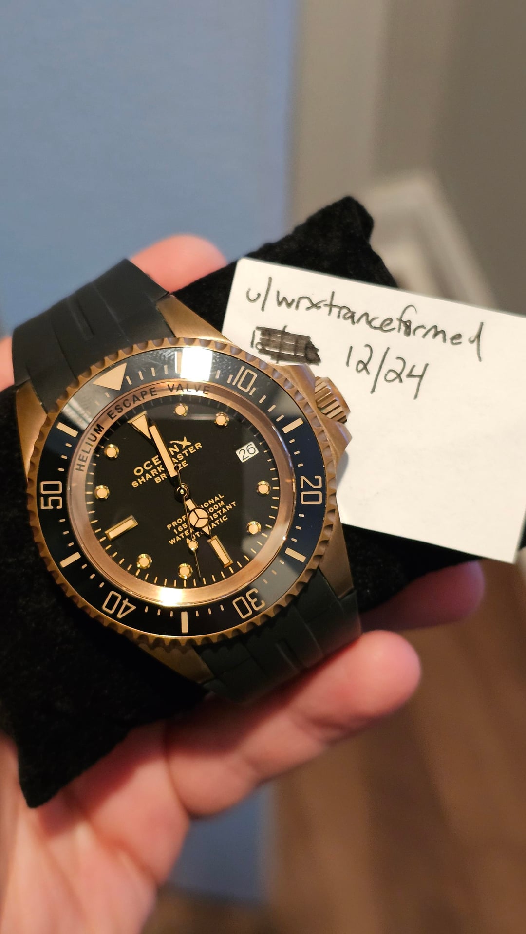 Hi folks! I have available yet another limited edition OceanX model, the Sharkmaster Bronze! This 44mm x 51.6mm x 15.6mm beast has an impressive 500M water resistance rating in part because of its screw down crown and helium release valve. It is powered by the reliable Seiko NH35 movement and the CuSn8 bronze case and buckle have developed a beautiful patina that can either be left by the new owner or chemically reset. The indices, chapter ring and handset share the same bronze color scheme and really set it off with an awesome vintage vibe. With a ceramic insert, this thing is ready for any adventure you throw at it. Condition wise I would put this at 97%. There are only a few very light marks on the case under very close inspection – the bronze patina hides any imperfections pretty well. There may be one or two tiny flaws in the anti reflective coating in the crystal, but that is really nitpicking. This thing looks nearly flawless on the wrist! The watch will come with its inner and outer boxes, a hang tag and manual with warranty card dated October 2019. Timestamp for Reddit: [https://preview.redd.it/wts-oceanx-sharkmaster-bronze-v0-k3hj6wuq0rag1.jpg?width=1080&crop=smart&auto=webp&s=6680ddc27861d2499be6a99f032b6c053a9c84e3](https://preview.redd.it/wts-oceanx-sharkmaster-bronze-v0-k3hj6wuq0rag1.jpg?width=1080&crop=smart&auto=webp&s=6680ddc27861d2499be6a99f032b6c053a9c84e3) I am asking $549 net to me which includes fully insured shipping to the US. Not interested in trades at this time, trade offers will be ignored. Please message me with any questions or interest and thanks for looking!
