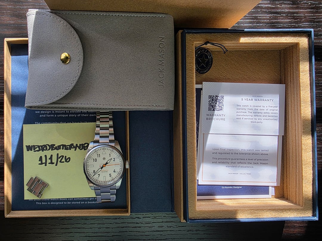 Up for sale is my Jack Mason Pursuit Pilot in Frost White. Full kit, purchased directly from Jack Mason. Had it maybe a month. Worn it twice around the house. Awesome watch, just have a huge collection, and not wearing it. This watch is in like-new condition. Its just missing the plastic wrap in order to be called new. Thats how perfect it is. Absolutely nothing wrong with it, and not a scratch anywhere on it. Can do a video call if needed. Selling for two hundred less than new directly from Jack Mason, but basically youre getting a new watch. Your gain, my loss. Price includes shipping to CONUS only. PayPal F&F, PayPal G&S (you cover fee) or Zelle. Price: $1200 NO TRADES. Link below to the watch for specs. [Jack Mason Pursuit Pilot Specs ](https://jackmasonbrand.com/products/pursuit-white)