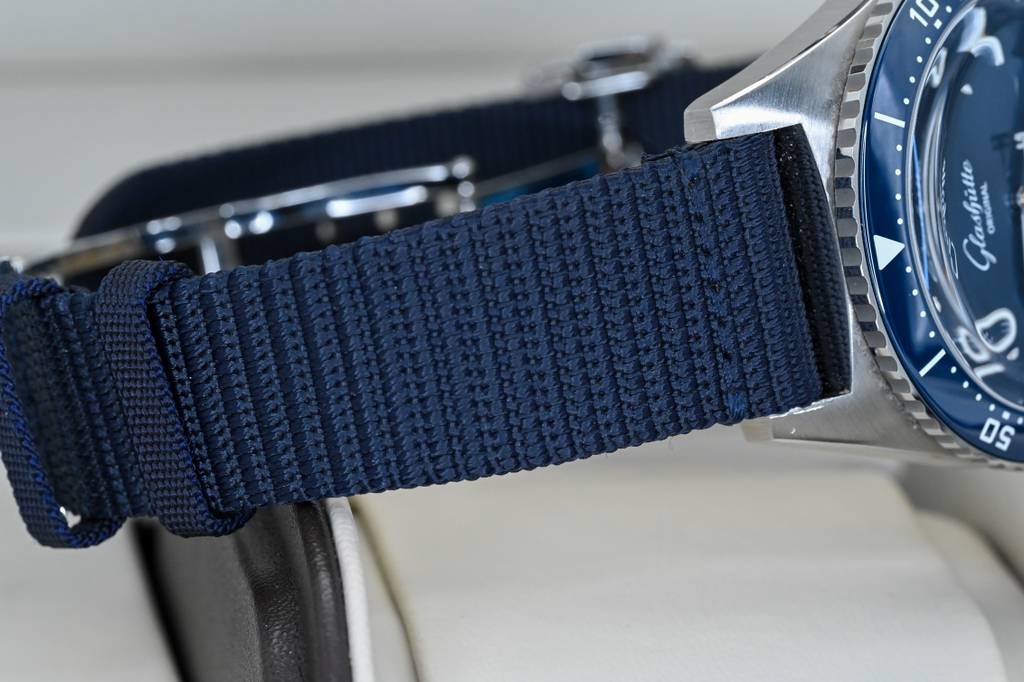 Glashutte Original SeaQ Panorama Date for sale. The SeaQ Panorama has been referred to as a "desk diver" or a luxury dive watch. It can perform under water or it can be worn at the office. Features a striking blue sunray dial paired with a blue ceramic bezel insert. Numerals, hour markers and hands are filled with Super-LumiNova are very legible in the dark. Case, bezel, dial, strap and clasp are in mint condition with virtually no signs of wear. Offer includes outer box, box, travel case, guarantee card, booklets, tag and extra orange nylon-mesh strap. Asking $7,200.