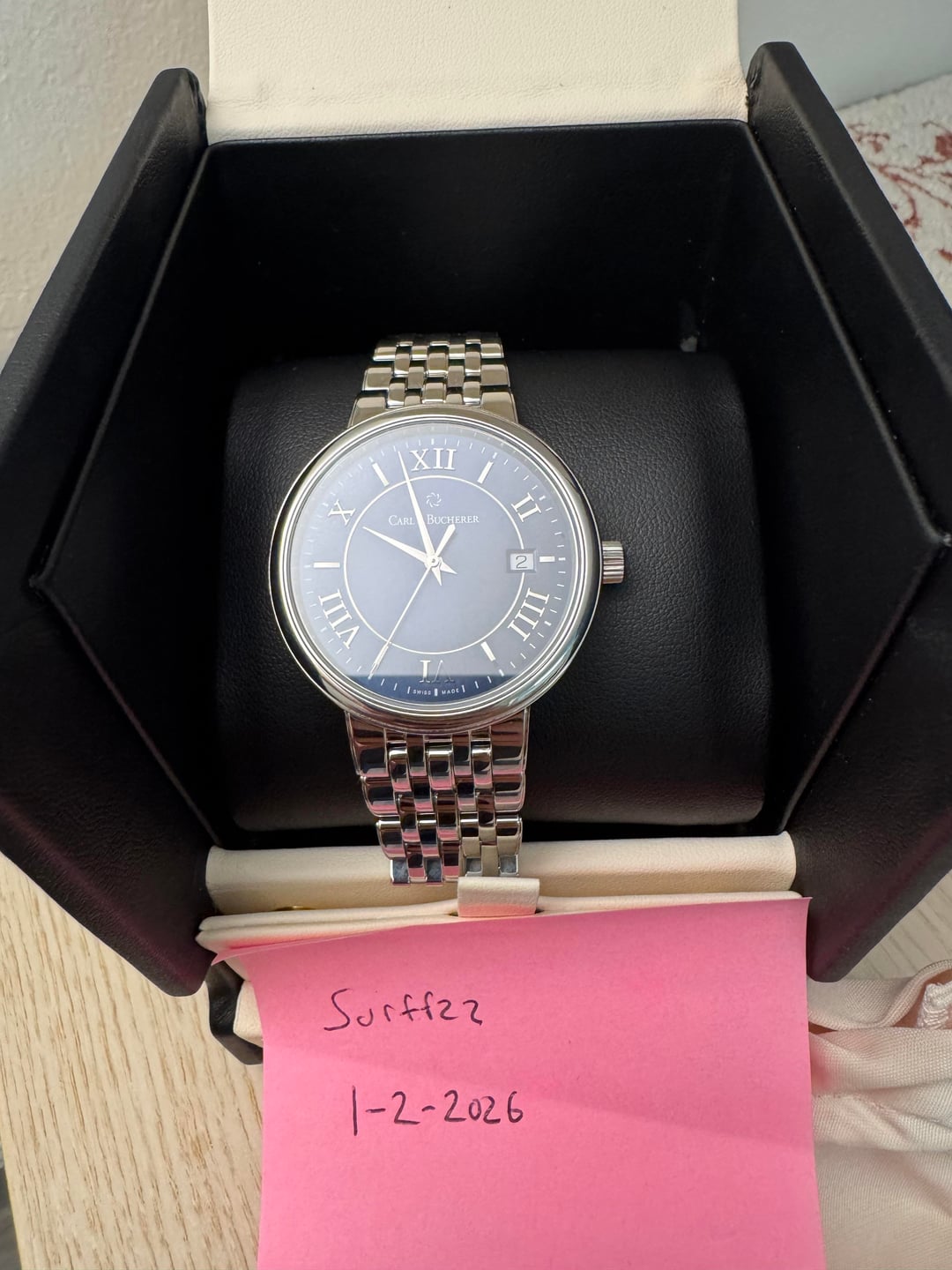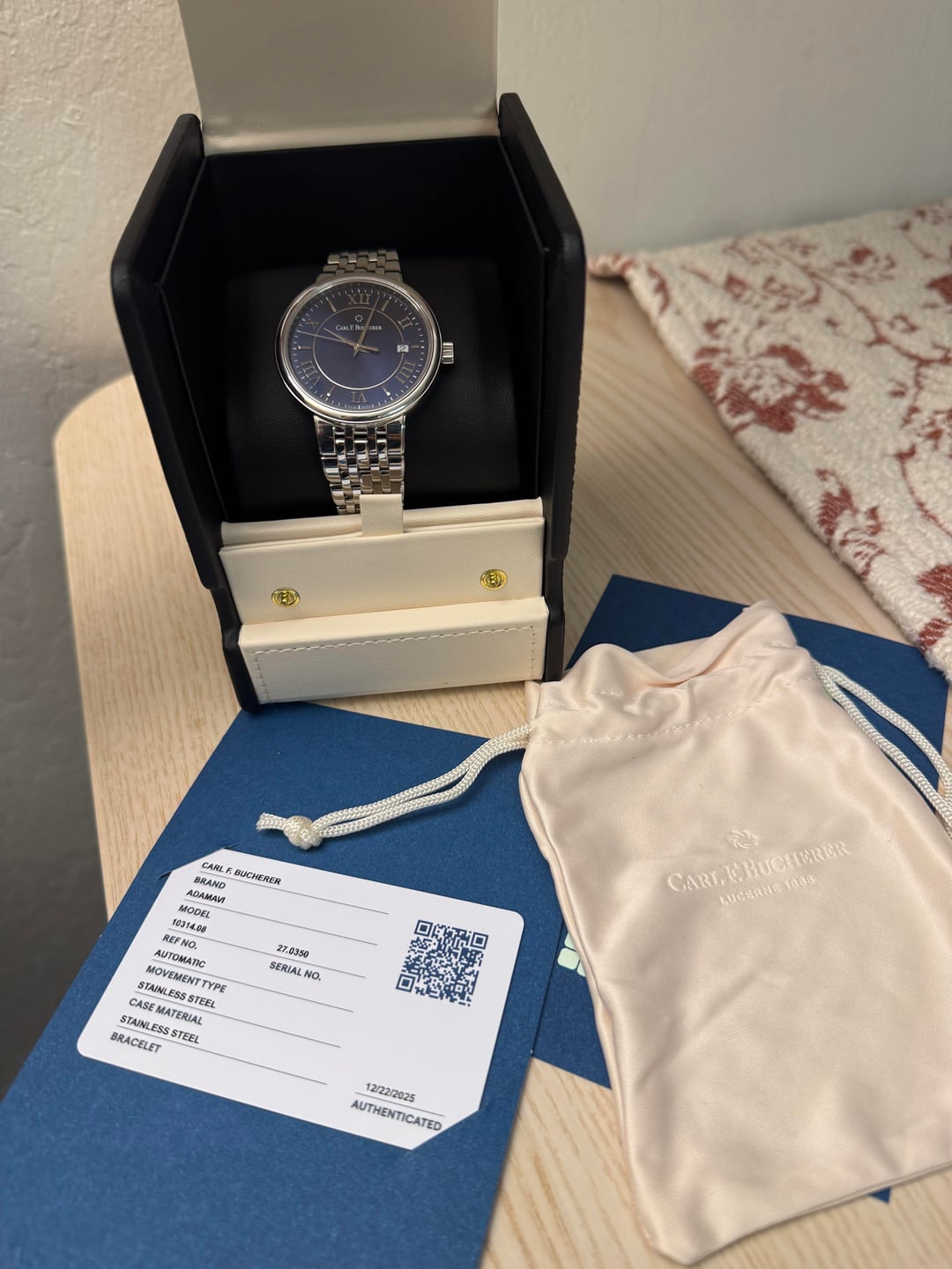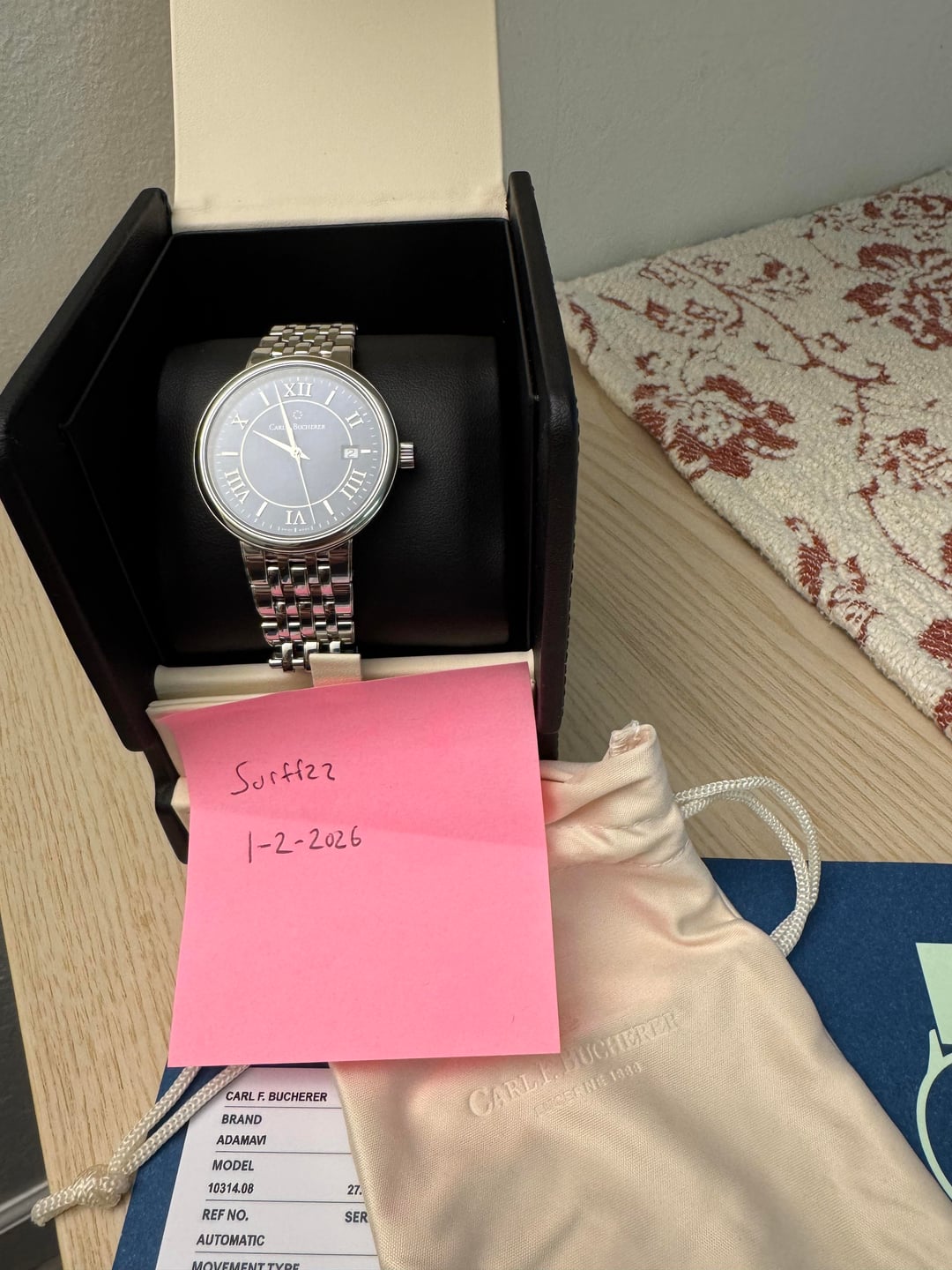 [Album+Time](https://imgur.com/a/ndLCvap) [Video](https://imgur.com/a/JeqmbUQ) Hey everyone — feel free to reach out if you have any questions. Up for sale is a Carl F. Bucherer Adamavi Automatic with a blue dial in a 39mm case. It’s a great all-around size that works well for daily wear but still looks sharp dressed up. The design is clean, classic, and understated. The movement is nicely finished with perlage and heat-blued screws, details you usually see on higher-priced watches. The bracelet uses screws instead of pins, which is a nice quality touch. Overall, this watch really punches above its weight and reflects the attention to detail CFB is known for. The watch will come with an official eBay Authentication card, confirming it passed inspection and is 100% authentic. Condition • Like-new showroom condition with tags • Never worn, running perfectly • Very light handling marks (barely noticeable) • Sapphire crystal is clean and scratch-free Details • Brand: Carl F. Bucherer • Model: Adamavi Automatic • Reference: 00.10314.08.55.21 • Dial: Blue • Case Size: 39mm • Movement: Swiss automatic • Crystal: Sapphire • Swiss made Included • Leather travel case & pouch • Original hang tag (MSRP $2,750) • eBay Authentication card Price $735 shipped — lowest priced blue dial available (checked thoroughly) Payment • PayPal Friends & Family • Zelle • Bank wire Shipping • USPS Priority • Signature required Location • California • CONUS only Notes I’ve sold multiple higher-end watches and can provide solid references if needed.