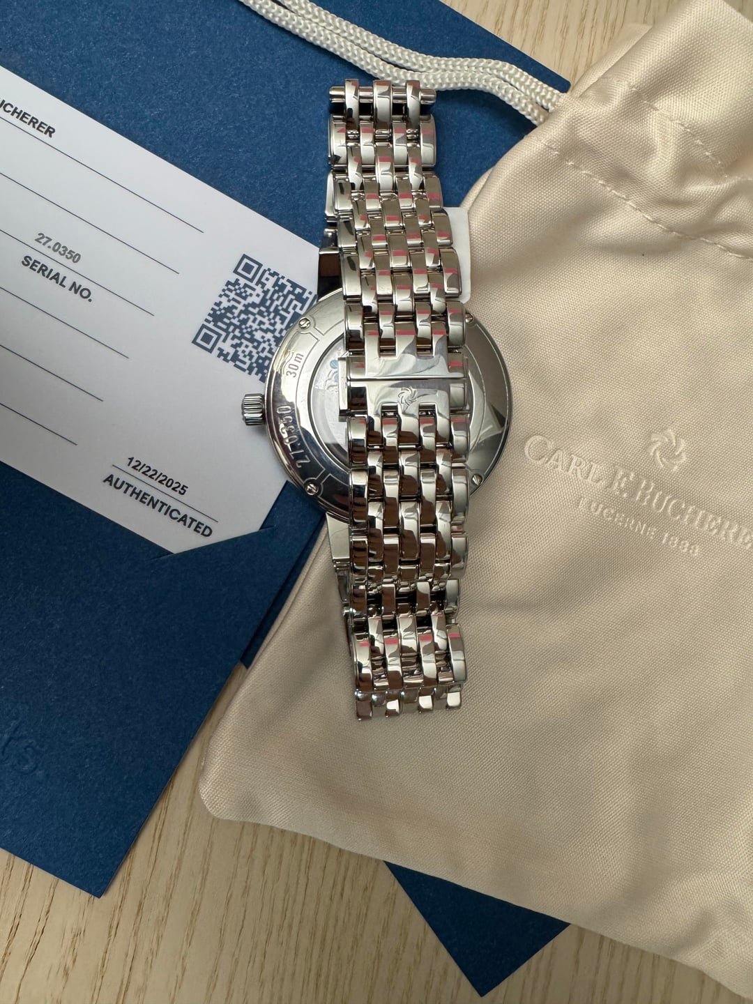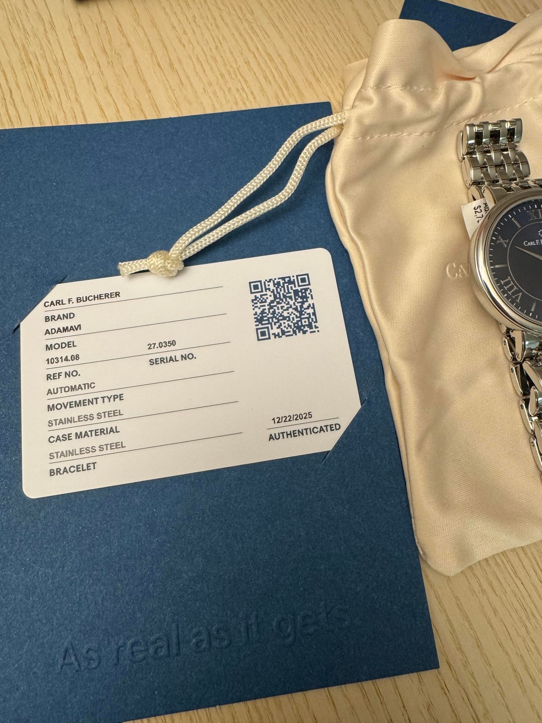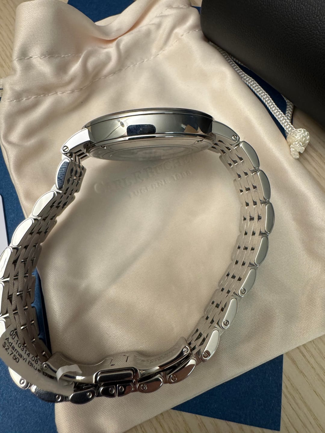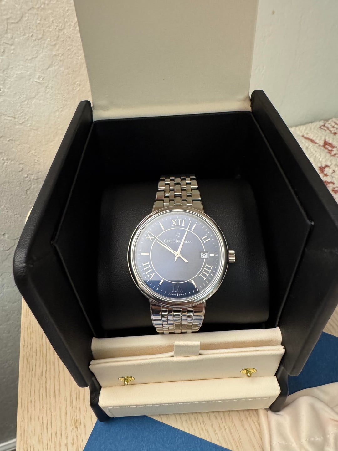 [Album+Time](https://imgur.com/a/ndLCvap) [Video](https://imgur.com/a/JeqmbUQ) Hey everyone — feel free to reach out if you have any questions. Up for sale is a Carl F. Bucherer Adamavi Automatic with a blue dial in a 39mm case. It’s a great all-around size that works well for daily wear but still looks sharp dressed up. The design is clean, classic, and understated. The movement is nicely finished with perlage and heat-blued screws, details you usually see on higher-priced watches. The bracelet uses screws instead of pins, which is a nice quality touch. Overall, this watch really punches above its weight and reflects the attention to detail CFB is known for. The watch will come with an official eBay Authentication card, confirming it passed inspection and is 100% authentic. Condition • Like-new showroom condition with tags • Never worn, running perfectly • Very light handling marks (barely noticeable) • Sapphire crystal is clean and scratch-free Details • Brand: Carl F. Bucherer • Model: Adamavi Automatic • Reference: 00.10314.08.55.21 • Dial: Blue • Case Size: 39mm • Movement: Swiss automatic • Crystal: Sapphire • Swiss made Included • Leather travel case & pouch • Original hang tag (MSRP $2,750) • eBay Authentication card Price $735 shipped — lowest priced blue dial available (checked thoroughly) Payment • PayPal Friends & Family • Zelle • Bank wire Shipping • USPS Priority • Signature required Location • California • CONUS only Notes I’ve sold multiple higher-end watches and can provide solid references if needed.