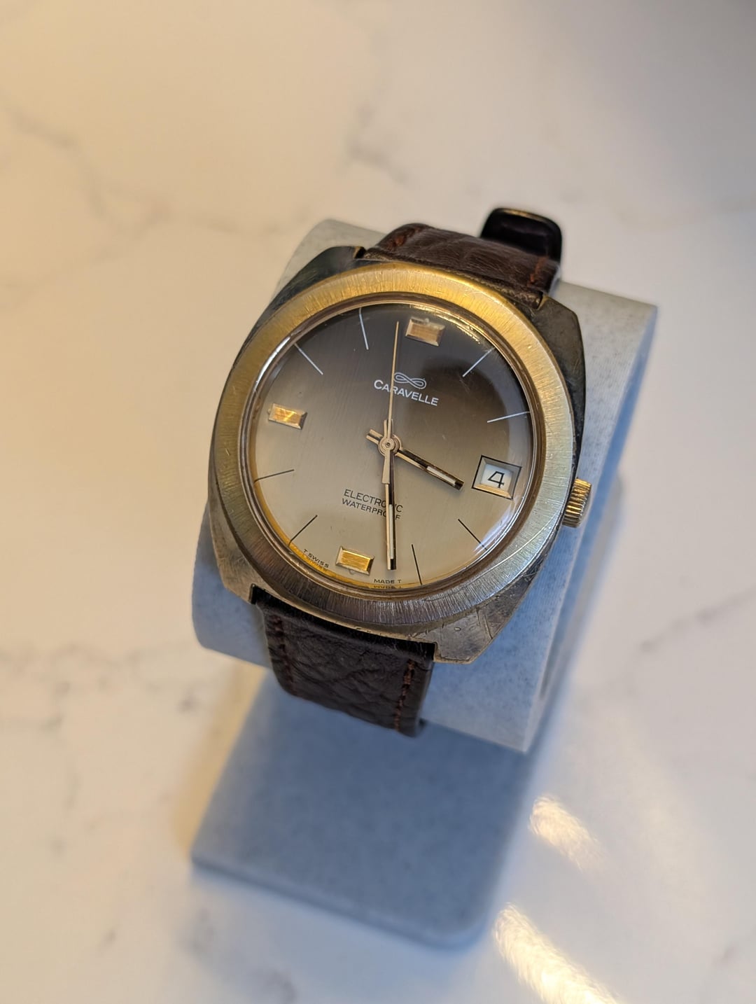 [Timestamp](https://preview.redd.it/wts-vintage-jumbo-38mm-caravelle-electronic-gradient-dial-v0-w5kezimgmebg1.jpeg?width=3072&format=pjpg&auto=webp&s=189d0fd68e40a5ee05a655480ac091e3d0b3c0bf) Selling my really funky electric Caravelle with a beautiful gradient dial. What originally caught my eye was the fact that the hour markers and the text switch colour with the gradient of the dial as well which gives it a really nice contrast. The dial and hands are in overall excellent condition with no noticeable wear. The same cannot be said for the case, which is in well worn condition with large areas of missing plating and dings. This is a watch you buy and wear for the dial - as I did. The Bulova 13UKCD movement is running strong and the previous owner indicated it was serviced. The overall movement condition and accuracy lend value to that statement (currently averaging +10spd) but no paperwork was available to confirm it. There are no comps online so I am pricing it in line with other running electrics from this era at **$120 shipped** from Saskatoon. I am looking for **$99 USD shipped from Canada to most countries. Duties prepaid for US buyers.** I can take Wise, PayPal G&S+4%, or PayPal F&F.