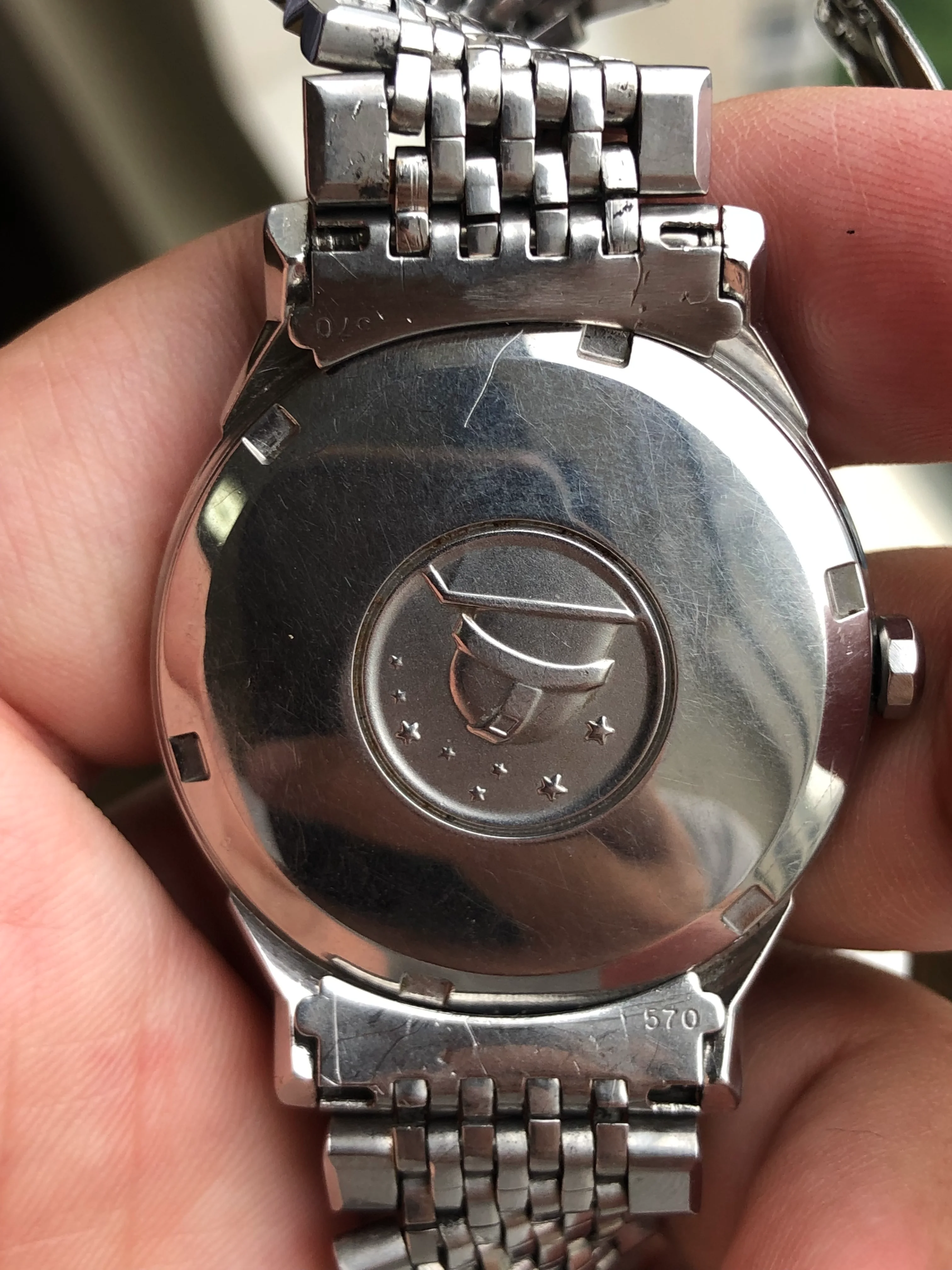 - Bracelet: Omega bracelet reference 1037 with 570 end-links in fair condition, polished; triple fold clasp featuring micro-adjust with Omega logo.