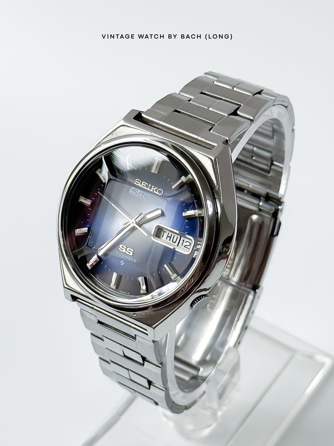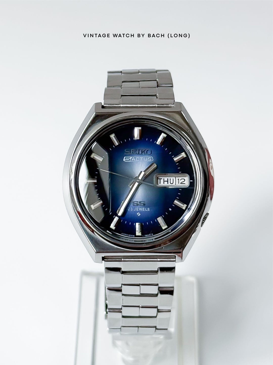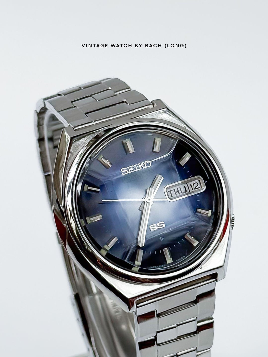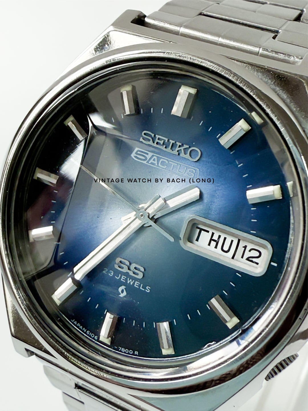 Seiko 5 Actus 6106-8690 Sunburst Blue Dial (Automatic) SPECIFICATIONS: \- Japanese Seiko 5 Actus excellent condition from August 1975, classic and vintage style. The Actus line was sold only in Japan and designed with higher jewel count, sporty version of the regular Seiko 5. \- Original Seiko 5 Actus stainless steel bracelet fit up to 19.5cm wrist. \- Stainless steel case size 38mm (without crown), Lug to Lug: 40mm, Lug Width: 18mm, Thickness: 11mm. \- Beautiful sunburst blue dial, glowing light when seen from different angles. Thick baton hands with classic baton hour marker. A bold calendar box for Kanji/English day and date at 3 o’clock position. \- Faceted cut crystal add more interesting and eye-catching effect to the watch. \- Quickset date/day, push the crown all the way to change weekday, push half way to change date. \- “SS” logo mean Second Setting (Hacking), an advanced watch technology at that time. \- The swirl logo applied at the bottom of the dial, mean Suwa Factory - today's Seiko Epson. CONDITION: The watch is very well preserved for its age (See Photos). No obvious signs of wear. The original movement works well (keeping the time, changing the date). Cleaned and serviced. It’s recommend to only setting the day/date in 6-7 o’clock (safe time), should not change it in 9PM-4AM or that might damage the movement. Recommend to avoid getting wet for vintage watch. The watch has been tested for more than 1 month and operate stably before selling. SHIPPING AND PAYMENT: \- Worldwide shipping via UPS (cost me 60-80 USD) with tracking number. 6-8 business days. \- Price 320 USD (free shipping). \- Import duties, taxes and charges are not included in the item price. These charges are the buyer’s responsibility. Please check this prior to buying. These charges are normally collected by shipping company (UPS). For more beautiful watches, visit: Etsy: [https://vintagewatchbybach.etsy.com](https://vintagewatchbybach.etsy.com) Ebay: [https://www.ebay.com/usr/vintagewatch\_bybach](https://www.ebay.com/usr/vintagewatch_bybach) Grailed: [https://www.grailed.com/VintageWatch\_ByBach](https://www.grailed.com/VintageWatch_ByBach) Instagram: [https://www.instagram.com/vintagewatch\_bybach](https://www.instagram.com/vintagewatch_bybach)
