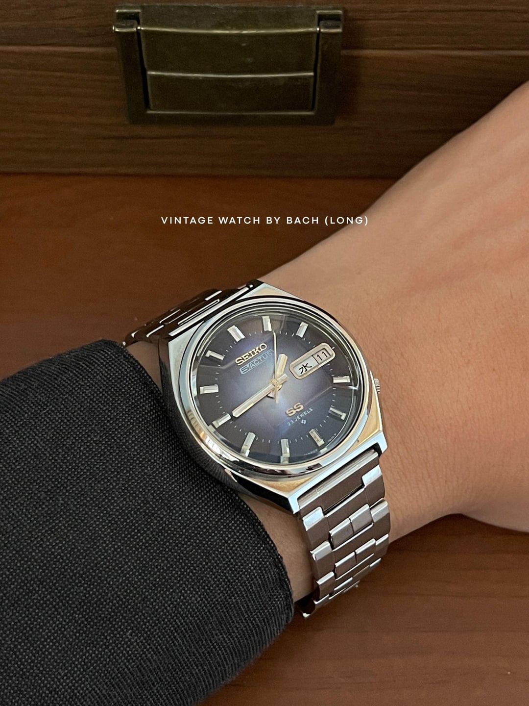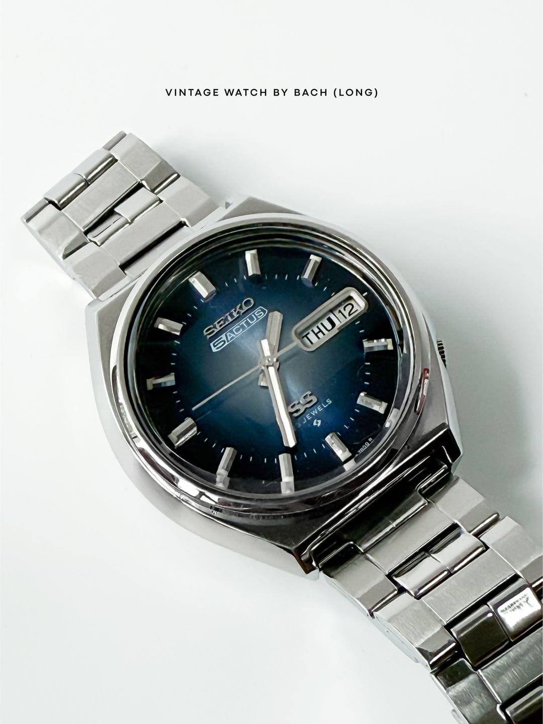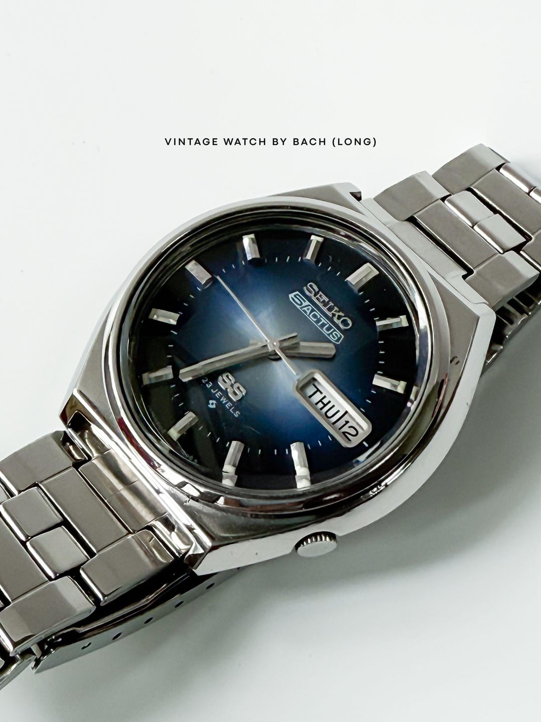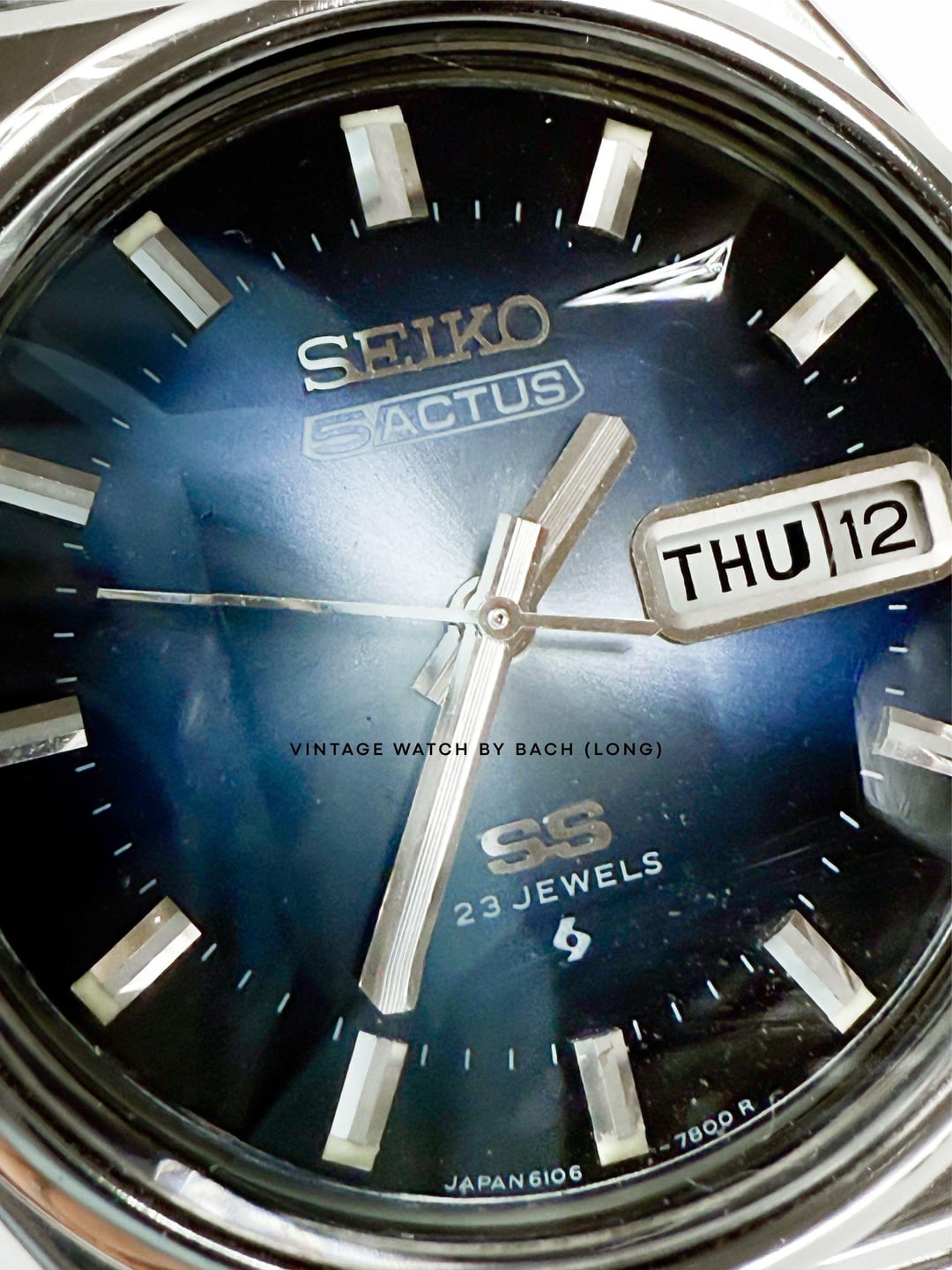 Seiko 5 Actus 6106-8690 Sunburst Blue Dial (Automatic) SPECIFICATIONS: \- Japanese Seiko 5 Actus excellent condition from August 1975, classic and vintage style. The Actus line was sold only in Japan and designed with higher jewel count, sporty version of the regular Seiko 5. \- Original Seiko 5 Actus stainless steel bracelet fit up to 19.5cm wrist. \- Stainless steel case size 38mm (without crown), Lug to Lug: 40mm, Lug Width: 18mm, Thickness: 11mm. \- Beautiful sunburst blue dial, glowing light when seen from different angles. Thick baton hands with classic baton hour marker. A bold calendar box for Kanji/English day and date at 3 o’clock position. \- Faceted cut crystal add more interesting and eye-catching effect to the watch. \- Quickset date/day, push the crown all the way to change weekday, push half way to change date. \- “SS” logo mean Second Setting (Hacking), an advanced watch technology at that time. \- The swirl logo applied at the bottom of the dial, mean Suwa Factory - today's Seiko Epson. CONDITION: The watch is very well preserved for its age (See Photos). No obvious signs of wear. The original movement works well (keeping the time, changing the date). Cleaned and serviced. It’s recommend to only setting the day/date in 6-7 o’clock (safe time), should not change it in 9PM-4AM or that might damage the movement. Recommend to avoid getting wet for vintage watch. The watch has been tested for more than 1 month and operate stably before selling. SHIPPING AND PAYMENT: \- Worldwide shipping via UPS (cost me 60-80 USD) with tracking number. 6-8 business days. \- Price 320 USD (free shipping). \- Import duties, taxes and charges are not included in the item price. These charges are the buyer’s responsibility. Please check this prior to buying. These charges are normally collected by shipping company (UPS). For more beautiful watches, visit: Etsy: [https://vintagewatchbybach.etsy.com](https://vintagewatchbybach.etsy.com) Ebay: [https://www.ebay.com/usr/vintagewatch\_bybach](https://www.ebay.com/usr/vintagewatch_bybach) Grailed: [https://www.grailed.com/VintageWatch\_ByBach](https://www.grailed.com/VintageWatch_ByBach) Instagram: [https://www.instagram.com/vintagewatch\_bybach](https://www.instagram.com/vintagewatch_bybach)