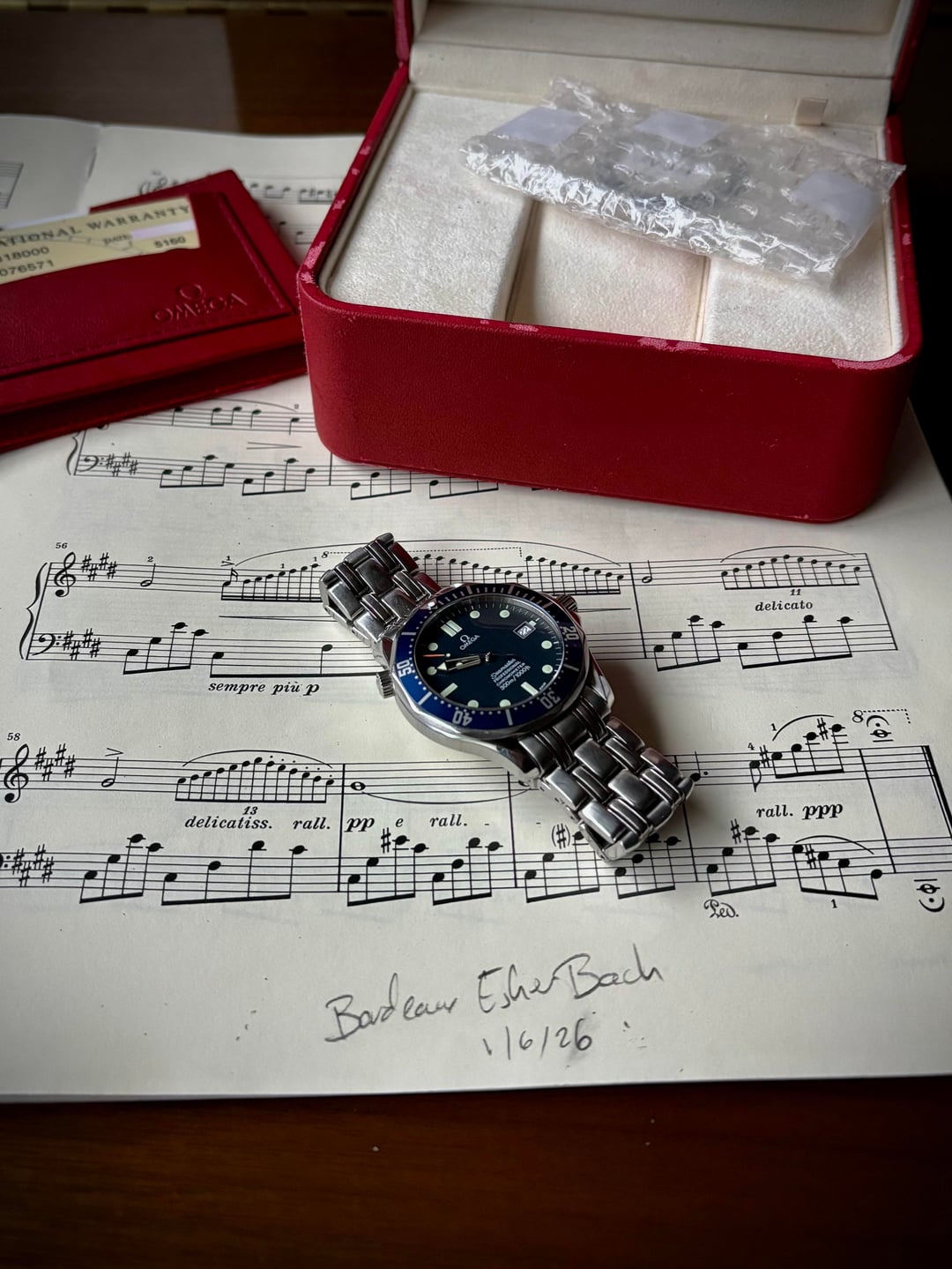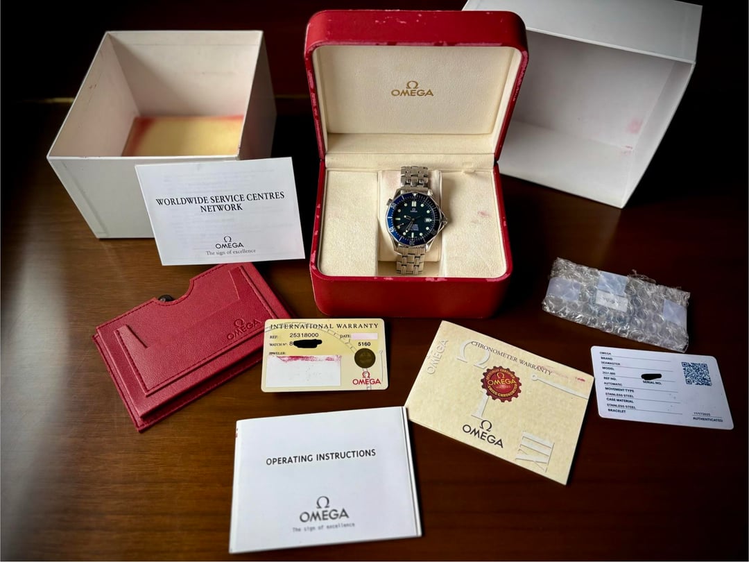 Hello all - For sale is my 2531.80. The Brosnan. OG Omega Bond watch. One for the millennial collectors. Watch is in excellent unpolished condition. It was serviced by Omega in 2021 with no polish as requested but they replaced the bezel. The original bezel is included. Comes with full kit as shown. Asking $3.500 obro. Let me know if you have any questions.