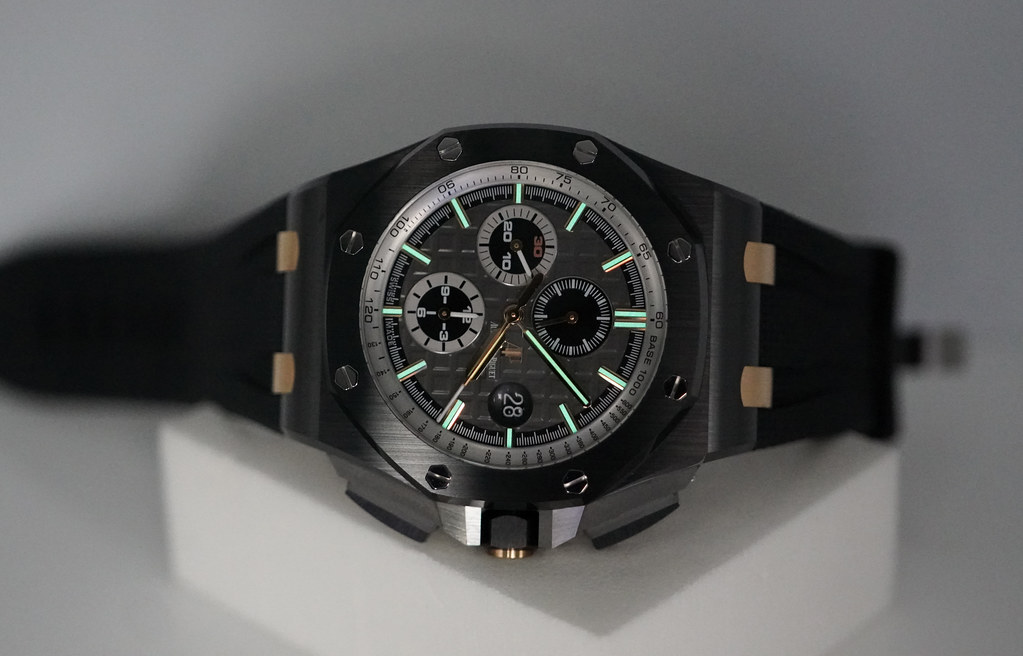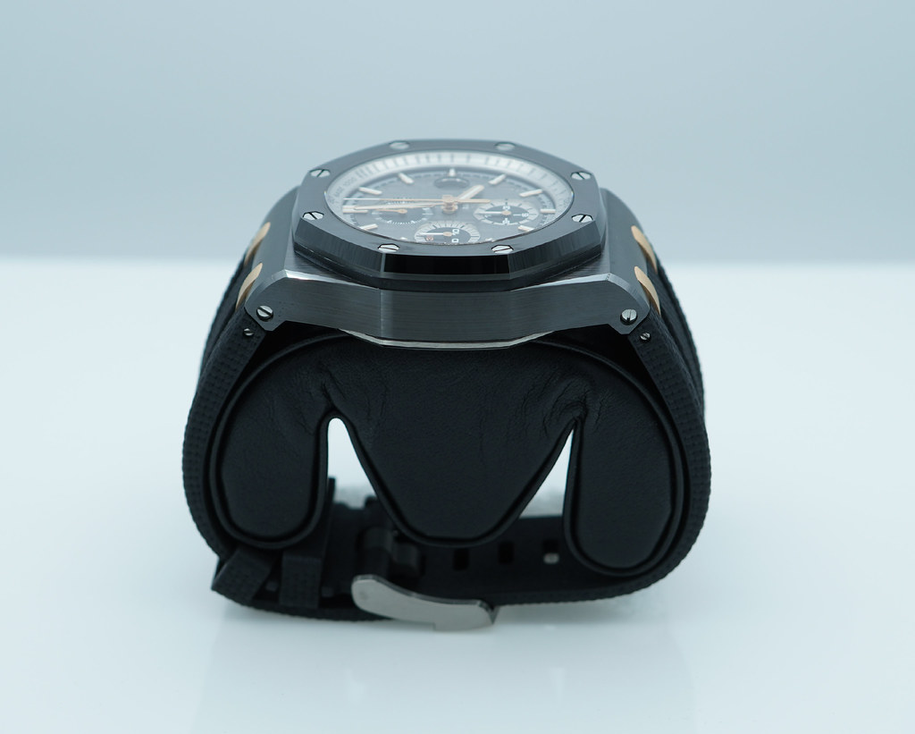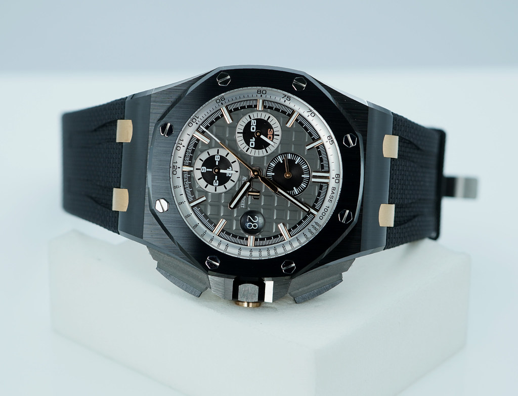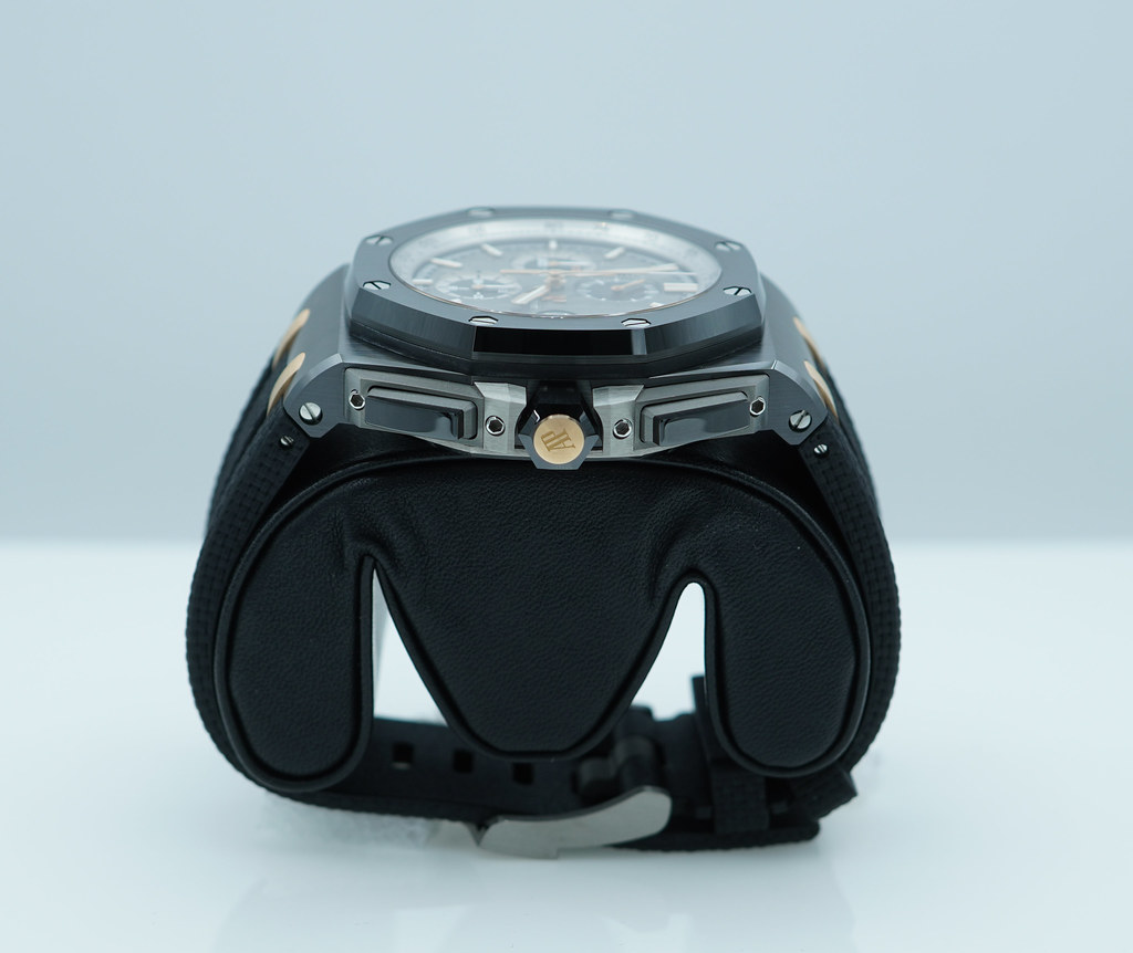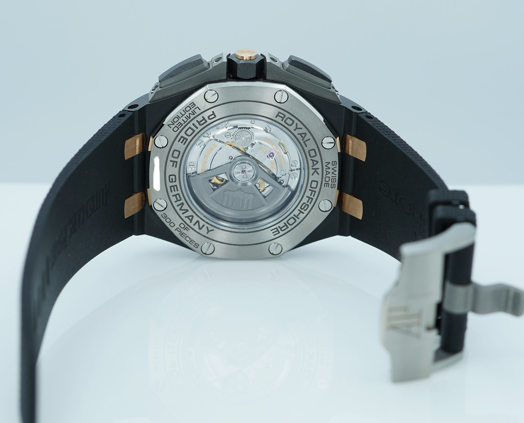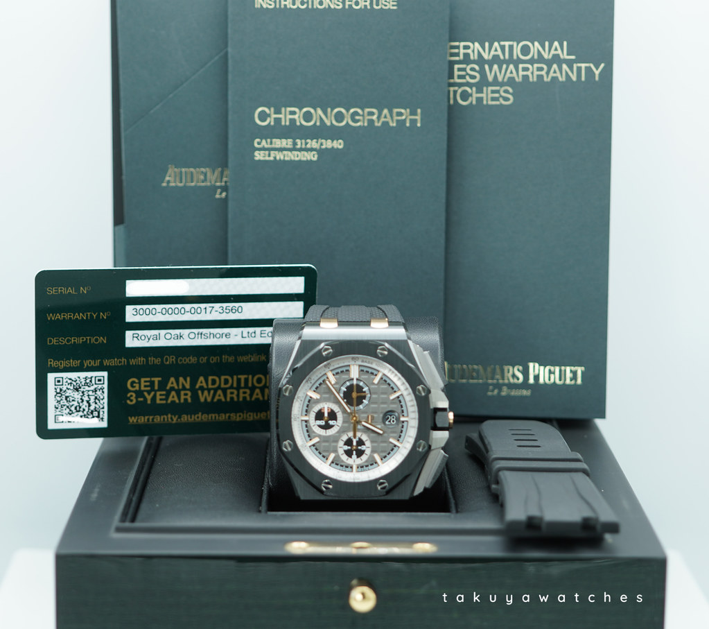 Hi, Selling A Mint Condition & Very Beautiful Limited Edition of 300 Pieces 44mm Audemars Piguet Royal Oak Offshore Chronograph 26415 "Pride of Germany" Black Ceramic Case with 18K Rose Gold Links. Slate Grey dial with Tapisserie pattern, black and rhodium-toned counters, rose gold applied hour-markers and Royal Oak hands. It's on Black Rubber Strap with Titanium Pin Buckle. Purchased from Audemars Piguet Boutique in 12.2019. The Watch received Full Services with New Movement Cal. 3126 in 2021. Watch Running Perfect with Non Issues. Full Set.