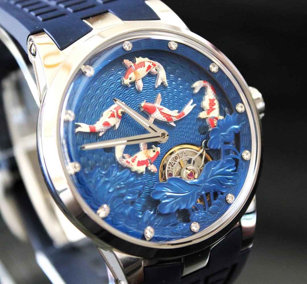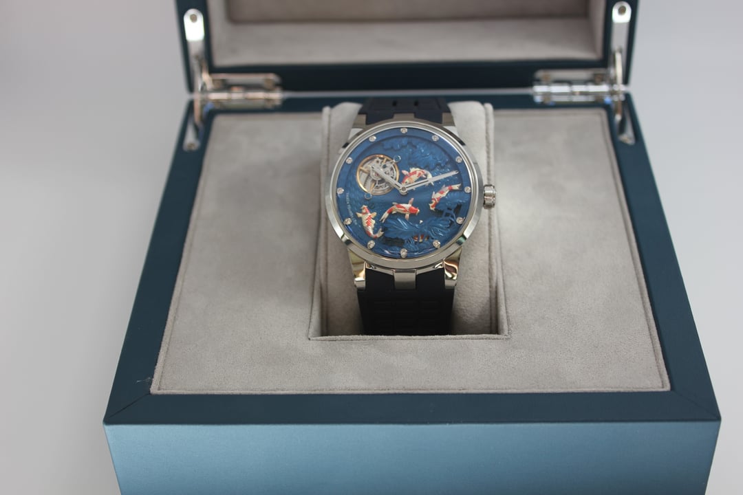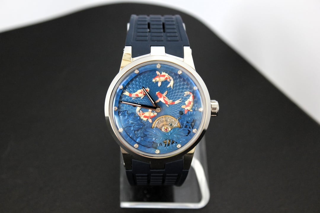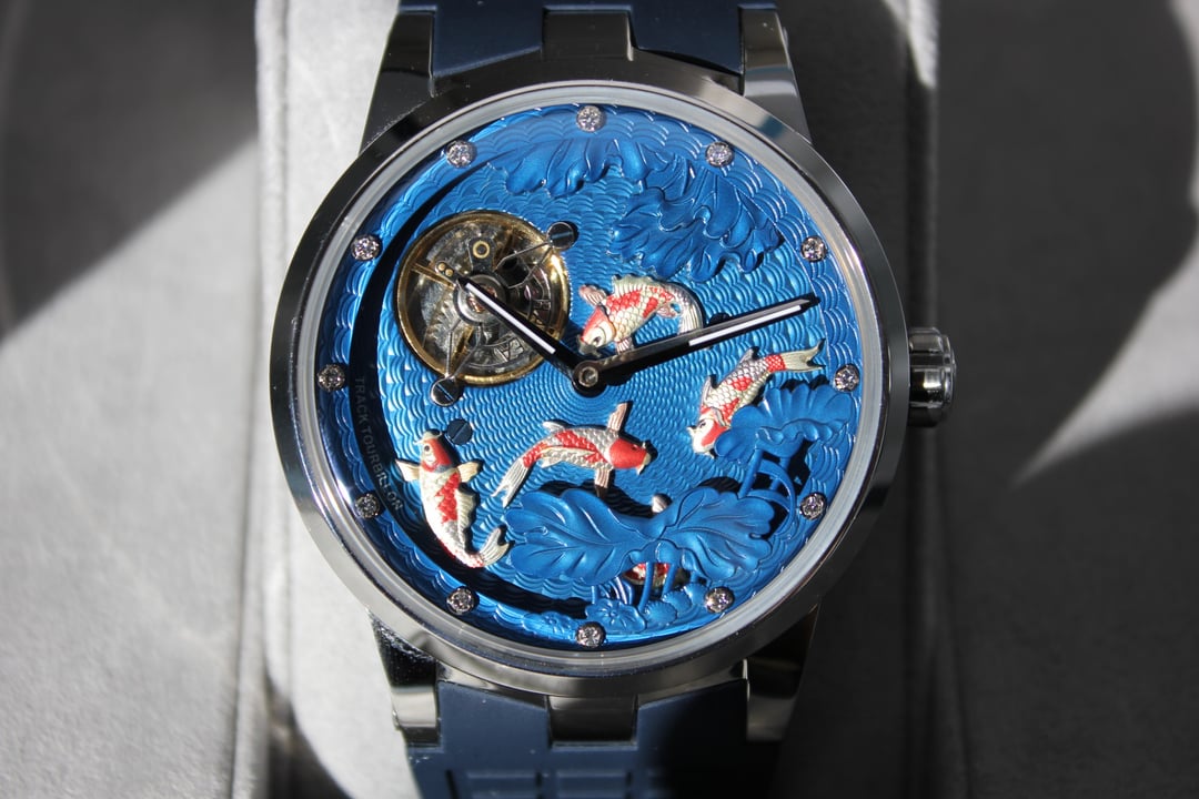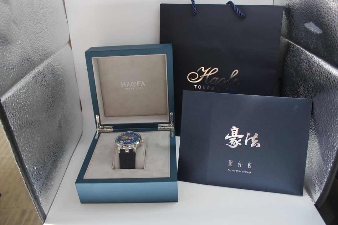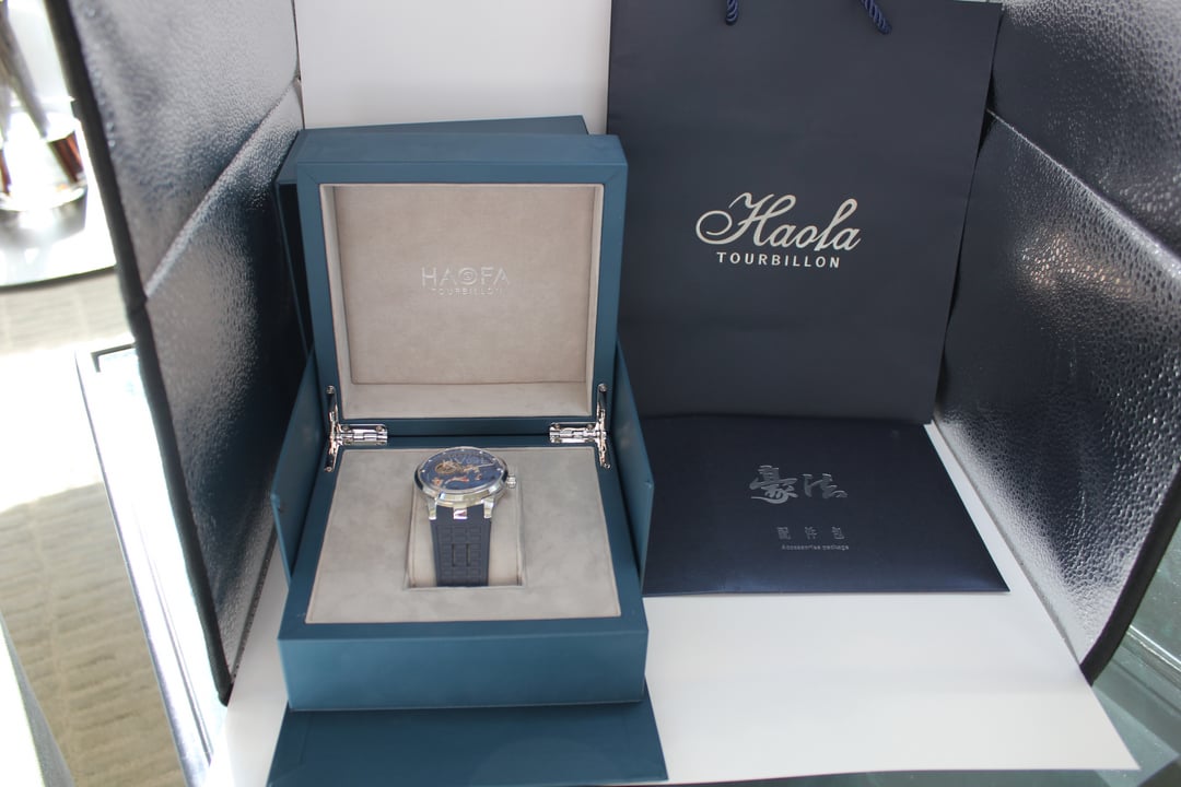 **Summary**: For sale is a very interesting Chinese watch from Haofa. This model's standout feature is the intricate, revolving guilloche dial, on which several playful carp swim. The exposed balance wheel and dial are located on a mobile plate, which revolves around the center point of the dial face once every 60 minutes. In other words, the carp swim around the dial--a classic Chinese motif symbolizing harmony and fortune. This watch's interesting rotating dial is achieved using a modern variant of the (very rare) and classic carousel design of Bahne Bonniksen, who designed it in the1890s to compete with Abraham Breguet's technically brilliant but complicated tourbillon mechanism. Bonniksen's resulting design, named "carousel", [was patented in 1895](https://patents.google.com/patent/US549287A/en) and survives to this day as one of the few mechanisms invented to address the variance in accuracy caused by gravity. Very few watch manufacturers have attempted a modern carousel caliber. The only ones (to my knowledge) who have done so are Haofa and Shanghai Watch Factory. Blancpain has marketed a "carousel" mechanism in the recent past, but this is a misnomer -- Blancpain's mechanism it is not actually anything like the true carousel mechanism of Bonniksen but more similar to an eccentric tourbillon. This watch comes with "full kit" -- shopping bag, outer cardboard case, inner display case, accessories bag, etc. **Price**: **$850** (PRICE REDUCED FROM $910). Shipping is **$25** in continental US via USPS Priority Mail, signature required. Local sale in Los Angeles area welcome. I accept Zelle, Venmo, and Paypal (+4%). This price represents a savings of roughly **$150 off** of the lowest available price on AliExpress and Haofa's website. **Timestamp and entire photo album**: [https://imgur.com/a/pUdy2ld](https://imgur.com/a/pUdy2ld) . I have tried to take multiple photographs from multiple angles in multiple lighting conditions to show the true state of the watch. **Overall condition**: Like new / extremely light marks on case. Worn a small handful of times -- less than five times. See detail photos for reference. **Dial**: 43mm. **Crystal**: sapphire. **Movement**: Haofa in-house caliber, no. 125.02K **Strap/bracelet**: proprietary 22mm width strap, rubber (FKM or silicone), spring-loaded butterfly clasp. **Accuracy**: regulated by Sangamon Watches to to achieve excellent accuracy. The timegrapher photo is a "best case" reading across 1 minute in dial-up position; your experienced accuracy may vary. But the accuracy snapshot gives you a good idea of what to expect--well within the ISO 3159 chronometer standard. **Miscellaneous**: I posted a brief review of this watch on [r/Chinesewatches](https://www.reddit.com/r/Chinesewatches/) [here](https://www.reddit.com/r/ChineseWatches/comments/1p3d1nc/haofa_carousel_model_1951_carp_on_rotating/). **Official listing from manufacturer**: [https://haofatourbillon.com/products/haofa-carrousel-tourbillon-koi-fish-watch-1951?variant=40979514327217](https://haofatourbillon.com/products/haofa-carrousel-tourbillon-koi-fish-watch-1951?variant=40979514327217) **Haofa b-roll showing rotation of dial**: [https://www.youtube.com/watch?v=lfijgqs2zsU](https://www.youtube.com/watch?v=lfijgqs2zsU)