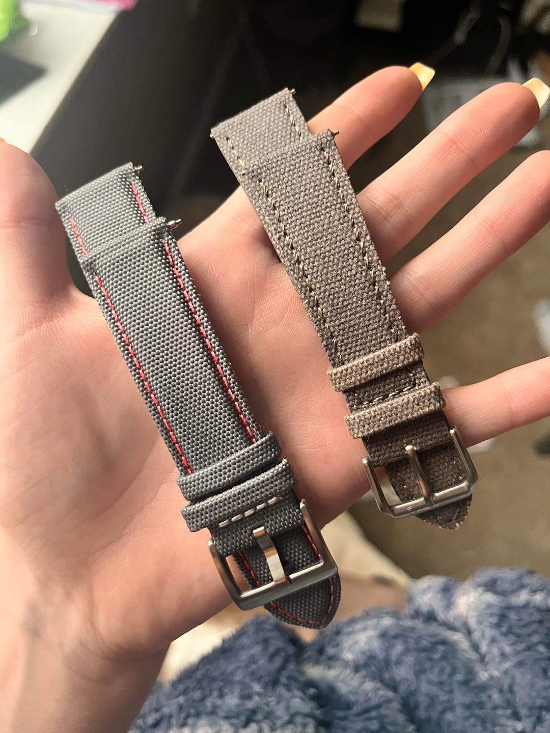 [WTS] 21mm sailcloth straps Left to right 21mm grey with pink stitching sailcloth strap/ $25 21mm grey/khaki color sailcloth strap/ $25 Prices include shipping Venmo, PayPal
