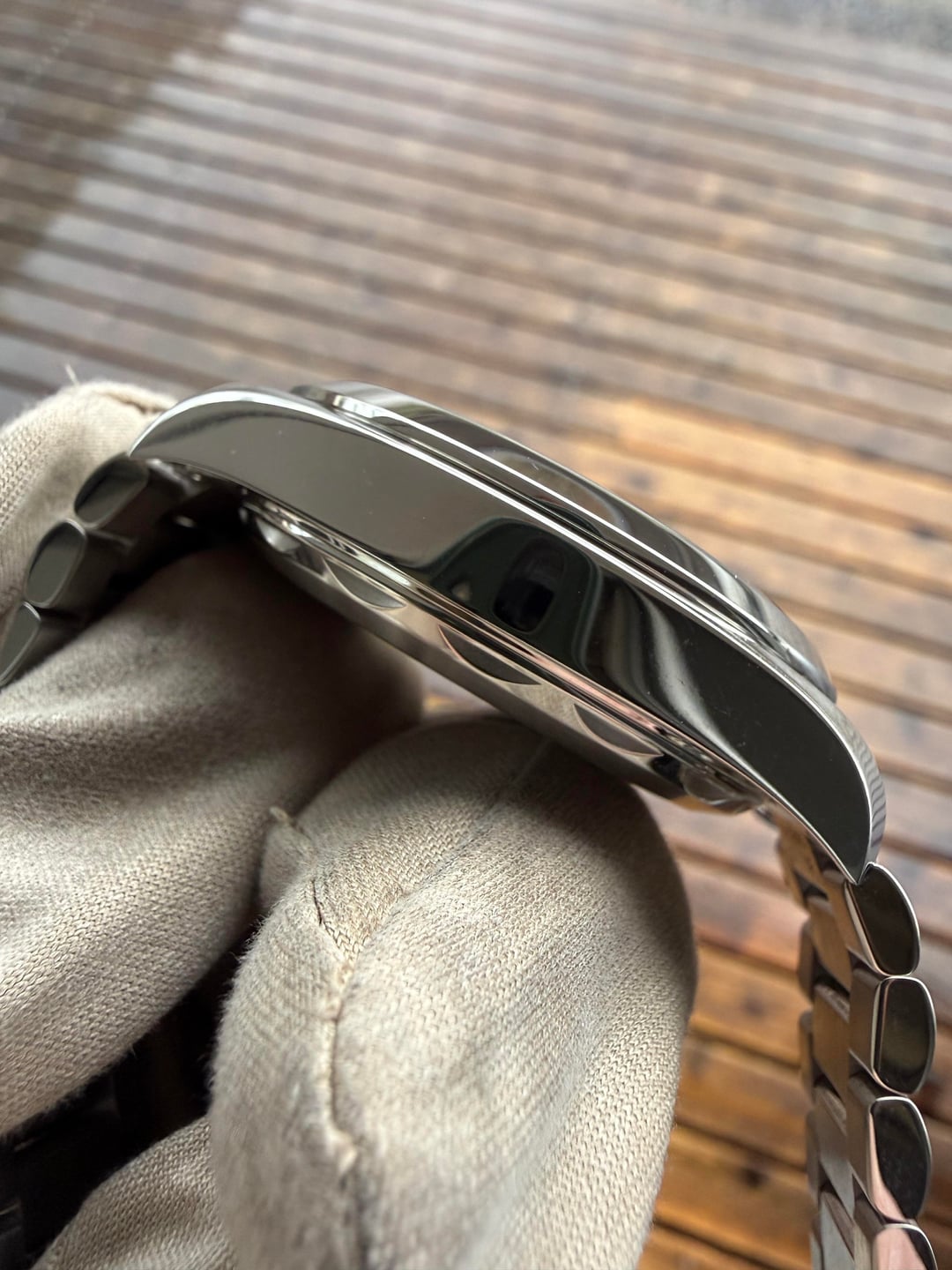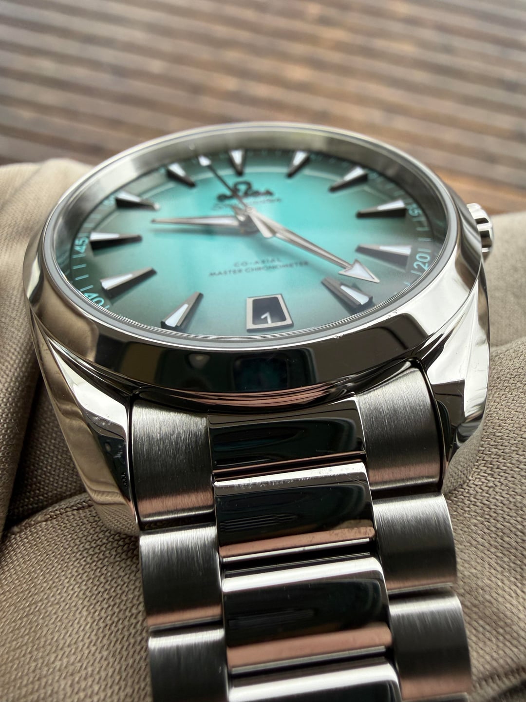 One of the coolest dials I’ve seen in a while. Absolutely pops in person! Model: Seamaster Aqua Terra 150M Ref. 220.10.41.21.03.006 Case Material: Stainless Steel Case Dimensions: 41mm Bezel: Stainless Steel Smooth Bezel Dial: Ocean Inspired Lacquered Turquoise Dial with Black Gradient Band Material: Stainless Steel Bracelet Max Wrist Size: 7.75 in. Original Purchase Date: April 2025 Movement: Automatic, Mechanical Accessories: Full Set Condition: Very nice preowned condition with some very light scratches on the case and bracelet MSRP: $7,400 Still Under Omega 5-Year Warranty! Price: $5,575 shipped! Bank wire price. WA residents subject to sales tax Email: [email protected]