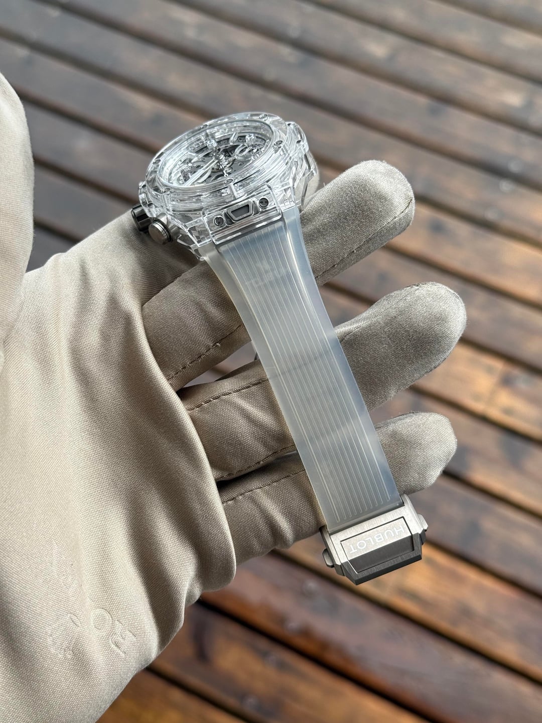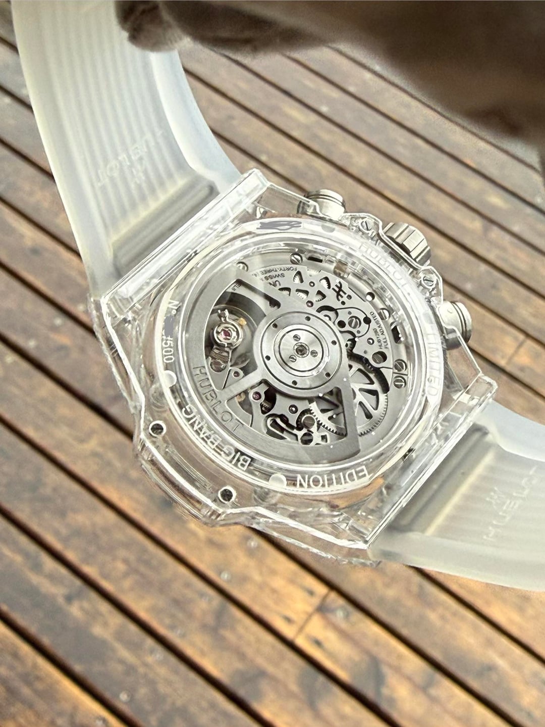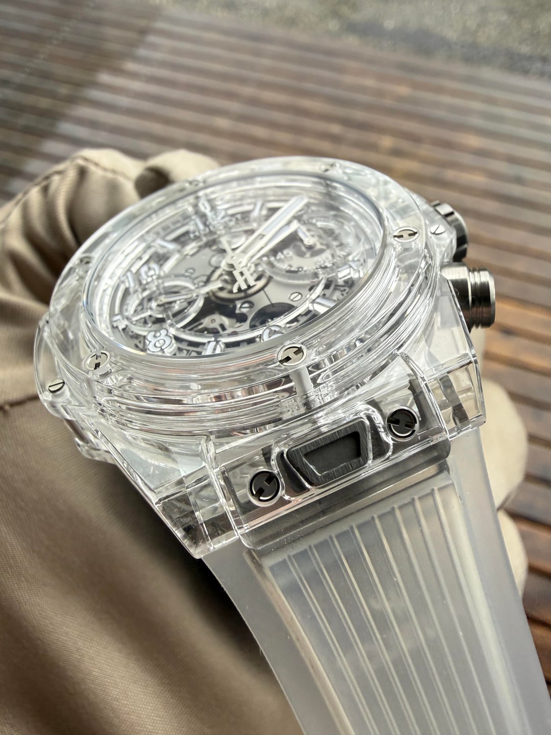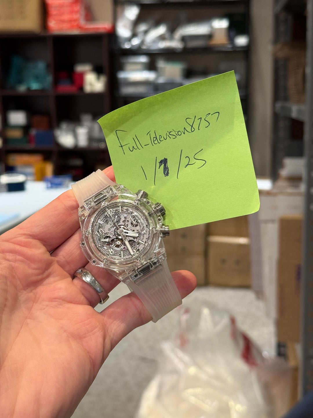 Can’t wait to watch the Hublot haters wet their shorts to this one. Until you’ve had it in hand or on the wrist. You don’t have an opinion. It is actually really freakin cool in person. When it’s only competition is 10x the price or more. There is a value argument to be made here. Model: Big Bang Unico Sapphire Ref. 441.JX.4802.RT Case Material: Clear Sapphire Crystal Case Dimensions: 42mm Bezel: Clear Sapphire Crystal Dial: Skeleton Dial Band Material: Hublot Clear Rubber Strap with Titanium Buckle Max Wrist Size: 8 in. Movement: Automatic, Mechanical Chronograph Accessories: Comes with Hublot Box. Digital Warranty Card is Registered Original Purchase Date: December 2021. Warranty Expired December 2023 Condition: Excellent preowned condition with almost no signs of wear MSRP: $79,000 Price: $30,200 shipped! Bank wire price. WA residents subject to sales tax Email: [email protected]