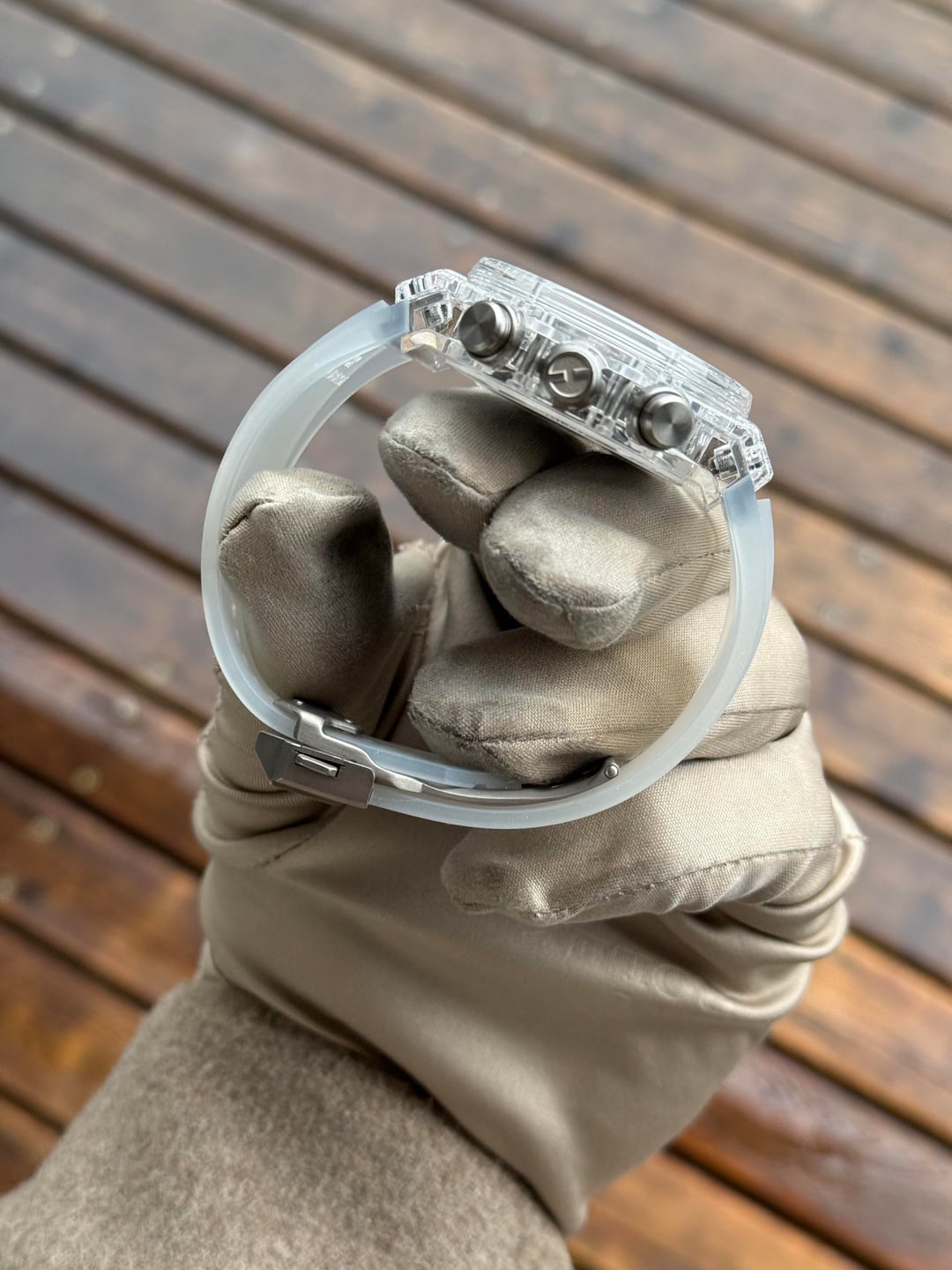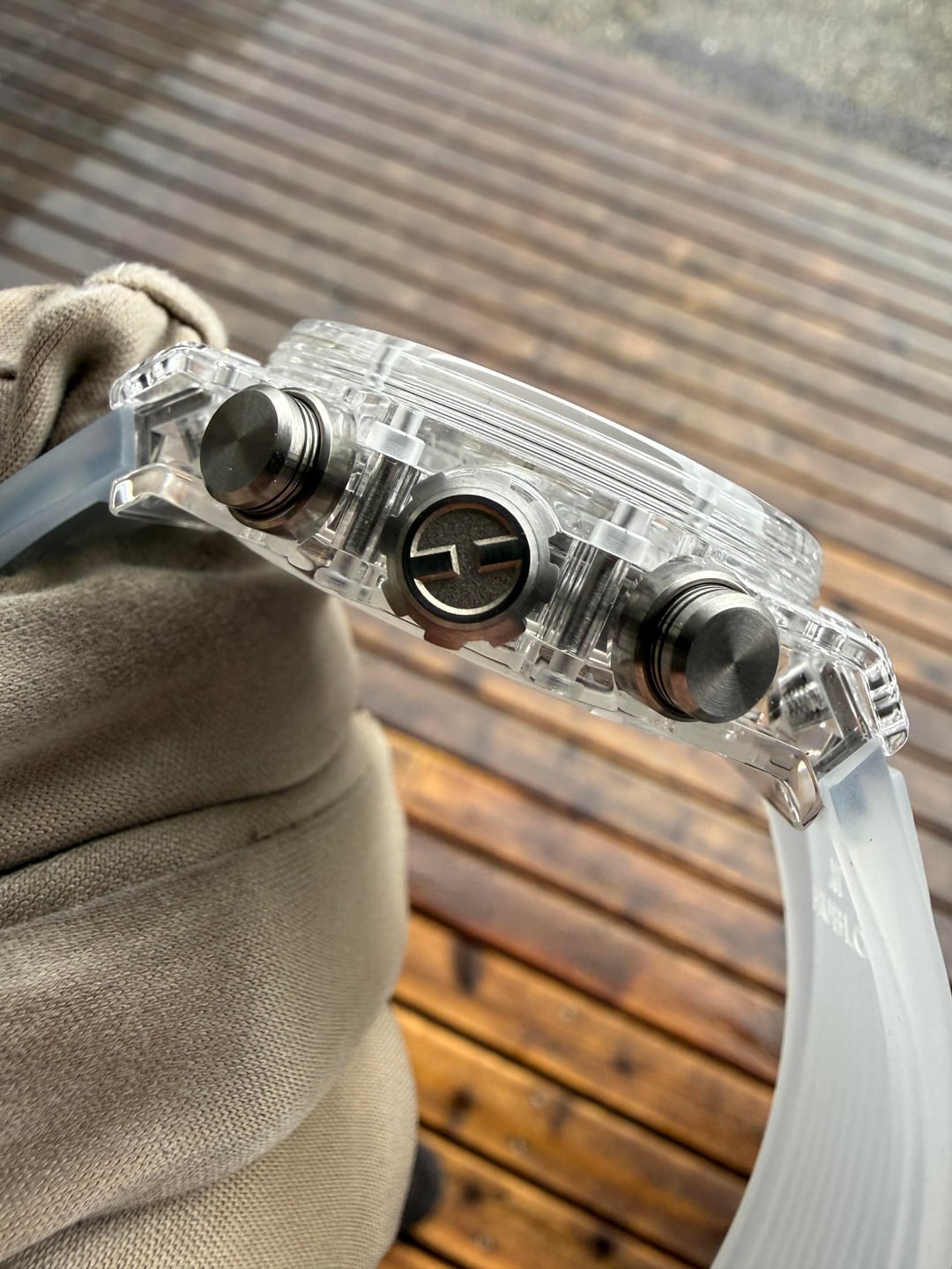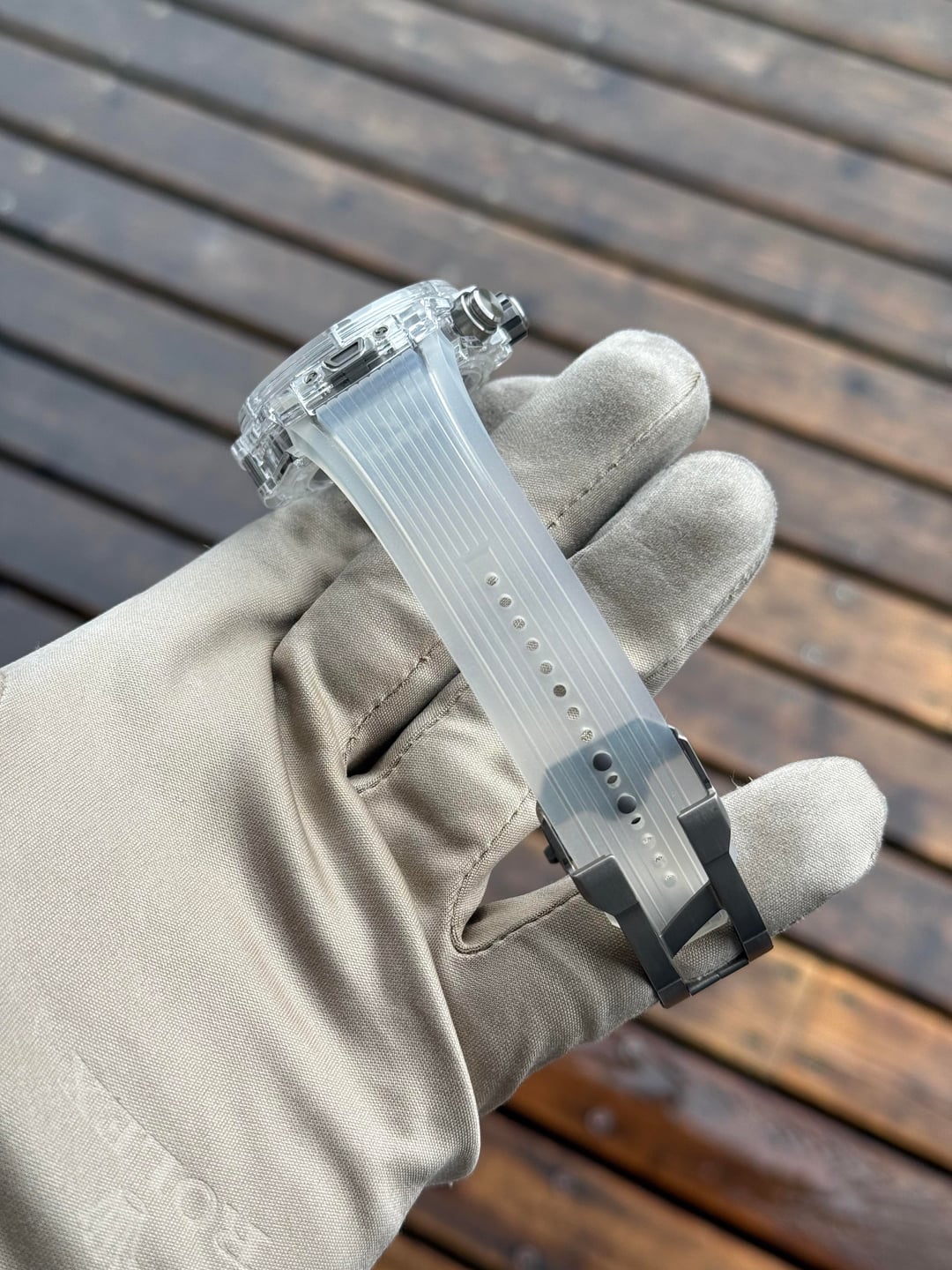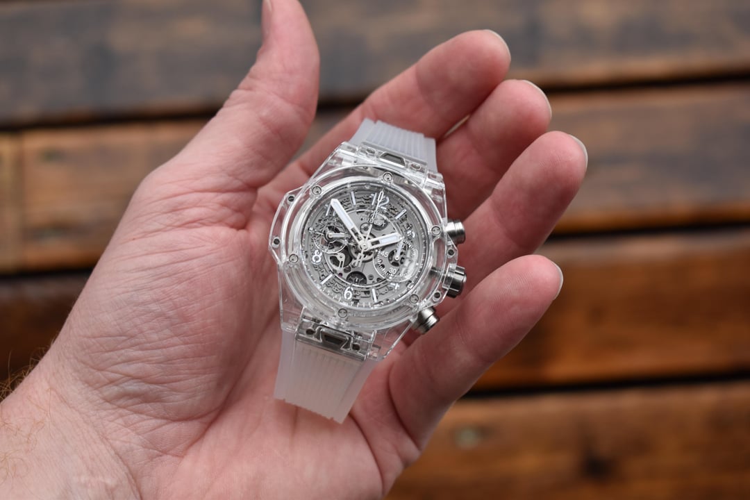 Can’t wait to watch the Hublot haters wet their shorts to this one. Until you’ve had it in hand or on the wrist. You don’t have an opinion. It is actually really freakin cool in person. When it’s only competition is 10x the price or more. There is a value argument to be made here. Model: Big Bang Unico Sapphire Ref. 441.JX.4802.RT Case Material: Clear Sapphire Crystal Case Dimensions: 42mm Bezel: Clear Sapphire Crystal Dial: Skeleton Dial Band Material: Hublot Clear Rubber Strap with Titanium Buckle Max Wrist Size: 8 in. Movement: Automatic, Mechanical Chronograph Accessories: Comes with Hublot Box. Digital Warranty Card is Registered Original Purchase Date: December 2021. Warranty Expired December 2023 Condition: Excellent preowned condition with almost no signs of wear MSRP: $79,000 Price: $30,200 shipped! Bank wire price. WA residents subject to sales tax Email: [email protected]