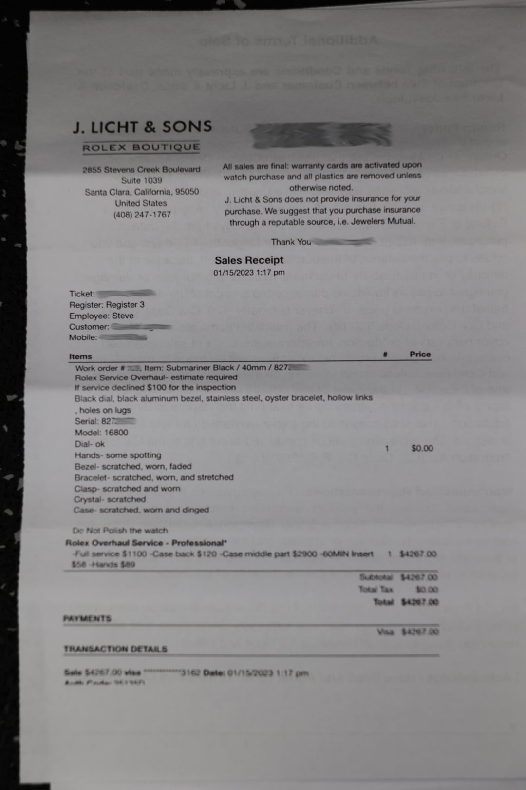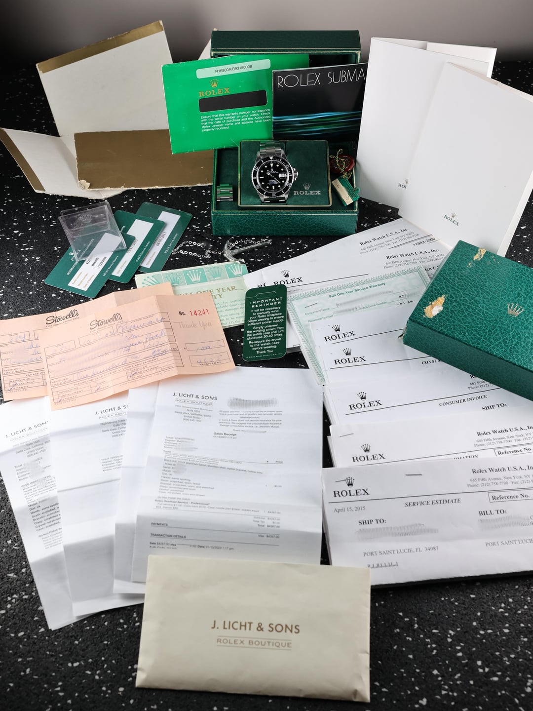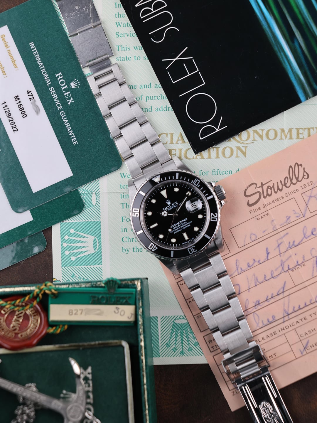 Brand/Model: ROLEX Submariner Reference: 16800 Year: 1983 Movement: Caliber 3035 Quickset date: Yes Crystal: Sapphire Case diameter: 40mm Bracelet: Tight 93150 oyster bracelet with 593 end-links sizable to a 7.25in wrist Contents: Box, papers, original purchase receipt, service records. Comments: This is a special set that you are not likely to come across too often. A 2-owner Submariner with an extensively documented history that includes not only RSC service papers but also the original purchase receipt. Purchased in late 1983, the watch was well loved and well worn in its early life. To ensure its longevity, it was serviced meticulously by Rolex Service Center, with documented servicing dating back to the early 2000s. As part of that work, the watch retained its original 1983 Cal. 3035 movement and received a service dial and hands (working lume), bezel insert, case, and bracelet. While many vintage Rolex watches with service components lose the details of those updates over time, this particular example has each and every major change fully documented, so much so that the replacement caseback is stamped with both the original serial number and the new serial number assigned to the service case. This is not a refinished or welded case with a rebuilt bracelet, but a fully legitimate RSC replacement case and bracelet that present in effectively near-NOS condition, free from the wear expected of a 40-year-old watch, paired with its original early-1980s movement. The result is a Submariner that offers vintage lineage with modern usability, complete transparency, and the rare opportunity for the next owner to wear and enjoy the watch while putting their own marks on it, rather than inheriting decades of someone else’s. Timestamp: [https://static.wixstatic.com/media/17bf69\_e84bdbbef8c345b5844bef11dd15f98b\~mv2.jpg](https://static.wixstatic.com/media/17bf69_e84bdbbef8c345b5844bef11dd15f98b~mv2.jpg) Yours for $11,500 via bank wire or Zelle. Have references on WUS, Reddit, TRF, and 100% feedback on eBay. You can reach me via 312-278-3218 / PM / [[email protected]](mailto:[email protected]). Follow me @ [www.timepiecetreasurebox.com](http://www.timepiecetreasurebox.com), on IG @ [timepiece\_treasure\_box](https://www.instagram.com/timepiece_treasure_box/), or on FB @ [Timepiece Treasure Box](https://www.facebook.com/profile.php?id=61566943652417).