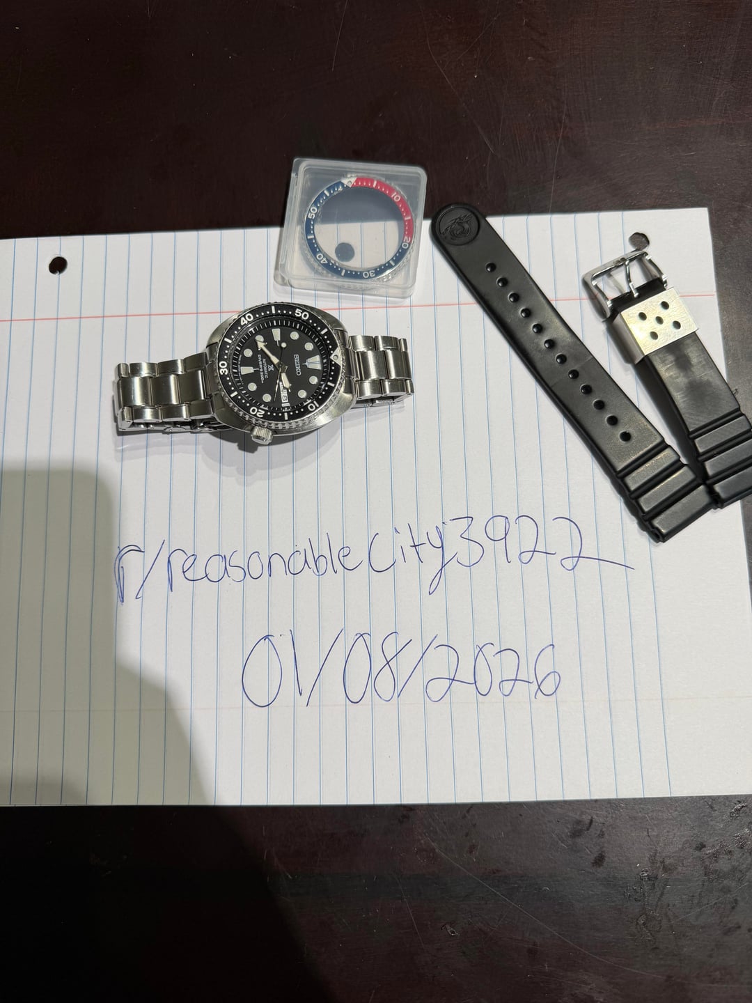 Selling a Seiko turtle with OEM Seiko bracelet sized to 7.25 inch wrist, a Seiko rubber strap and OEM Seiko Pepsi bezel. Price is $350 and I include shipping. Payment methods are PayPal, Cashapp or Venmo. I can do video calls as well. Have any other questions shoot me a pm :)
