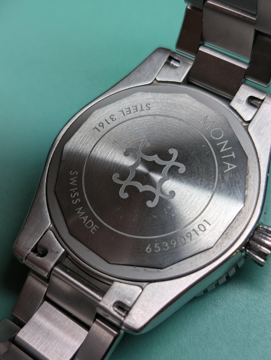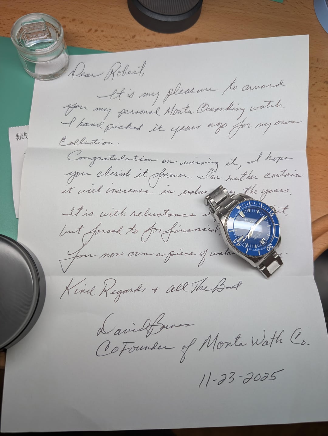 Own a piece of microbrand history today! This monta Oceanking V1 came from one of the co owners of monta, David Barnes, and comes with a hand written letter of appreciation. The watch was purchased off eBay in November 2025 by the previous owner. I acquired this watch from him through WUS. The Oceanking V1 was monta's first watch. It was far from perfect, but it established many conventions that are still used by the brand today. Notably, it was one of the few watches available ever with the eterna cal. 39 modular movement. [Read about it here!](https://www.hodinkee.com/articles/dissecting-the-new-eterna-caliber-39) Unfortunately the movement proved problematic and was quickly canned over the popular sw300. Cosmetically the watch is in good condition with signs of regular wear. Most notably scuffs throughout the bracelet. It passed a quick water resistance test with no issues. Mechanically the watch is running well and keeping time within expectation. No service is needed. I'm asking $1100 shipped CONUS for this piece. International shipping at buyer's expense. PayPal G&S is available at my discretion. Thanks for reading!