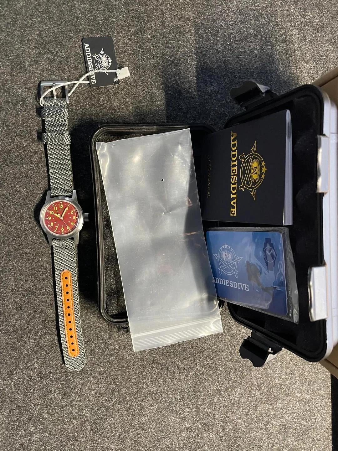 THIS IS A SINGLE BUNDLE / LOT LISTING. Clearing out part of my watch drawer and offering everything below as one complete bundle. This is a single listing with a single price – nothing is being sold separately. \---------------------------------- BUNDLE CONTENTS (1 lot): WATCHES (4 total): • **Specht & Söhne Aquanaut**\-style automatic – rose gold tone, screw-down crown, date at 3, box & papers, mint condition (strap cut \~6.25") • **Addiesdive 36mm** automatic field watch – sterile burgundy dial, 200m WR, box & papers, brand new / unworn • **Casio F-91W** – lightly worn, excellent condition • **Casio MQ-24-7B2** – lightly worn, excellent condition STRAPS (12 total): • **8 × 18mm NATO straps** (BluShark + others) • **4 × 20mm NATO straps** (Timex + Crown & Buckle) *Full strap breakdown available upon request.* \---------------------------------- **PRICE: $199 shipped CONUS** PAYMENT: PayPal F&F preferred (G&S accepted if buyer adds fees) SHIPPING: CONUS only Again – this is ONE BUNDLE LISTING and will not be split.
