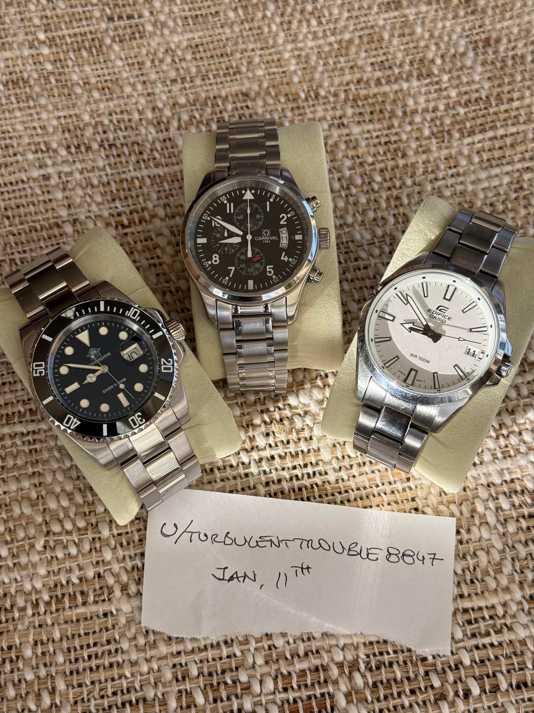 I’m downsizing my collection. All well taken care of. Priced to sell, low ballers will be ignored. If any doesn’t sell, I’ll gladly keep them. That’s the excuse I need, lol. Prices Include CONUS shipping. If you need more pictures/video, please let me know Addiesdive Black Sub Quartz new in box $50 Casio Edifice White Quartz (no box) $80 Carnival Chronograph Quartz (no box) $80 Happy to send more pictures upon request. Venmo / Zelle / PayPal