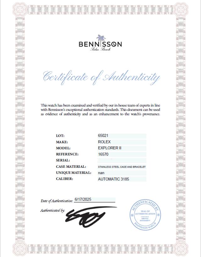 **Rolex Explorer II** Reference: 16570 Case Size: 40mm Case Material: Stainless Steel Bracelet Material: Stainless Steel Crystal: Sapphire Movement: Automatic 3185 Box/Papers: No Age: Unknown This Rolex Explorer II is in very good condition for its age. It is an F serial (2003-2005) with a no holes case, solid end-link bracelet, and was serviced in 2025. Box/papers are not included; however, the watch comes with a Bennisson certificate of authenticity dated 6/17/2025. The case is in very good condition with some light marks and hairlines present. The bracelet is in very good condition with some marks and hairlines. There is a notable mark, near the case, on the 12 o’clock side. It has 11 links and will fit around a 7.5” wrist. The bracelet remains tight overall with some minor wiggle. The bezel is in very good condition with some small marks and hairlines The watch is functioning as it should and keeping great time. **Price: $7,535** Timestamp: [https://imgur.com/a/I1T4jav](https://imgur.com/a/I1T4jav) [https://www.instagram.com/buckeye\_watches/](https://www.instagram.com/buckeye_watches/)