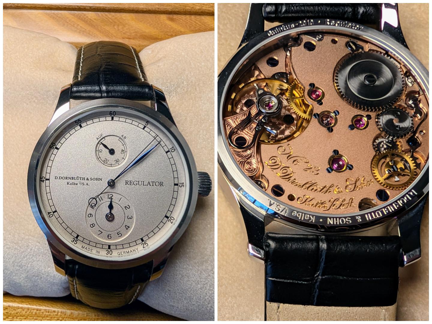 Dornbluth & Sohn Calibre Q.2010-REG with regulator, power reserve and central seconds - 38.5 mm • Watch diameter (mm): 38.5 • Watch height (mm): 10.0 • Lug width (mm): 20 • Lug to lug (mm): 48 • Case finish: Mixed • Case metal: Stainless steel • Case back: Transparent • Dial color: Silver/White • Front crystal: Sapphire To create this watch, Dirk Dornblueth created two bridges to house the additional gears necessary for the central seconds function, one of which is actually elevated over the other. This watch also features a hack function which completely stops the seconds hand when the crown is engaged. As is typical in a Dornblueth watch, Dirk includes all the "good stuff" - 3/4 plate, beveled edges, screw balance wheel, swan neck regulation, engraved balance cock, screwed gold chatons, and blued screws (by flame of course, including the slots). And now the extras. The name "D. Dornblueth & Sohn, Kalbe i./S.A." is hand engraved and not machine engraved, a virtually rarity on any watch. And all of the decoration (Côtes de Genève and the sunray finish on the crown wheel and ratchet) are all done in-house, by hand. You'll notice that the movement is rose gold in appearance - this process itself is elaborate. After cutting and polishing the plate, Dirk treats the surface to turn the metal a copper color. After all of the drilling and milling operations are complete, the movement itself is treated with rose gold to enhance the deep color. The dial is made in house, including the engraving process, which is extrement rare. This watch features a brushed and polished nickel-free steel case and the crown is signed D. Dornblueth, as is the tang buckle. Power reserve is 52 hours. **Price: $15,499 w/insured CONUS shipping** (MSRP is $18,340 with a 12+ month wait) Payment Method: Wire only for this sale Photos: [https://imgur.com/a/gKk7ug8](https://imgur.com/a/gKk7ug8) Video of Movement: [https://imgur.com/a/q0PdEvA](https://imgur.com/a/q0PdEvA) Timestamp: [https://imgur.com/a/7keRZDo](https://imgur.com/a/7keRZDo)