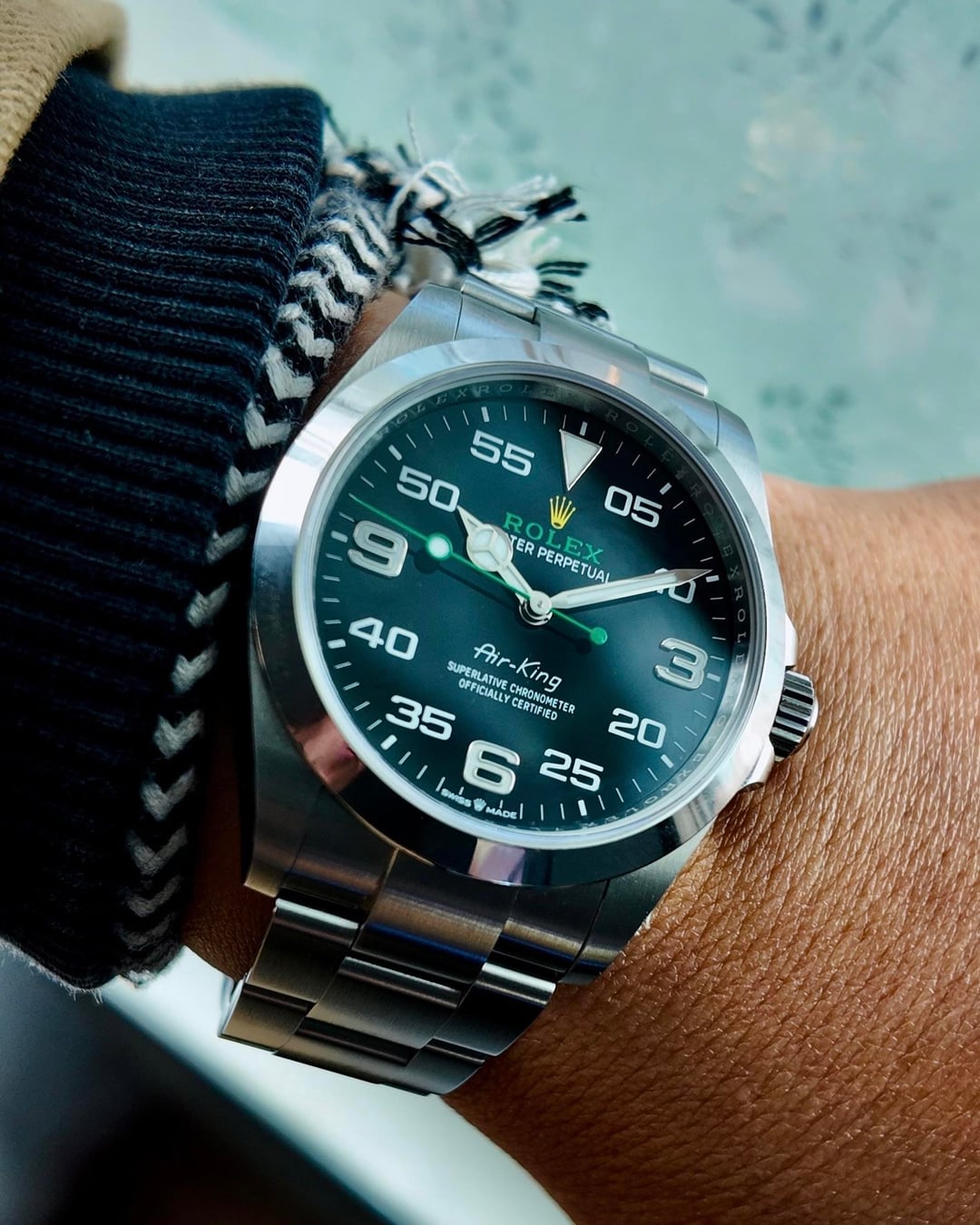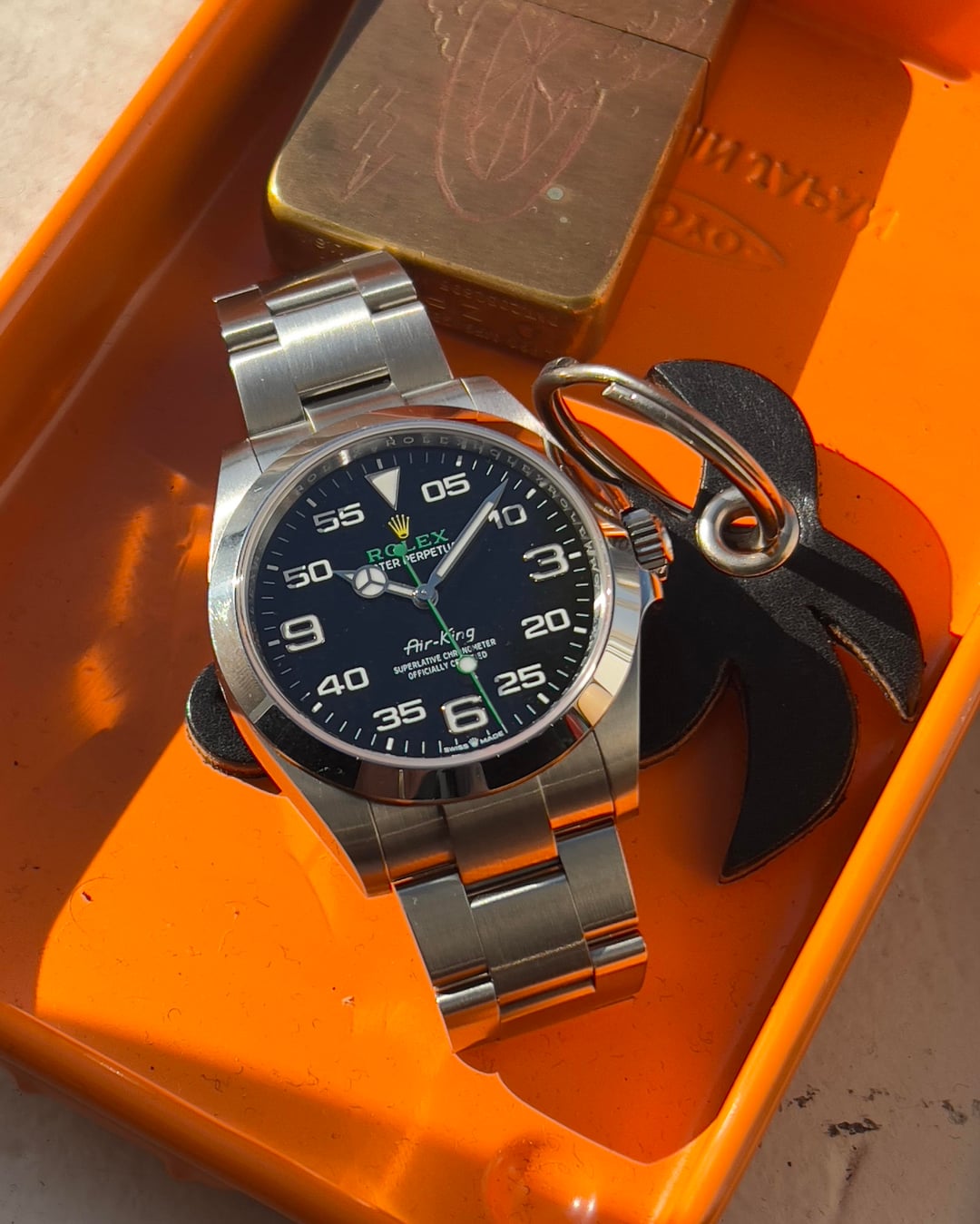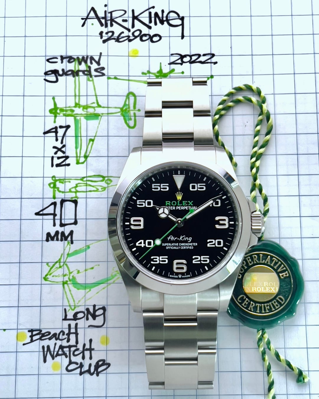 Rolex Air King ref. 126900 Full Set 2022 The Air King is the perfect intersection where sports and luxury meet. The “Air Series” was created to honor the RAF pilots of the Battle of Britain. There was actually an Air-Lion, Air-Giant, and Air-Tiger but the King was King. This reference 126900 is the most current model introduced in 2022 with 40mm case with crown guards, highly legible Chromalight Navigational display with long-lasting blue luminescence and folding Oysterlock safety clasp with Easylink 5 mm comfort extension link. Overall, this one is in very MINTY condition: minimal to no signs of wear with the clasp and caseback sticker still intact. It looks like it was just sized and worn out the AD then put away—then we photographed it. _________________________________________________ * Timestamp pix Videos: https://drive.google.com/drive/folders/1X2kEeCgLJ0KUVp0TjSUs9NlvPlTXJS4X * Specifications: 40mm oyster steel case X 47h (lug to lug) X 21 lug width powered by a 3230 calibre automatic movement —note the lug width is 21 per our calipers and there are 20 and 21 specs online. * Box and papers: Yes from 2022 as well as hang tag and lanyard. * Bracelet: Appears to be fully linked but double check if your wrist is 7.75 or bigger __________________________________________ __________________________________________ * video is the best way to view the watch if in-person test drive is not available. Due to the different characteristic of the cameras and gadgets used, the color of the watch you purchase may not be the same as shown on this website or on our Instagram. * will consider trades that make sense but please consider time, shipping, and trade value—not market. * local special: can possibly accommodate at ButterScotch in Downtown Long Beach by appointment * All sales final unless the watch is misrepresented or lost in transit (always fully insured) * Link to [feedback here](https://www.reddit.com/r/WatchExchangeFeedback/search?q=soycowboy&restrict_sr=1&sort=new) & [watchcharts here](https://watchcharts.com/repcheck/user/soycowboy?source=reddit&type=feedback) * Asking a *negotiable* **$8945** via Zelle, venmo, or possibly PayPal Friends & Family with super strong references or if I know you. Price includes fully insured Fedex shipping in the USA— hand delivery in most of the Los Angeles or Orange County areas with drinks or coffee on me ;). Cheers, Stephen
