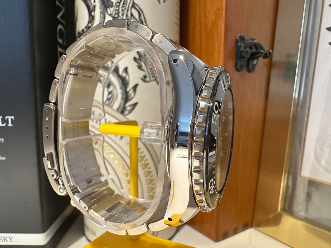 This GS Hi-Beat Diver is the kind of watch that looked like it ticked a lot of boxes for me; it was a larger watch (43.8 mm), titanium, some nice polish all around, and a clicky bezel that was unlike other watches I have had, and most importantly a micro adjust in the form of Seiko’s diver extension. What went wrong? It’s a little too big all around. While I love the idea of it and seeing it in the watch box, it’s not fitting me in the ways I need it too. I am also a sensitive guy apparently, because the raised GS logo bothers my wrist a bit. The watch is in good condition. The clasp has a lot of superficial scratches from 200m of desk diving. There are no deep scratches or blemishes on the crystal, case or bezel as far as I can see, but the slides have a lot of hairlines as happens with polished titanium. The case back has a nice set of scratches from the bracelet, which I tried to capture in the photo. It keeps time well enough, with a loss of about a second per day with regular wear. The watch will come with box, warranty card, tags, all the fun booklets, removed links, plus weirdly a stainless steel link I got when I bought it on Chrono24. Looking for $5000 CONUS shipping included, Venmo and Paypal F&F with good history, G&S for a slightly higher split cost.