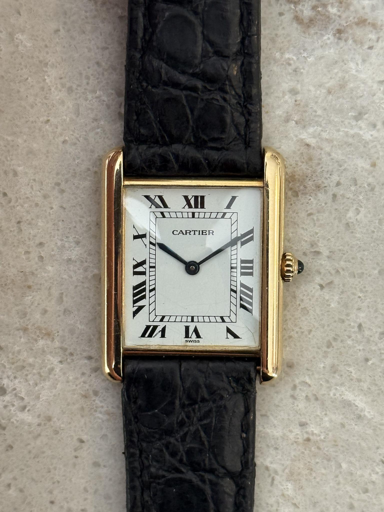Cartier Tank 81052 ref, quartz. This is the 23.5mm solid 18k gold tank louis model, it has a quartz movement that is running and keeping time, the service history is unknown. There is no box or papers. The watch is in good condition with no major damage on the case but some slight surface marks which are not visible during wear. The watch has an enamel dial, with blued hands. There is some small cracking on the dial which should be visible in photos. There is a slight mark at the very bottom of the crystal at about 7 o clock. Not particularly visible during wear and preferable to the opaline dials that came on these models in the later era. It comes on a used de beer strap which could do with replacing, and its original 18k buckle, these buckles were not always hallmarked in this era. now reduced to 5050USD CONUS shipped, which i think makes it the cheapest on the planet at the moment for the larger size solid gold according to any available comps. Item is located in MA at the moment, international shipping available and no trades for now please. Timestamp and pics: [https://imgur.com/a/cartier-tank-18k-9Hqxrib](https://imgur.com/a/cartier-tank-18k-9Hqxrib) Updated timestamp [https://files.catbox.moe/lr2ayk.jpg](https://files.catbox.moe/lr2ayk.jpg) Payment by wire/wise only