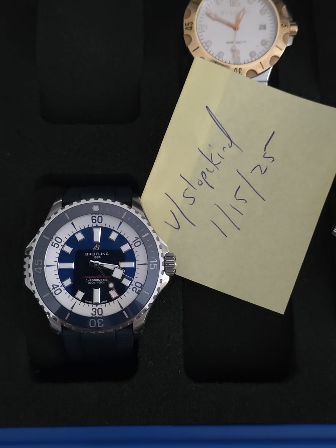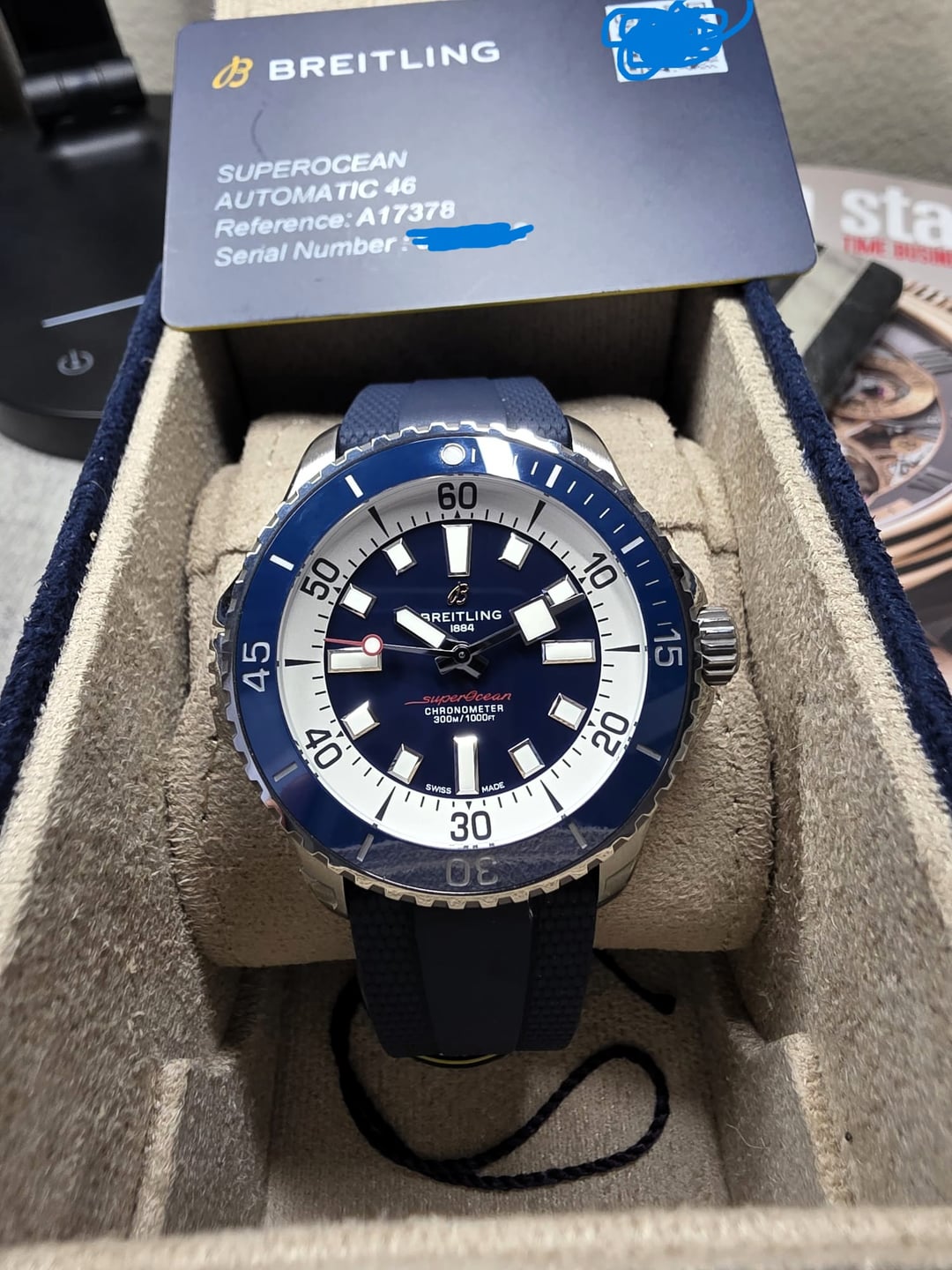 **Breitling Superocean 46** Reference: **A17378** This Breitling Superocean 46 is in excellent overall condition and comes as a **complete set**. The watch shows only **light wear on the clasp**, consistent with careful use. The case, bezel, crystal, and dial are all in very nice shape. A robust and iconic dive watch, the Superocean 46 features a bold presence on the wrist while remaining highly wearable and functional. **Details:** * Case Size: 46mm   * Automatic movement   * Unidirectional rotating bezel   * Screw-down crown   * Water resistant to 2,000 meters / 6,600 feet Price - $3150 shipped Pics & Timestamp - [https://imgur.com/a/byv26bt](https://imgur.com/a/byv26bt) IG = watchfornia Cheers, Adam