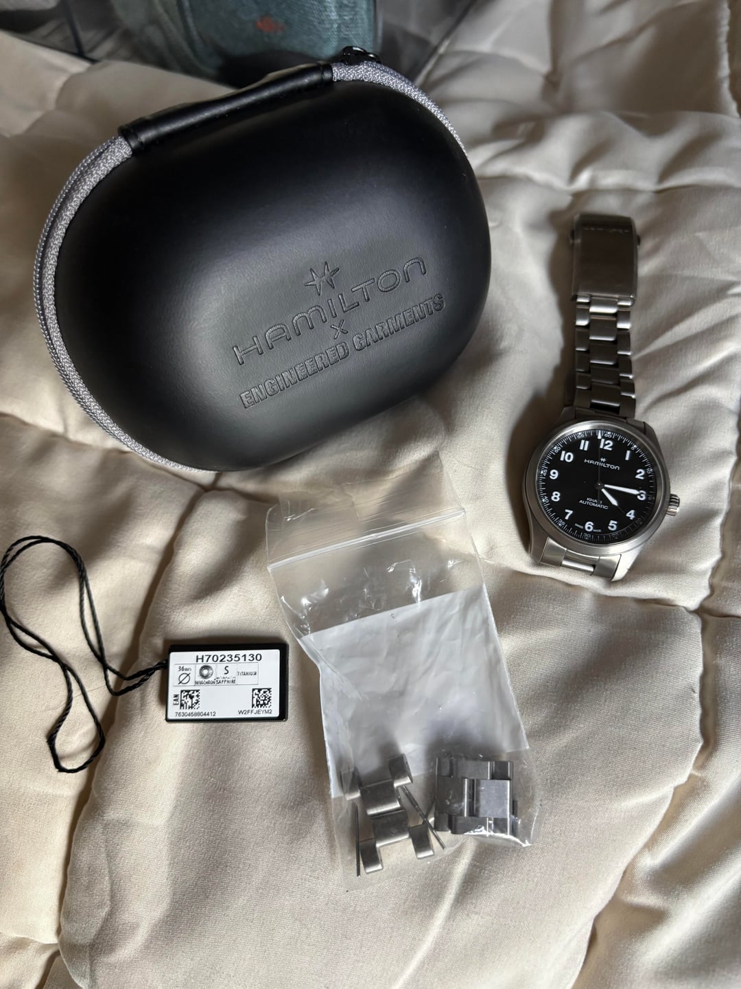**Up for sale is my limited edition Hamilton Engineered Garments 36mm titanium field watch. I bought it when they were released. It’s a great piece but I am consolidating the collection and this one is up for grabs. No more available on the site but you can read about it at the link below.** [**Hamilton Engineered Garments LE**](https://www.hamiltonwatch.com/en-us/engineered-garments?srsltid=AfmBOor92zw8Ii6VM9LC1ZPD_autzoDVM7QkhNV40JJCxGL4FqieFNVx) **Asking $1250. Free shipping CONUS.**