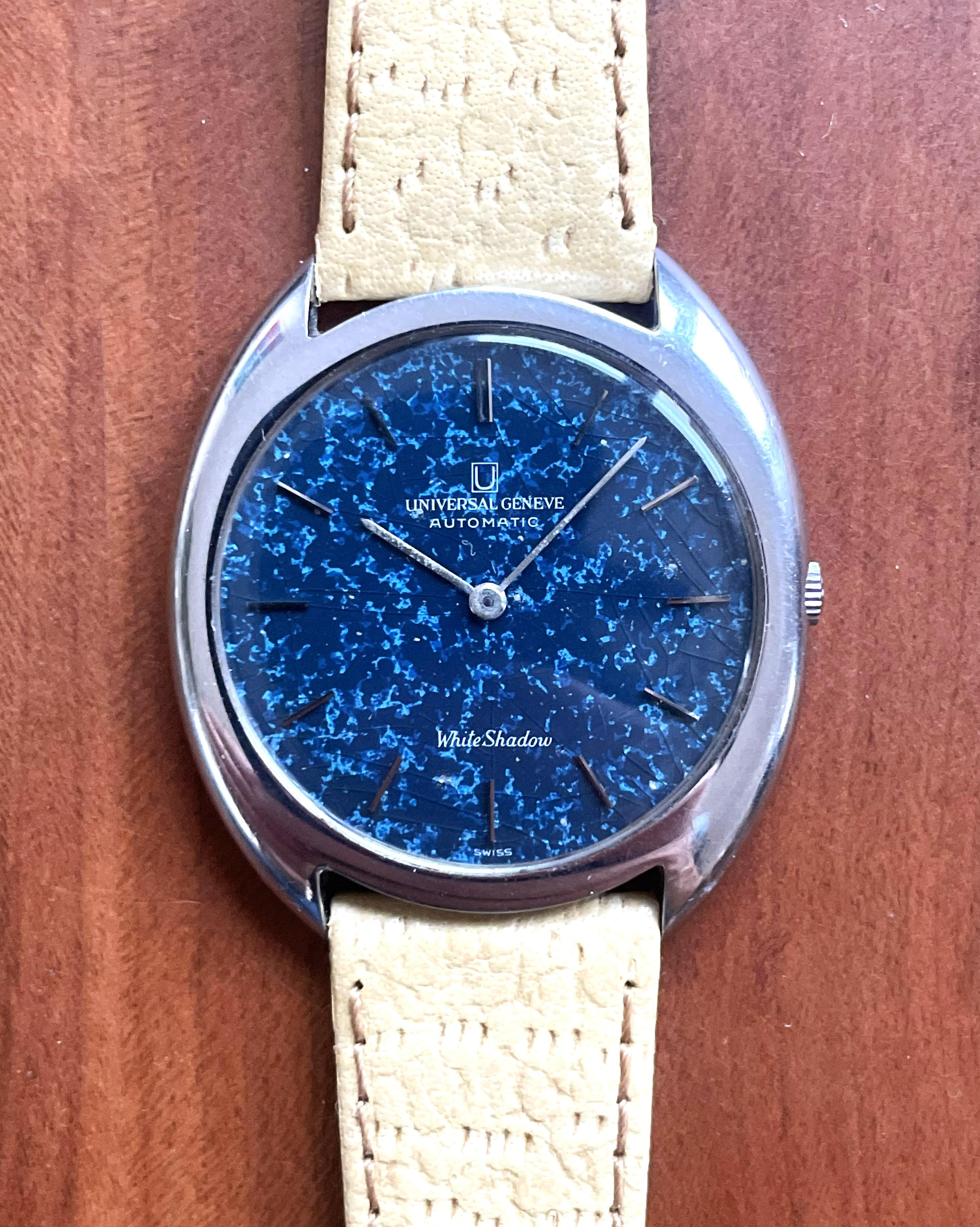 Photos: [https://imgur.com/a/COgNz6Y](https://imgur.com/a/COgNz6Y) For sale is a Universal Genève White Shadow "Starry Night" wristwatch from the 1960s. Case: Case is made of stainless steel and measures 35 mm in diameter and has 6mm thickness. Dial: The watch features a desirable lapis blue lacquered dial. Movement: The movement of this watch is a Universal cal. 1-66 automatic microrotor movement. The cal. 66 was the thinnest automatic movement of its time. ([http://www.ranfft.de/cgi-bin/bidfun-db.cgi?00&ranfft&0&2uswk&Universal\_66\_0&](http://www.ranfft.de/cgi-bin/bidfun-db.cgi?00&ranfft&0&2uswk&Universal_66_0&)) The watch runs and keeps time, however, the service history is unknown. Accessoires: The watch comes on a pig skin strap. Price: I’m asking 1500€ or best offer for this watch. The watch is located in Vienna, Austria. I can offer international shipping. I do have plenty of references on ebay. Please feel free to contact me if you have any questions. Also have a look at my other watches for sale.
