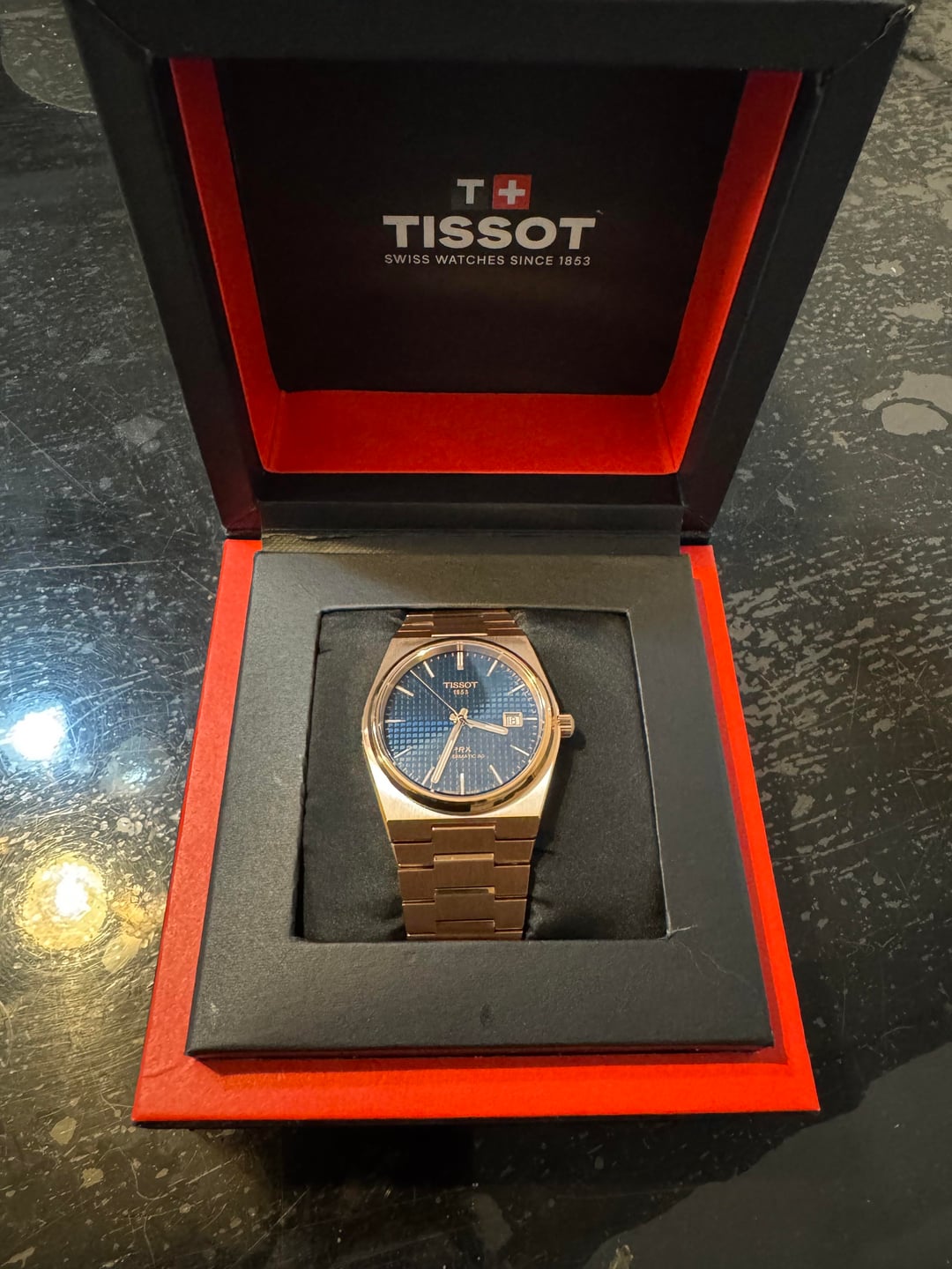 For sale today is a Tissot PRX in rose gold Sharp looking watch the rose gold and blue dial looks like it belongs. This watch is brand new never been worn still has the plastic wrap on it. Reason why I’m selling it is because I was able to buy this with some cash back I got from Bloomingdale’s. Decided to use it all on this. If anyone is interested. Probably gonna keep it if it doesn’t sell in a few days because it is kinda growing on me 860 shipped