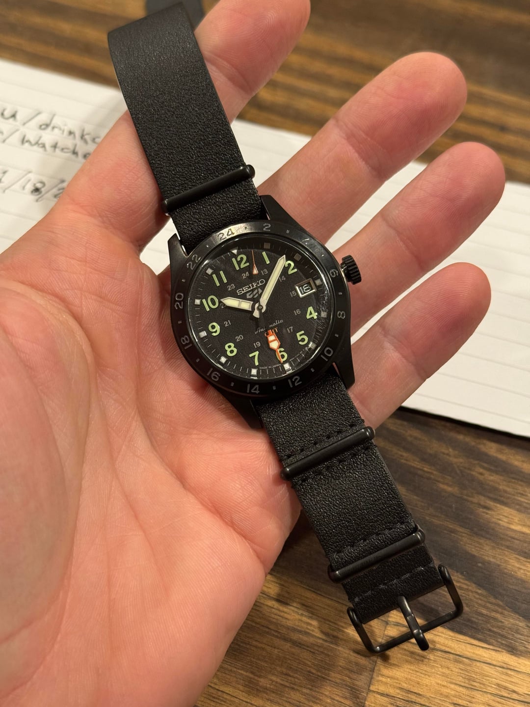 Hello all! Another awesome Seiko up for sale SSK025 Seiko 5 sports field GMT black on leather nato Condition is excellent, leather strap is in great condition like new, as is the watch head. Photos show accurate condition with little or no signs of wear. Also included are two awesome strap options. An oyster style bracelet that matches the black PVD, with glidelock, and a deployment nylon strap with an orange stripe, all straps are incredible on this piece Looking for $400 shipped all together Scope of delivery is watch, original strap, + 2 bonus straps, no box/papers for this one Venmo or PayPal please Shipping from Wisconsin anywhere in the CONUS