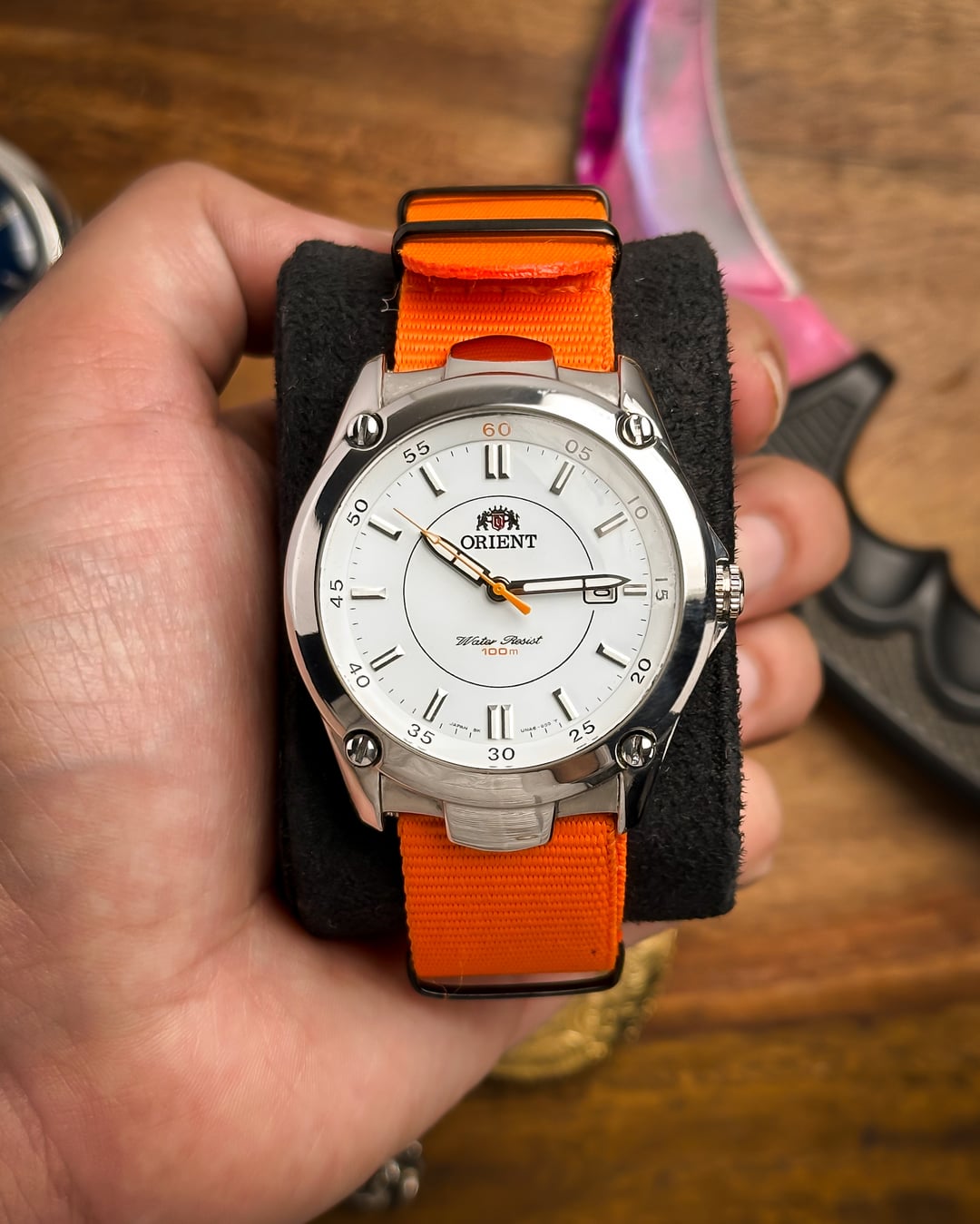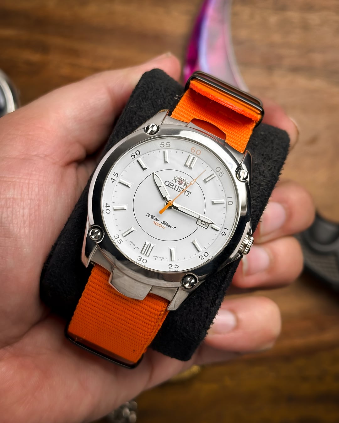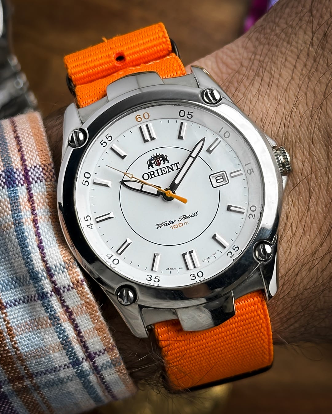 [Timestamp](https://drive.google.com/file/d/11E43uI4n-3AeZbcNu9KiHInCcvvZInAQ/view?usp=sharing) Hey Watchexchange! This is the **Orange Pop**—a nickname we gave this Orient Sports model (Ref: UNA6-C1) to celebrate its vibrant **orange accents** against a crisp white dial, housed in a robust sports case. This watch is a bold and modern piece that is perfect for summer and active wear. The dial is the star: a **beautiful white dial** providing a clean background for the vibrant accents. It features applied **baton lume indices** for excellent visibility. A **circle line** accents the center of the dial. The minute markers are placed at the edge of the dial, and an **inner bezel/chapter ring marks multiples of five** (where the '60' mark is prominently highlighted in **orange**). The **lumed hands** are complemented by a sharp **orange second hand** that terminates in a lume-filled arrow. The case is a robust stainless steel construction with **pronounced, sculptural lugs**. The **fixed bezel** adds to the sporty, tactical look and is secured with **decorative screws** at the four quarter positions. **NOTE ON WATER RESISTANCE:** The original crown at 3 o'clock has been replaced. Due to the crown replacement, while the dial reads "100m Water Resist," we recommend treating the watch as splash resistant only. The watch is highly versatile and comes with **two** vibrant strap options: * An eye-catching **orange NATO strap** * A **two-sided resin strap** with **red stitching**, further enhancing the sporty look. **🔹 Key Dimensions** * Case Diameter: **39mm** * Lug-to-Lug: **45mm** * Thickness: **8mm** * **Lug Width:** **22mm** 💵 **Price: $135 shipped!** 📦 **Payment: PayPal F&F** or G&S (**+4.5% fee by buyer**) or **bank wire (US banks accepted)** 📩 **DM me for more pics or a custom timestamp.** If you're looking for a **bold, high-visibility sports watch** with a unique design and fantastic color scheme, this Orient is an amazing find. Follow my [**Instagram**](https://www.instagram.com/everistwatches/) and **Reddit profile** for more **vintage drops**.