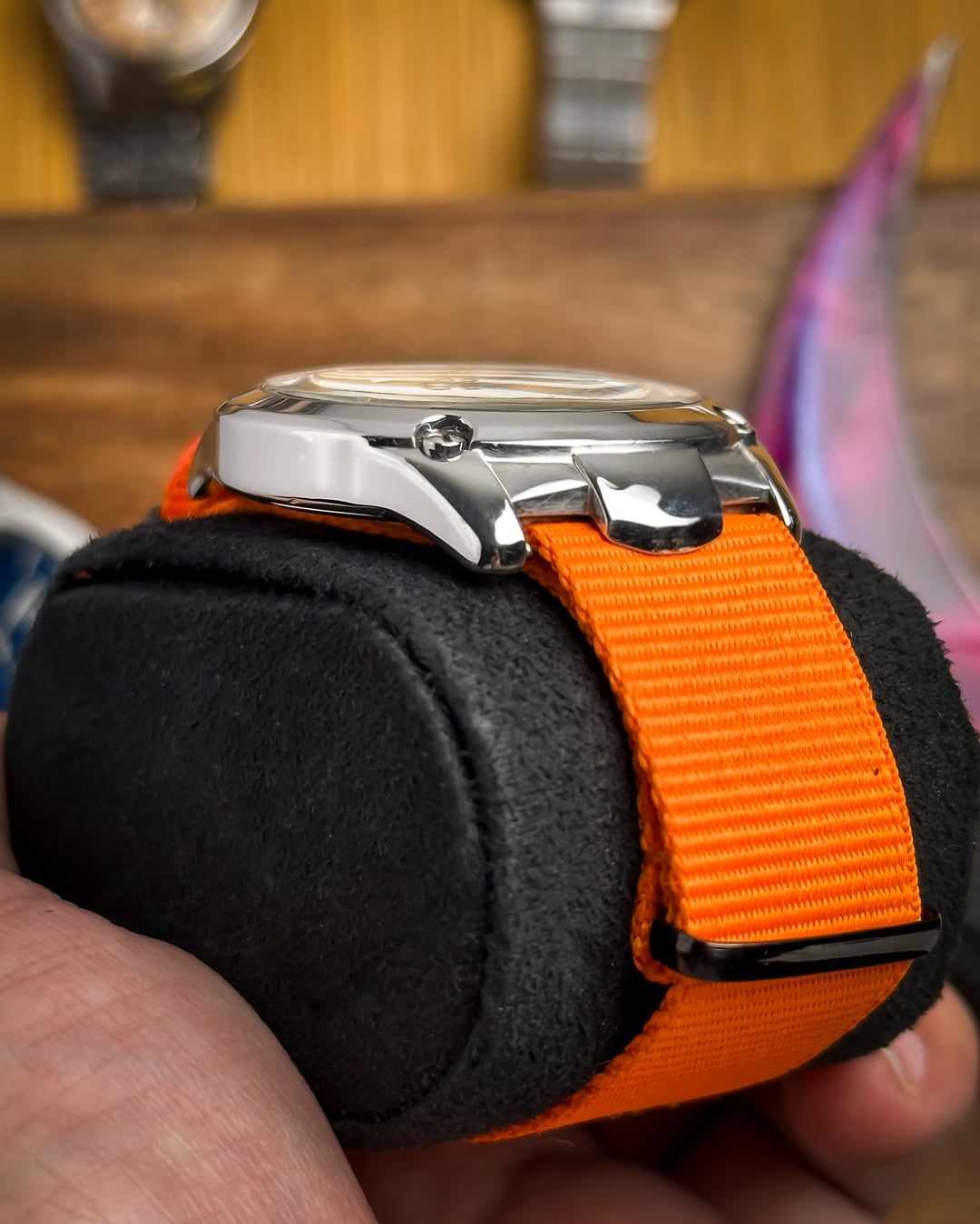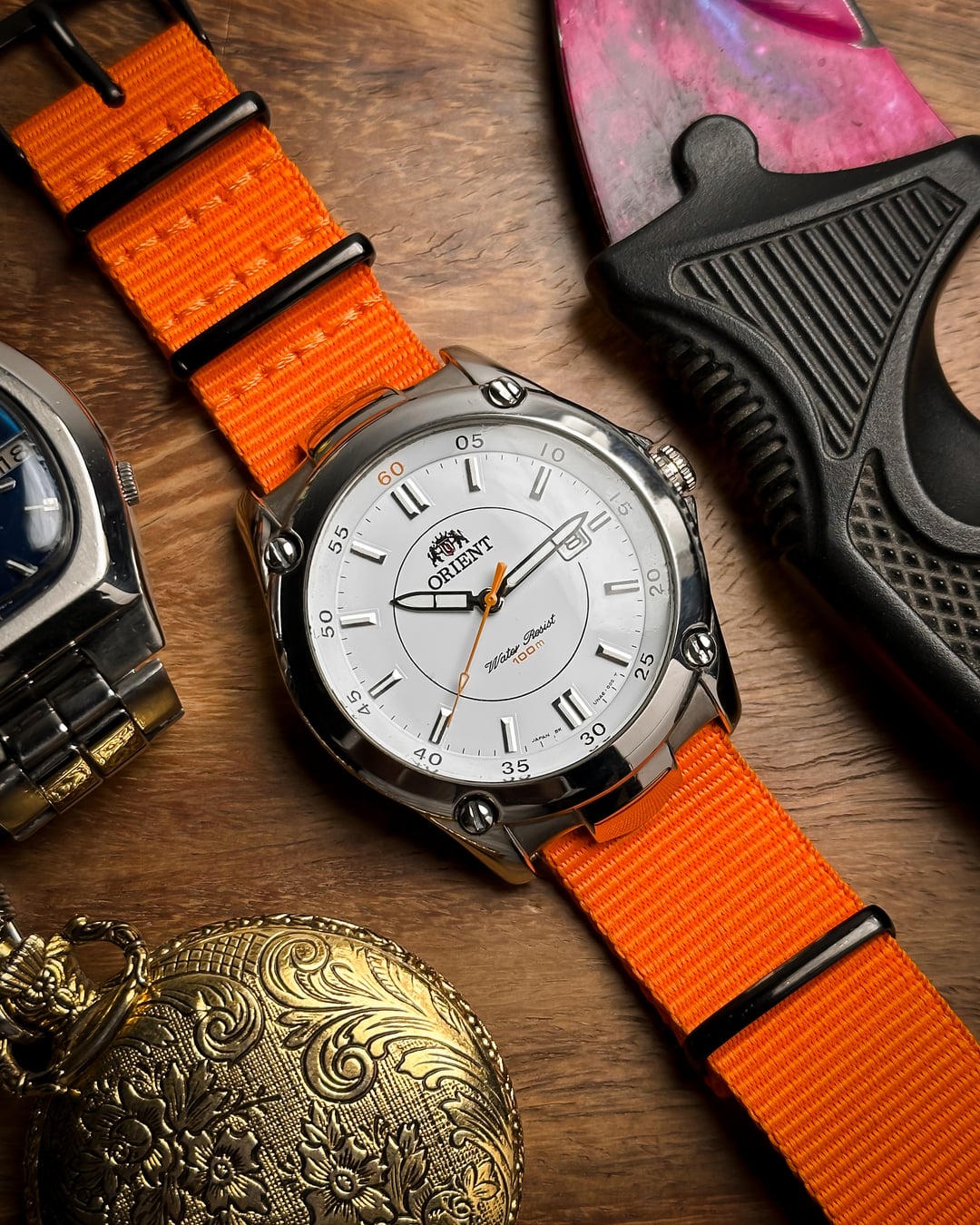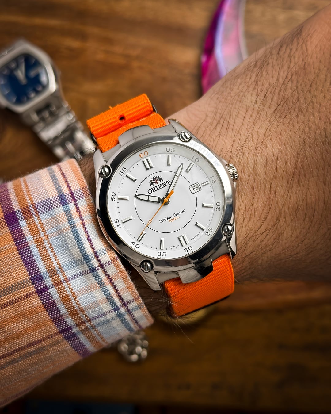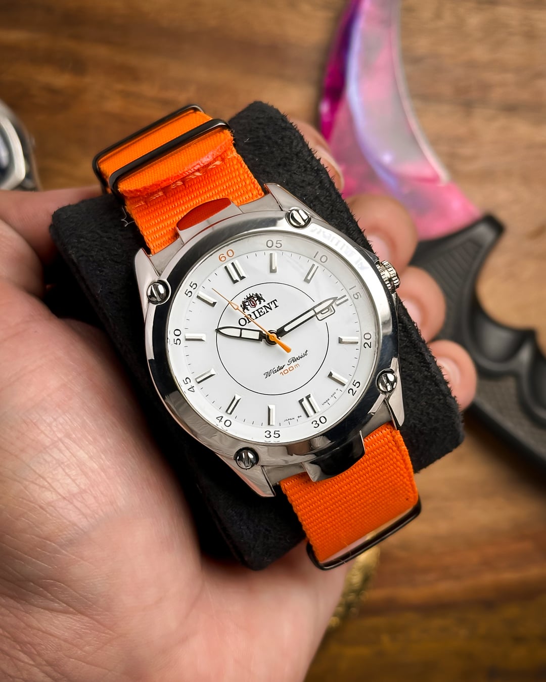 [Timestamp](https://drive.google.com/file/d/11E43uI4n-3AeZbcNu9KiHInCcvvZInAQ/view?usp=sharing) Hey Watchexchange! This is the **Orange Pop**—a nickname we gave this Orient Sports model (Ref: UNA6-C1) to celebrate its vibrant **orange accents** against a crisp white dial, housed in a robust sports case. This watch is a bold and modern piece that is perfect for summer and active wear. The dial is the star: a **beautiful white dial** providing a clean background for the vibrant accents. It features applied **baton lume indices** for excellent visibility. A **circle line** accents the center of the dial. The minute markers are placed at the edge of the dial, and an **inner bezel/chapter ring marks multiples of five** (where the '60' mark is prominently highlighted in **orange**). The **lumed hands** are complemented by a sharp **orange second hand** that terminates in a lume-filled arrow. The case is a robust stainless steel construction with **pronounced, sculptural lugs**. The **fixed bezel** adds to the sporty, tactical look and is secured with **decorative screws** at the four quarter positions. **NOTE ON WATER RESISTANCE:** The original crown at 3 o'clock has been replaced. Due to the crown replacement, while the dial reads "100m Water Resist," we recommend treating the watch as splash resistant only. The watch is highly versatile and comes with **two** vibrant strap options: * An eye-catching **orange NATO strap** * A **two-sided resin strap** with **red stitching**, further enhancing the sporty look. **🔹 Key Dimensions** * Case Diameter: **39mm** * Lug-to-Lug: **45mm** * Thickness: **8mm** * **Lug Width:** **22mm** 💵 **Price: $135 shipped!** 📦 **Payment: PayPal F&F** or G&S (**+4.5% fee by buyer**) or **bank wire (US banks accepted)** 📩 **DM me for more pics or a custom timestamp.** If you're looking for a **bold, high-visibility sports watch** with a unique design and fantastic color scheme, this Orient is an amazing find. Follow my [**Instagram**](https://www.instagram.com/everistwatches/) and **Reddit profile** for more **vintage drops**.