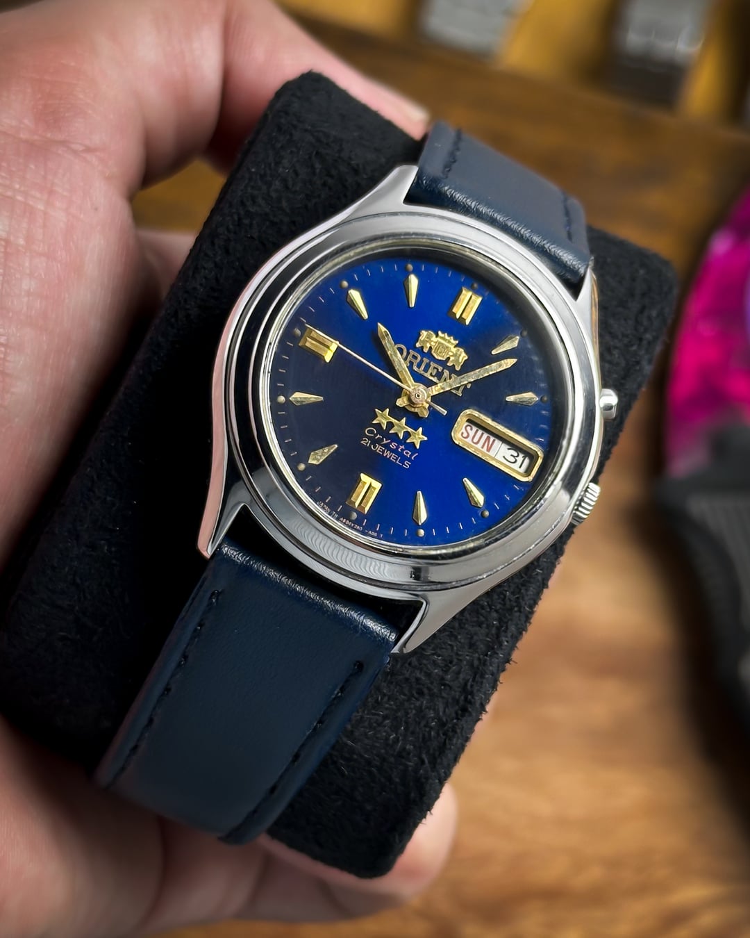 [Timestamp](https://drive.google.com/file/d/1TyzTp3v5ZRQ1zWuMfi-T686F8gXf5bYH/view?usp=sharing) Hey Watchexchange! Today I’m offering a stunning piece of 90s Japanese watchmaking: the **Orient Tri Star "Crystal."** While Seikos are often utilitarian, this Orient leans into a more regal, luxurious aesthetic with a dial that truly steals the show. The **Sunburst Royal Blue dial** is incredibly dynamic, shifting from a deep navy to a brilliant azure as it catches the light. It features a sophisticated layout with **gold-tone dagger indices** and **double-baton markers** at the 12, 6, and 9 positions. The classic **gold pencil hands** and the iconic applied **three stars** and Orient crest give this watch a rich, high-end presence. The case is a **perfectly round, polished** design with elegant, flowing lugs that hug the wrist comfortably. True to the classic Tri Star movement, you have the standard **crown at 3 o'clock** and the signature **quick-set date pusher at 2 o'clock**, adding a tactile, vintage feel to the operation. I have paired this with a **new plain blue leather strap** that matches the dial perfectly, creating a unified, bold look that works as well with a suit as it does with a crisp white shirt. **🔹 Key Dimensions** * **Case Diameter:** 37mm * **Lug-to-Lug:** 43mm * **Thickness:** 11mm * **Lug Width:** 18mm 💵 **Price: $125 shipped!** 📦 **Payment: PayPal F&F** or G&S (**+4.5% fee by buyer**) or **bank wire (US banks accepted)** 📩 **DM me for more photos or a custom timestamp.** If you're looking for a vibrant blue dial with a bit more "soul" and flair than a standard Seiko, **The Royal Regency** is a fantastic choice. Follow my [**Instagram**](https://www.instagram.com/everistwatches/) and **Reddit profile** for more **vintage drops**.