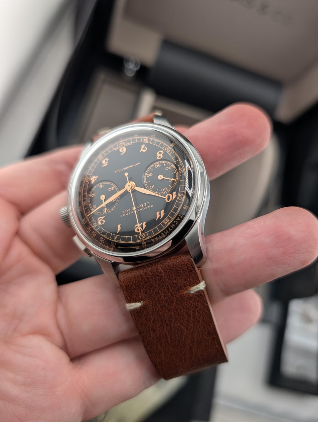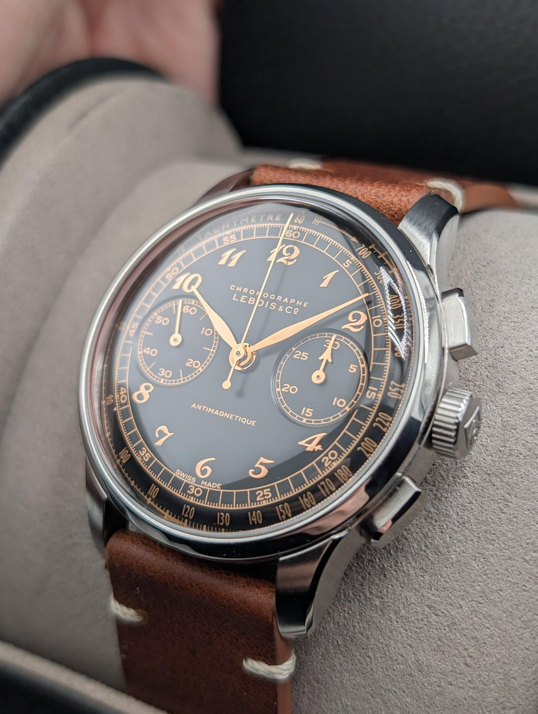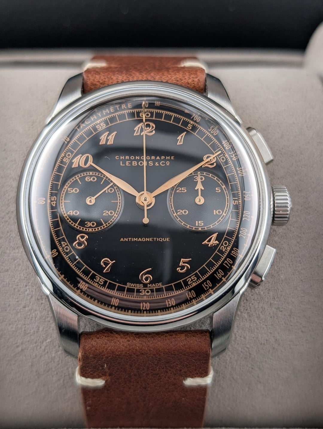 Selling my Lebois & Co Heritage Chronograph, style #324.406. Lebois calls this reference 'Script' because of the Breguet numerals on the dial. Watch is in excellent 99% condition, lightly worn, with the only signs of wear being a couple of very faint hairline scratches on the high-polished bezel. The scratches don't show up well on camera and aren't deep enough to feel with a fingernail. No dents, dings, or damage. Full kit with box and papers, 2024 warranty. Comes with an extra Lebois & Co suede brown strap and buckle. I'm the original owner, selling because I've only worn this watch 4 or 5 times in the time I've owned it. This watch has excellent wearable dimensions for a mechanical chronograph if you have medium or small sized wrists, with a 39mm case width, 47mm lug to lug, and 13mm thick. Asking for $2400 net to me shipped insured, US seller looking for US sales only. Not looking for trades. I accept payment through wire, Zelle, or Paypal (F&F only unless you have significant transaction feedback). I mostly sell on eBay where I have 100% positive feedback with over 1000 transactions, which I'm happy to prove to anyone worried about buying from me. Timestamp: [https://imgur.com/a/RDmXjc5](https://imgur.com/a/RDmXjc5)