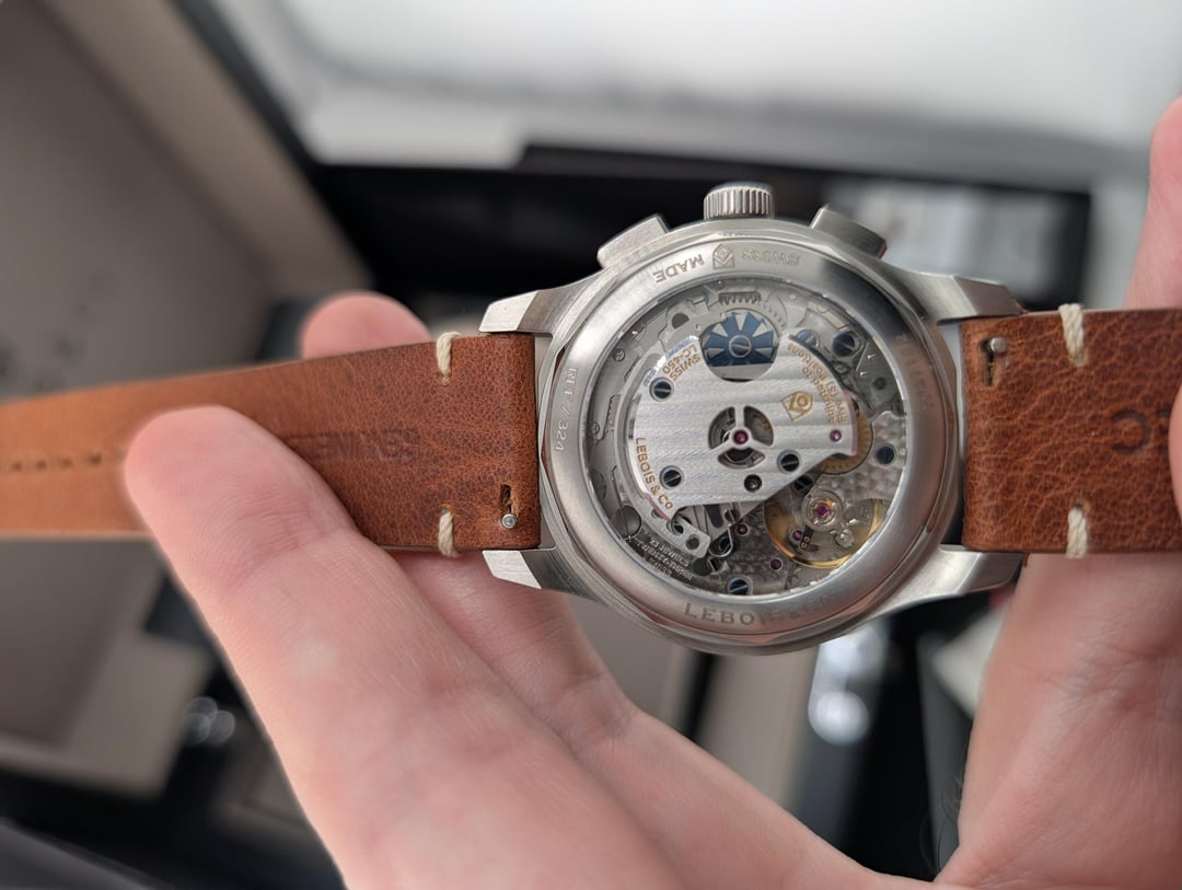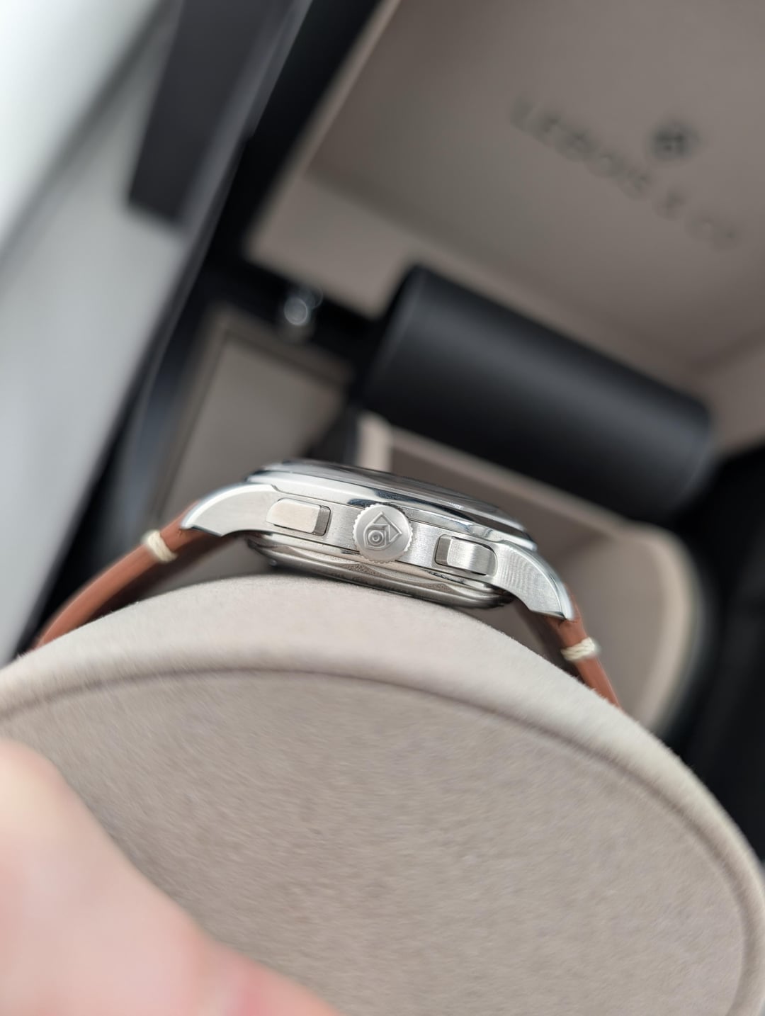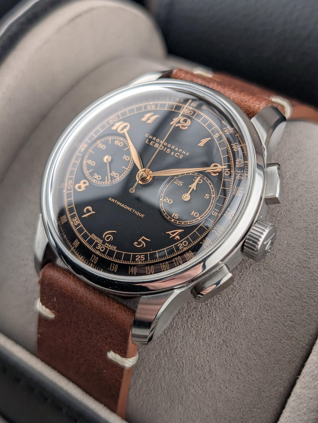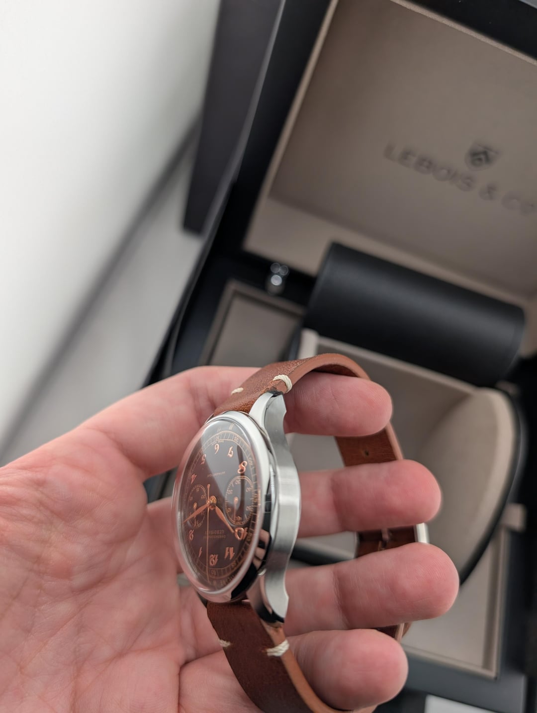 Selling my Lebois & Co Heritage Chronograph, style #324.406. Lebois calls this reference 'Script' because of the Breguet numerals on the dial. Watch is in excellent 99% condition, lightly worn, with the only signs of wear being a couple of very faint hairline scratches on the high-polished bezel. The scratches don't show up well on camera and aren't deep enough to feel with a fingernail. No dents, dings, or damage. Full kit with box and papers, 2024 warranty. Comes with an extra Lebois & Co suede brown strap and buckle. I'm the original owner, selling because I've only worn this watch 4 or 5 times in the time I've owned it. This watch has excellent wearable dimensions for a mechanical chronograph if you have medium or small sized wrists, with a 39mm case width, 47mm lug to lug, and 13mm thick. Asking for $2400 net to me shipped insured, US seller looking for US sales only. Not looking for trades. I accept payment through wire, Zelle, or Paypal (F&F only unless you have significant transaction feedback). I mostly sell on eBay where I have 100% positive feedback with over 1000 transactions, which I'm happy to prove to anyone worried about buying from me. Timestamp: [https://imgur.com/a/RDmXjc5](https://imgur.com/a/RDmXjc5)
