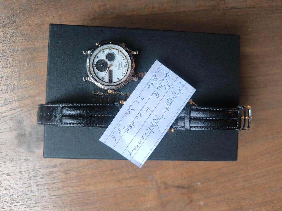 Hi all, For sale my Seiko Age of Discovery 6m23-8000 Intelligent Calendar in stainless steel (quite rare compared to the gold version which is already quite rare). The watch comes with the original strap (in the pictures I had it on another watch on display as this one was receiving a service). The strap was stored with care and hasn't dried out and is in like new condition. Service history and Functions: The watch was just serviced (this January) and all functions are working as they should (can make a video or do FaceTime upon request). Condition: The watch has some very light hairline scratches from minimal use but besides that it remains in excellent condition. No deep scratches or marks, no dents, no discoloration. Price: $675 + shipping with strap or $575 + shipping without strap. Shipping: I ship worldwide with track&trace, signature for delivery and insurance. Shipping prices are minimum $20 (for EU) and maximum $45 (for USA), ask me for a quote anytime. Payment: Paypal (G&S for anyone with at least 1 transaction, F&F for anyone without a single transaction or reference).
