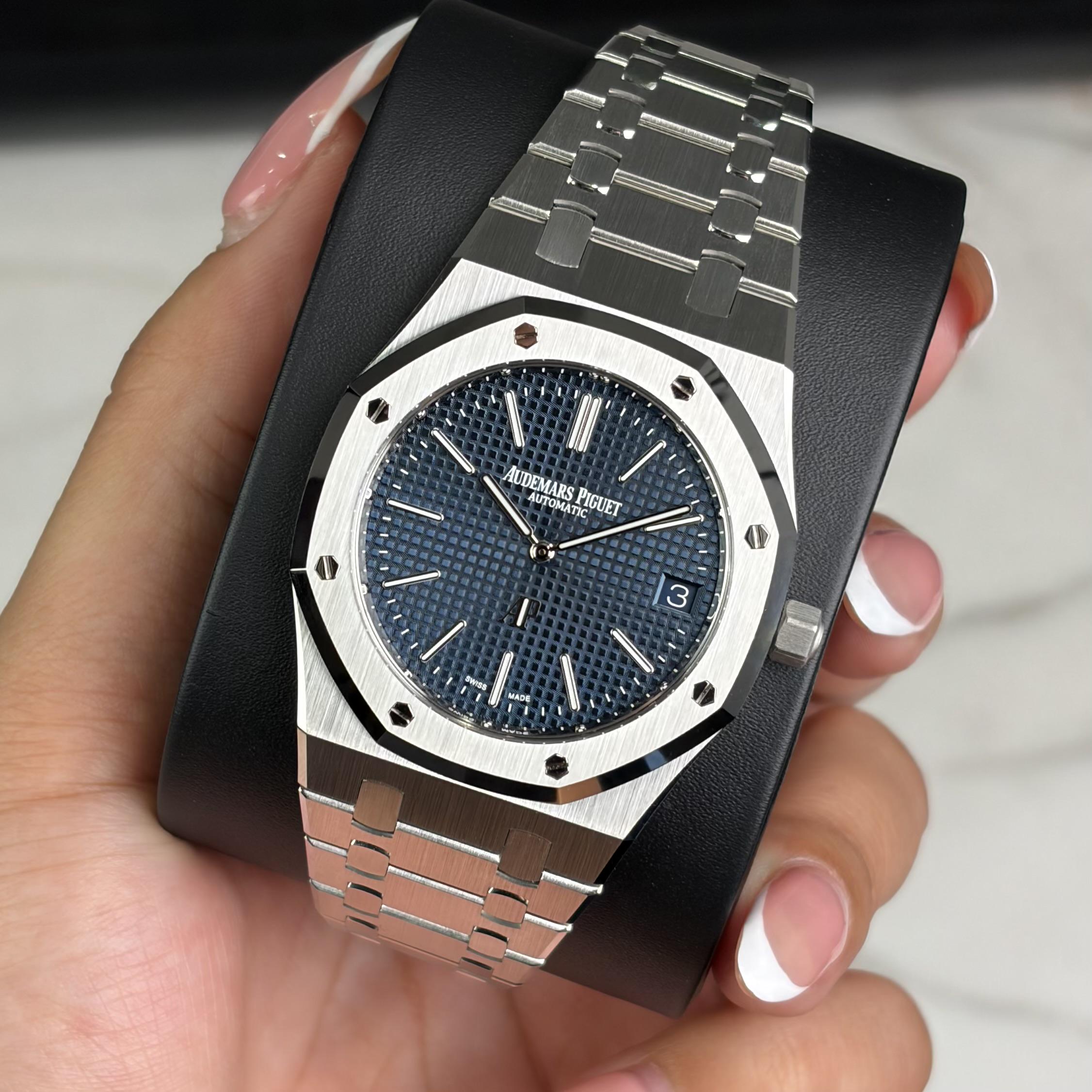 Timestamp: https://imgur.com/a/OgpLQJO Album: https://imgur.com/a/TZs0j7S ________________________________________________________________________________________ The Audemars Piguet Royal Oak “Jumbo” Extra-Thin 16202ST (2025) is the purest expression of the Royal Oak legacy, featuring the iconic blue “Petite Tapisserie” dial and ultra-slim stainless steel case. Powered by the in-house ultra-thin automatic movement and finished with the signature integrated bracelet, it offers unmatched elegance and collectibility. This example is brand new and comes complete with its original box and papers This watch measures 39mm diameter, 48.6mm lug to lug, and 8.1mm thick. **Condition:** Brand new condition. See pictures for the most accurate representation of condition. **Includes:** This example comes as a complete set with its original box, papers and accessories. _________________________________________________________________________________________ **Price:** **90,000** **Shipping:** Free shipping to US addresses! I'm willing to ship internationally at an additional cost to the buyer. *Local pickup available at our Scottsdale, AZ office. Sales tax may apply.* **Payment:** Wire, Zelle, Crypto, or CC (with 4% fee). **Trades:** Yes, open to trades up or down for modern Rolex, AP, or Patek Philippe. Thank you for your consideration and feel free to reach out with any questions! -Aneisa