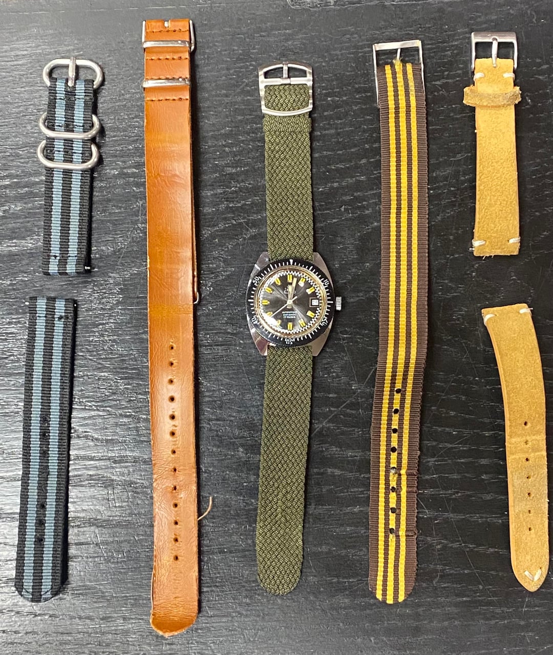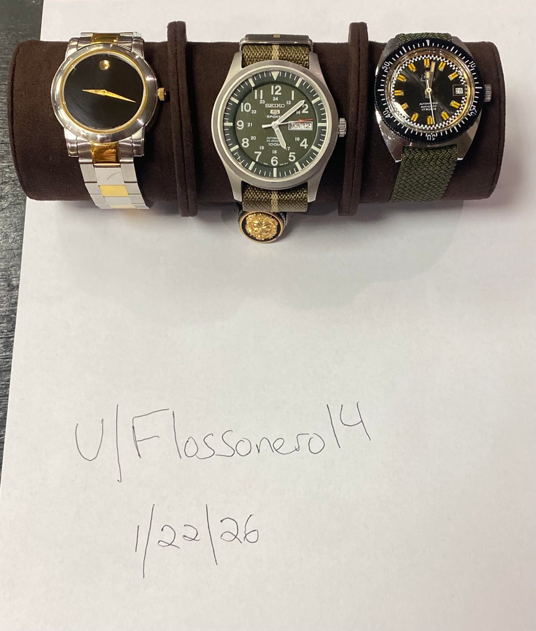 Hello and thanks for checking out my post. I am selling a few of my early watches as I make new purchases for my own collection. I price them reasonably and assume shipping costs to CONUS. 1. Seiko SNZG09K1 Field Automatic - This was my very first purchase and the watch that started it all for me. It has a display case back and a distinctive field/military aesthetic. At 42mm it’s a large watch but with a relatively short lug to lug and light weight, it wears rather well. Included is the original army green two piece canvas strap as well as the single pass NATO pictured here. Asking 150 OBO. 2. Movado Museum Heritage - This watch was a gift and my go to dress watch for a long time. Despite having a historic Swiss lineage, Movado is some what maligned as a mall watch in enthusiast communities. However, I believe they became popular because of their distinct and elegant designs. In a world of vintage redux and homage watches, there is no mistaking a Movado. At 38mm it wears very comfortably and is an elegant dress watch. It would even wear nicely for some ladies and good make a good gift. I am asking 299 OBO. 3. RB Skin Diver (1971) - I bought this skin diver from a watch shop in France and wore it a ton at first. Now however it gets very little time on wrist and deserves a new home. I have never seen one like it and all my research efforts have turned up nothing. A bi-directional Bakelite bezel and the real patina make this a unique watch. It’s what some people call a strap monster and I am including all the straps pictured here with your purchase. I’m asking 399 OBO. Please feel free to message me with any questions or for more pictures. Thanks for looking!