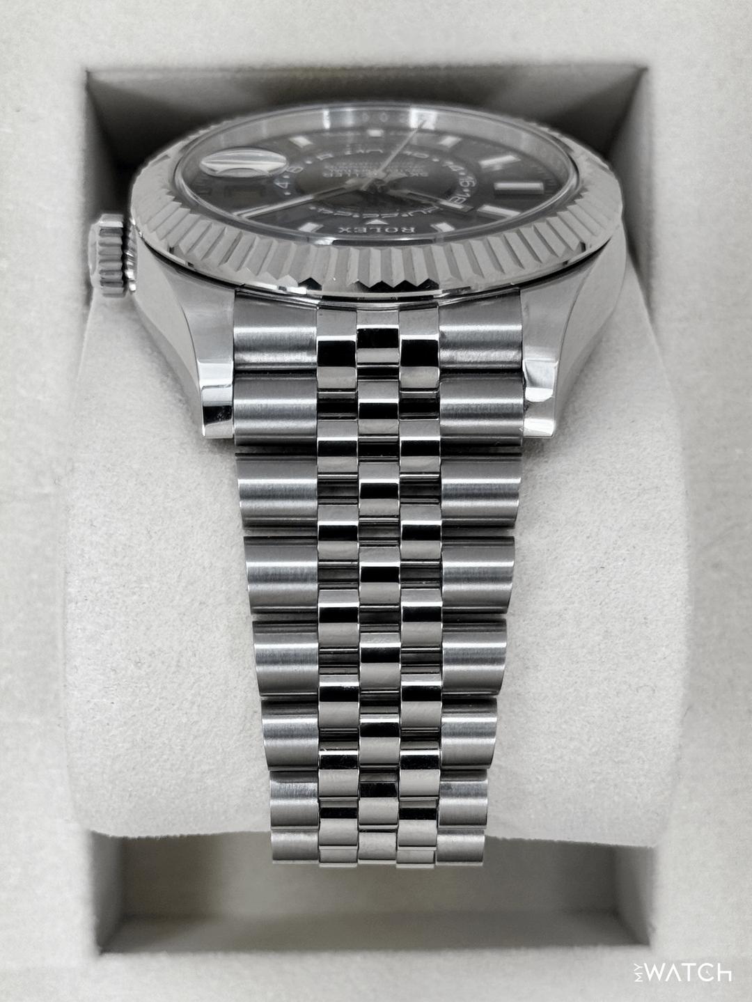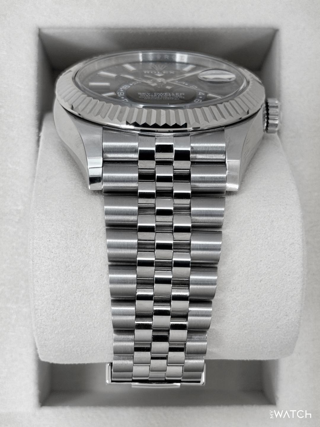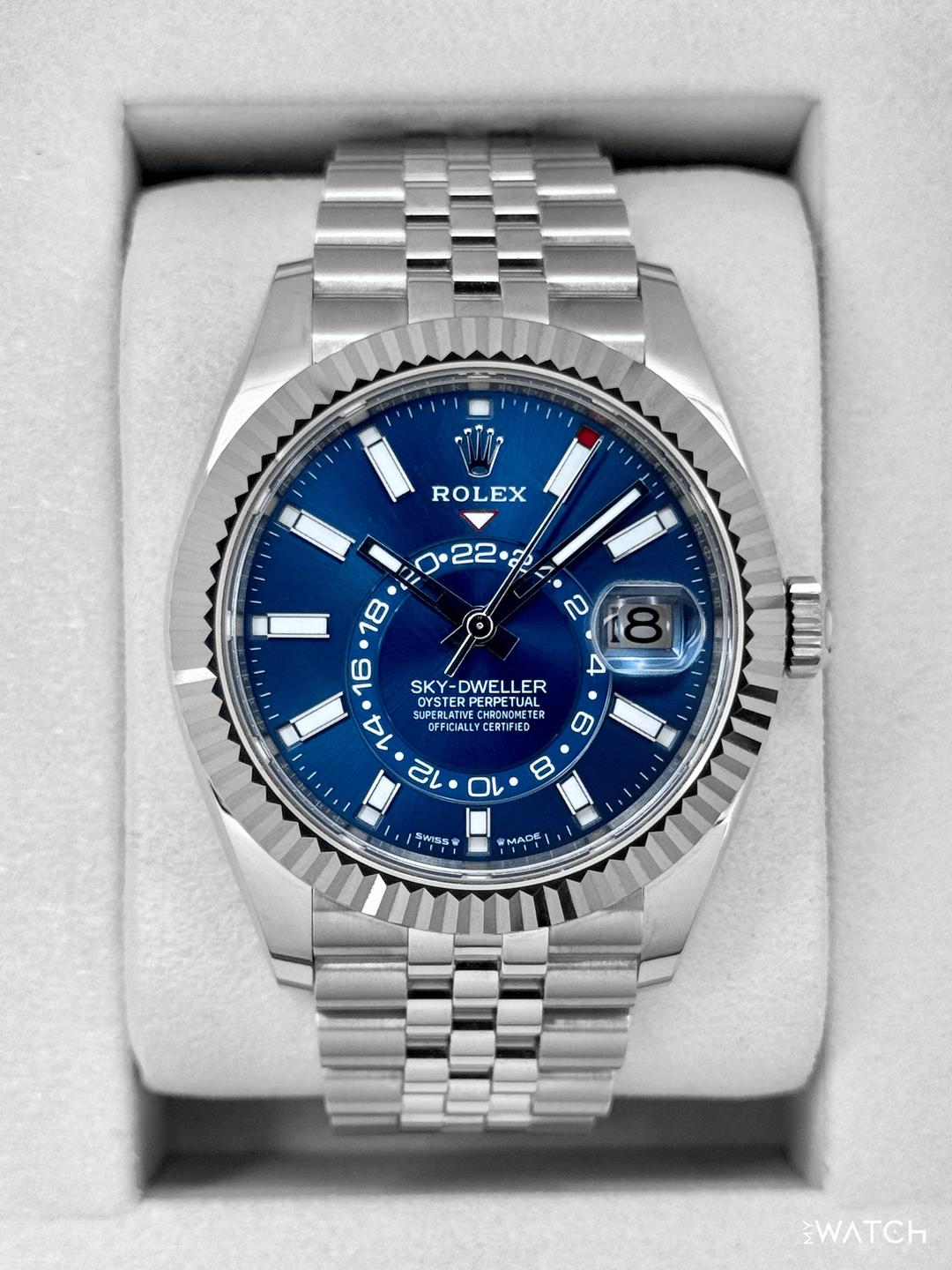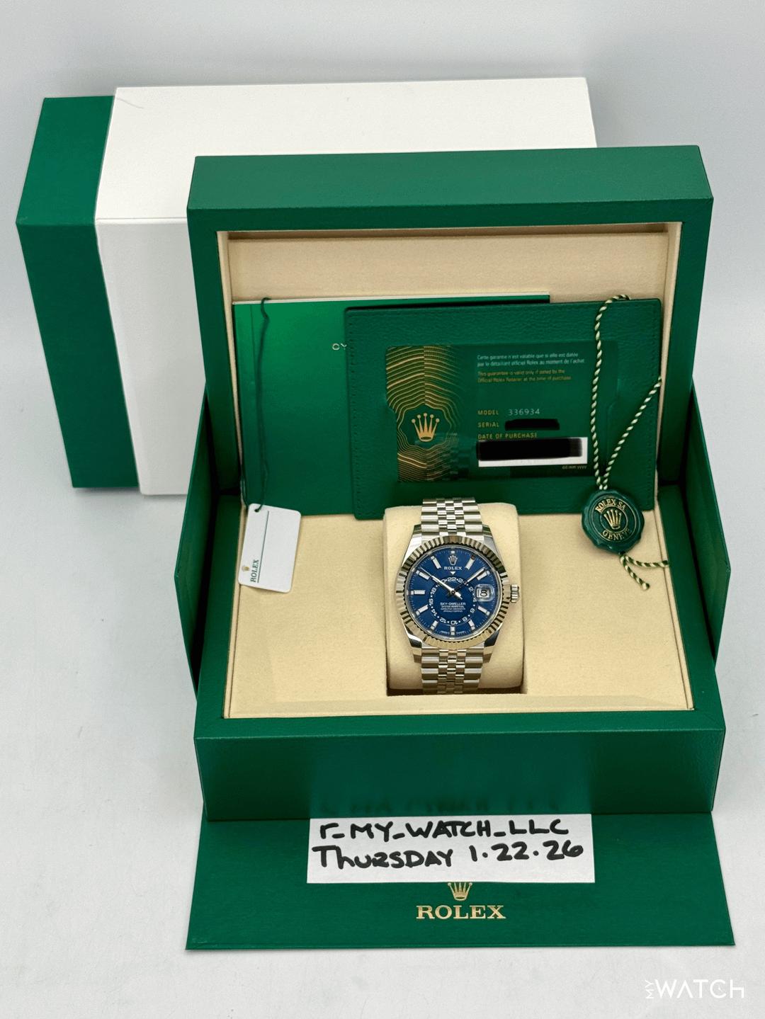 🔵**2025 Rolex Sky-Dweller 42mm 336934 “White Rolesor” Oystersteel and 18kt White Gold Fluted Bezel Jubilee Bracelet Blue Dial** 🔵**TRADE or SELL us your luxury watch, all brands considered. Message me details.** **Includes the following:** **✔️BRAND NEW 2025 UPDATED ROLEX BOX! (DOUBLE BOXED)** **✔️Box and Papers - Yes** **✔️Warranty card dated September 2025** **✔️5 year manufacturer warranty** **✔️Manual and Warranty booklets** **✔️Green and White Hang Tags included** **✔️Size: 7.75inch wrist (Full Links)** **✔️Watch is in excellent overall condition. Please see photos for details.** **✔️**[**Trades**](https://mywatchllc.com/pages/sell-rolex-watch) **welcome** Business Name: **My Watch LLC** LOCATION: Oak Park, Michigan ✔️[MyWatchLLC.com](http://mywatchllc.com/) for current inventory ✔️Google Business Listing [https://g.co/kgs/Cmd6FPW](https://g.co/kgs/Cmd6FPW) ✔️Business Hours M-F 9-6 ✔️Facetime/Video chat/calls welcome to view the watch interested. ✔️Contact: 248-422-0909 via text or call for quickest response. 🟢TERMS: Visit [MyWatchLLC.Com](http://mywatchllc.com/) for payments accepted 🟢REFERENCES/REVIEWS: We are well reviewed on all platforms from google, trust pilot, rolexforums, additionally we have 300+ reference in multiple FaceBook watch groups, reference checks welcome. 🟢SHIPPING: If you are not local, we offer Fully Insured FedEx overnight shipping in the USA for a fee. International shipping available. [https://mywatchllc.com/products/2025-rolex-sky-dweller-42mm-336934-jubilee-blue-dial](https://mywatchllc.com/products/2025-rolex-sky-dweller-42mm-336934-jubilee-blue-dial)