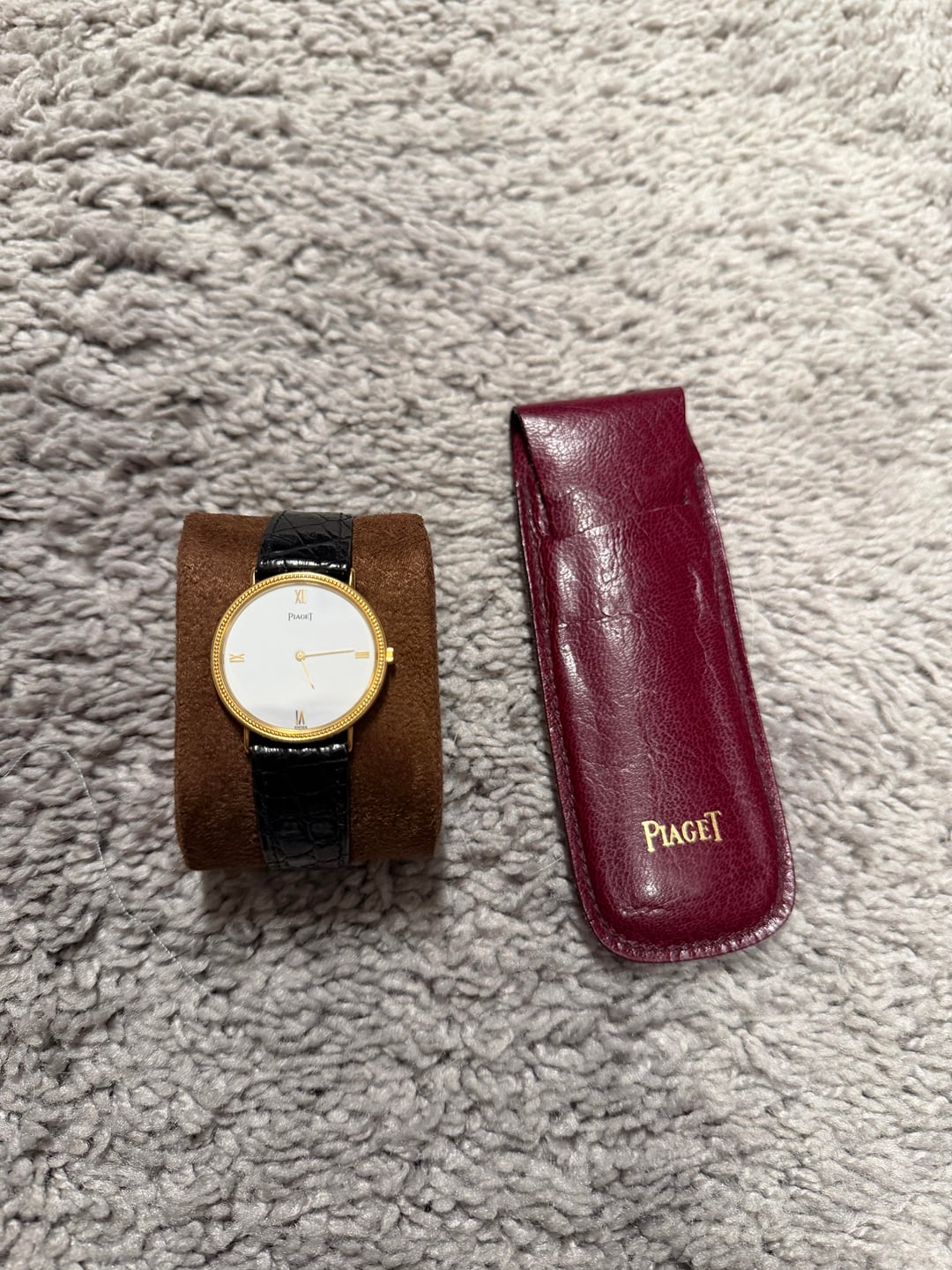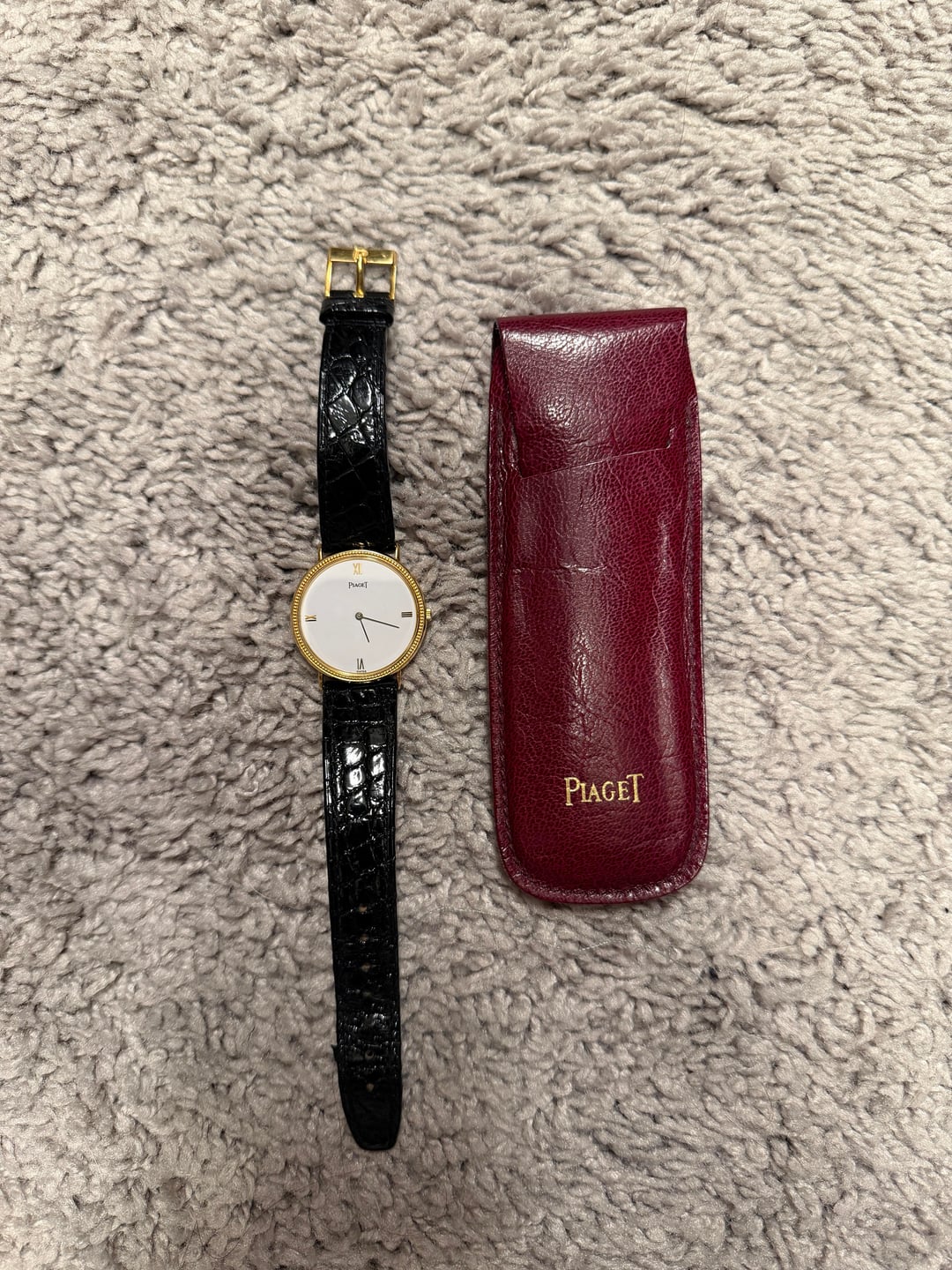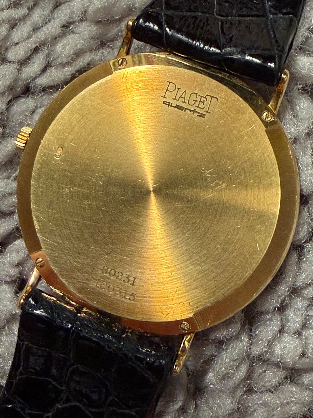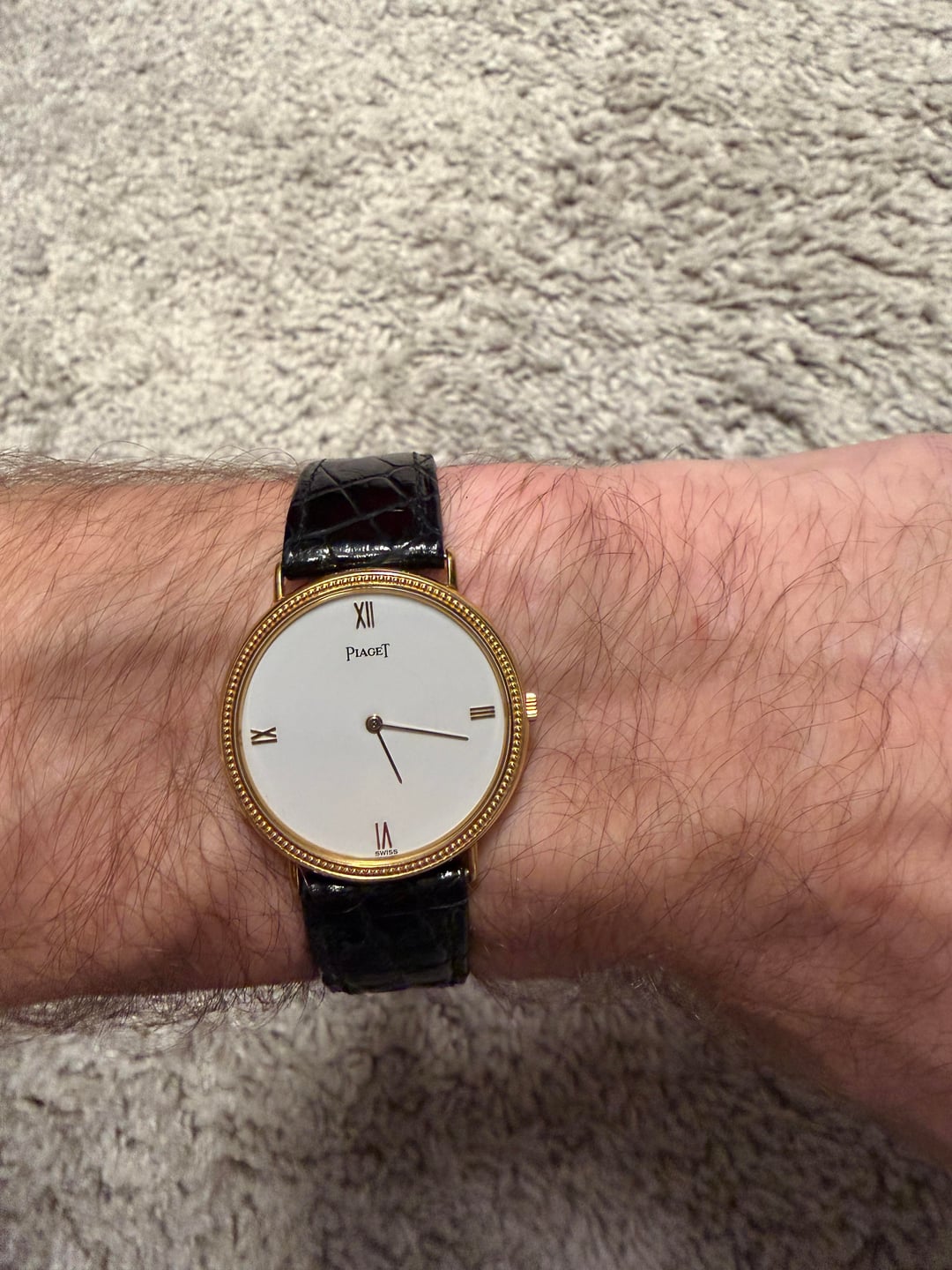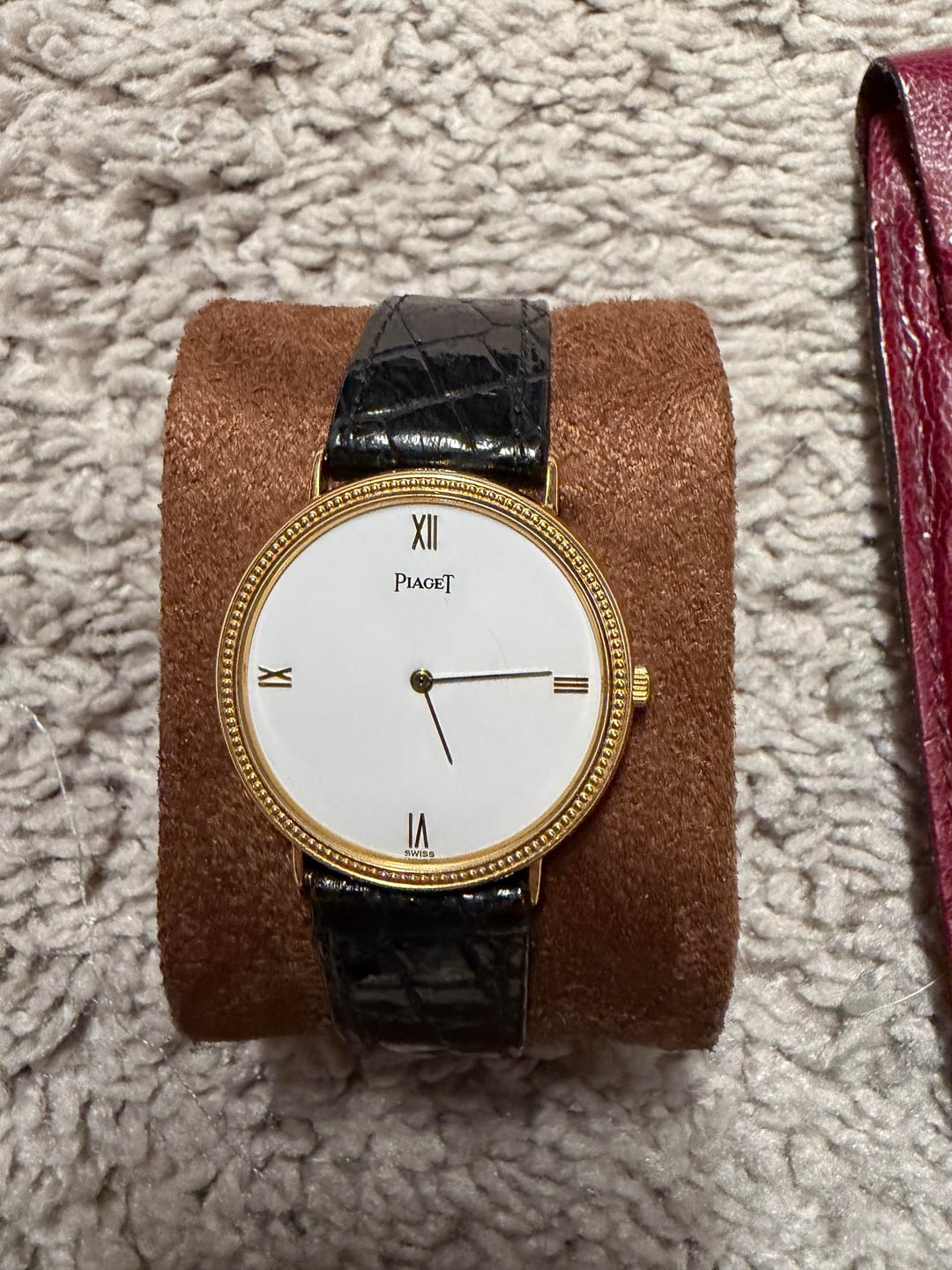 |Asking $3000 --- Piaget 80231 in excellent condition, especially for its age, manufactured in approximately 1988.This watch features a 31mm (34mm lug to lug) 18k yellow gold case, approximately 4mm thick, and an elegantly clean white dial matched with a black leather strap (17mm lug width) and yellow gold buckle clasp. It utilizes Piaget's 8P2 quartz movement, with 10 jewels and a 32,768 Hz frequency which keeps excellent time at around +10s / -10s per day. This watch is often listed as part of the Piaget "Tradition" or "Dancer" lines, though its manufacture predates when Piaget began giving their models proper names. The dial and crystal are completely unmarred in mint condition, and the beaded 18k yellow gold bezel is in excellent condition without any scuffs or scratches perceivable to the naked eye. The sides of the case have minor marks mostly only perceivable when held to catch the glare of a light and up close to your face. The caseback and matching yellow gold buckle have minor wear consistent with occasional use and most likely being laid on a nightstand or something similar after use. The leather strap does show some signs of wear at its edges but is in fully working condition and presents in good condition from the outward facing side on your wrist. This watch is especially perfect for tuxedo or dress wear, with its exceptionally thin case sliding easily under the cuff of a sleeve without any adjustment or fuss. These particular Piagets in this configuration are rare and very difficult to find. Searching the internet returns that only a few appear at auction or online for sale per year, and they are almost never in this condition. I don't have the original box or papers, however it does come with a leather Piaget watch sleeve as pictured and was seen by a trusted dealer (Lee Michaels Fine Jewelry, receipt in photos) on Jan 16, 2026 and inspected by the watchmaker who confirmed his belief that it is all original parts and authentic, as well as installing a fresh battery. My wrist is 7.25 inches as pictured wearing the watch for reference. I am using the 4th hole which is the middle hole, so the strap is suitable for a wrist approximately 6.25 inches to 8-8.25 inches.Expanded details:Brand: PiagetModel: 80231 (Commonly listed as "Tradition" or "Dancer" line)Year of Manufacture: Approximately 1988Tech. Reference Number: 80231Movement: 8P2 QuartzJewels: 10Frequency: 32,768 HzAccuracy: +10s / -10s per dayCase: 18k yellow goldCase width: 31mmThickness: 4mmLug to Lug: 34mmLug width: 17mmCrystal: SapphireBezel: Beaded 18k yellow goldDial: White with roman numerals at 12, 3, 6, and 9Hands: 18k yellow goldBracelet: Black leather with 18k yellow gold claspNotes: Excellent condition, ultra thin dress watch with no visible marks on the crystal, dial, and bezel, and barely noticeable signs of wear on the sides and back of the case and clasp. No original box or papers, but it does come with a leather Piaget watch sleeve and was recently seen (Jan 16, 2026) by the watchmaker at my local TD who found no evidence or reason to believe that it was anything other than authentic with all-original components and installed a fresh battery.| |:-|