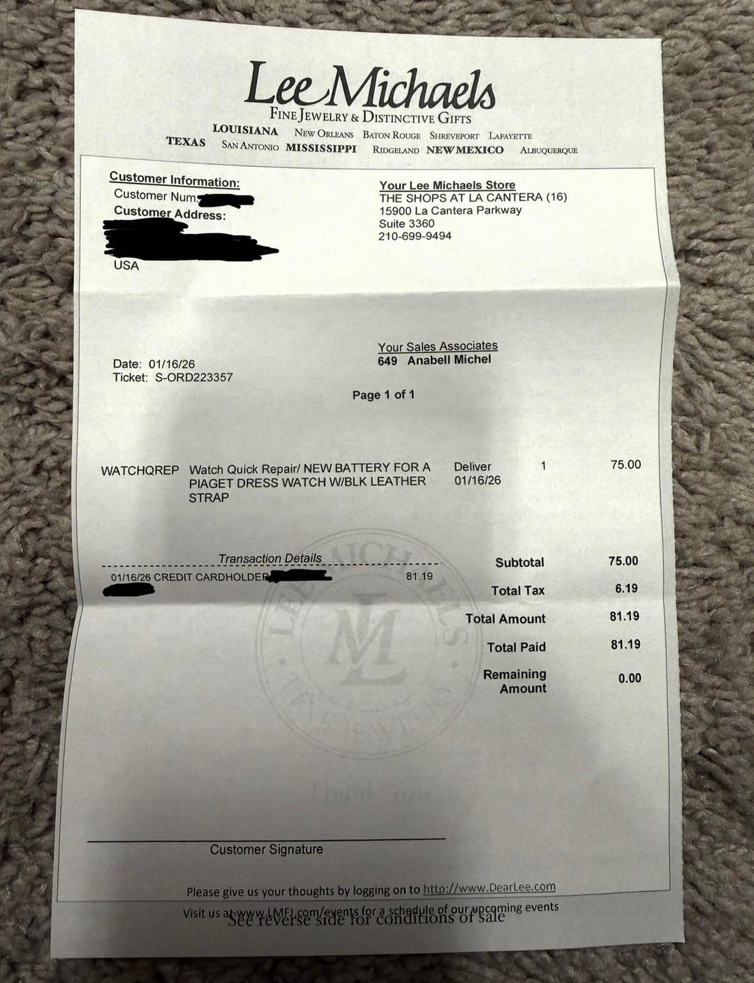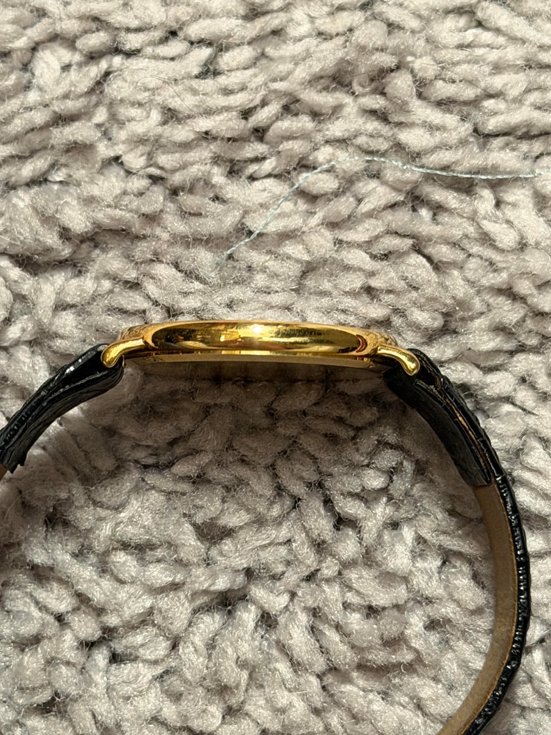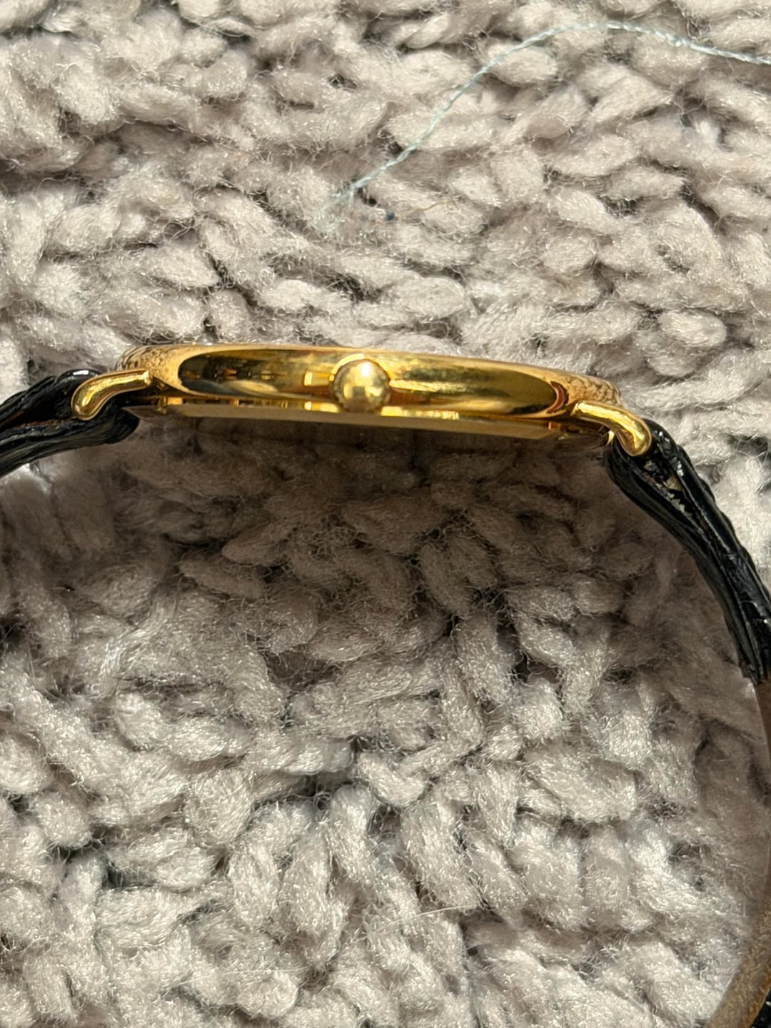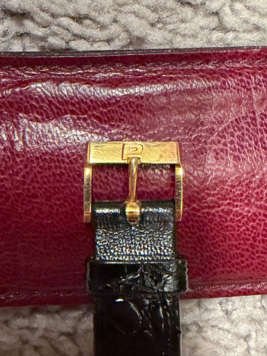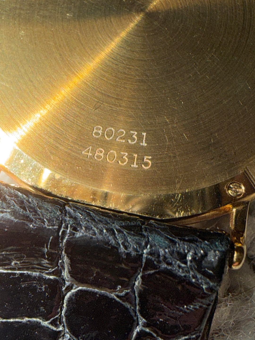 |Asking $3000 --- Piaget 80231 in excellent condition, especially for its age, manufactured in approximately 1988.This watch features a 31mm (34mm lug to lug) 18k yellow gold case, approximately 4mm thick, and an elegantly clean white dial matched with a black leather strap (17mm lug width) and yellow gold buckle clasp. It utilizes Piaget's 8P2 quartz movement, with 10 jewels and a 32,768 Hz frequency which keeps excellent time at around +10s / -10s per day. This watch is often listed as part of the Piaget "Tradition" or "Dancer" lines, though its manufacture predates when Piaget began giving their models proper names. The dial and crystal are completely unmarred in mint condition, and the beaded 18k yellow gold bezel is in excellent condition without any scuffs or scratches perceivable to the naked eye. The sides of the case have minor marks mostly only perceivable when held to catch the glare of a light and up close to your face. The caseback and matching yellow gold buckle have minor wear consistent with occasional use and most likely being laid on a nightstand or something similar after use. The leather strap does show some signs of wear at its edges but is in fully working condition and presents in good condition from the outward facing side on your wrist. This watch is especially perfect for tuxedo or dress wear, with its exceptionally thin case sliding easily under the cuff of a sleeve without any adjustment or fuss. These particular Piagets in this configuration are rare and very difficult to find. Searching the internet returns that only a few appear at auction or online for sale per year, and they are almost never in this condition. I don't have the original box or papers, however it does come with a leather Piaget watch sleeve as pictured and was seen by a trusted dealer (Lee Michaels Fine Jewelry, receipt in photos) on Jan 16, 2026 and inspected by the watchmaker who confirmed his belief that it is all original parts and authentic, as well as installing a fresh battery. My wrist is 7.25 inches as pictured wearing the watch for reference. I am using the 4th hole which is the middle hole, so the strap is suitable for a wrist approximately 6.25 inches to 8-8.25 inches.Expanded details:Brand: PiagetModel: 80231 (Commonly listed as "Tradition" or "Dancer" line)Year of Manufacture: Approximately 1988Tech. Reference Number: 80231Movement: 8P2 QuartzJewels: 10Frequency: 32,768 HzAccuracy: +10s / -10s per dayCase: 18k yellow goldCase width: 31mmThickness: 4mmLug to Lug: 34mmLug width: 17mmCrystal: SapphireBezel: Beaded 18k yellow goldDial: White with roman numerals at 12, 3, 6, and 9Hands: 18k yellow goldBracelet: Black leather with 18k yellow gold claspNotes: Excellent condition, ultra thin dress watch with no visible marks on the crystal, dial, and bezel, and barely noticeable signs of wear on the sides and back of the case and clasp. No original box or papers, but it does come with a leather Piaget watch sleeve and was recently seen (Jan 16, 2026) by the watchmaker at my local TD who found no evidence or reason to believe that it was anything other than authentic with all-original components and installed a fresh battery.| |:-|